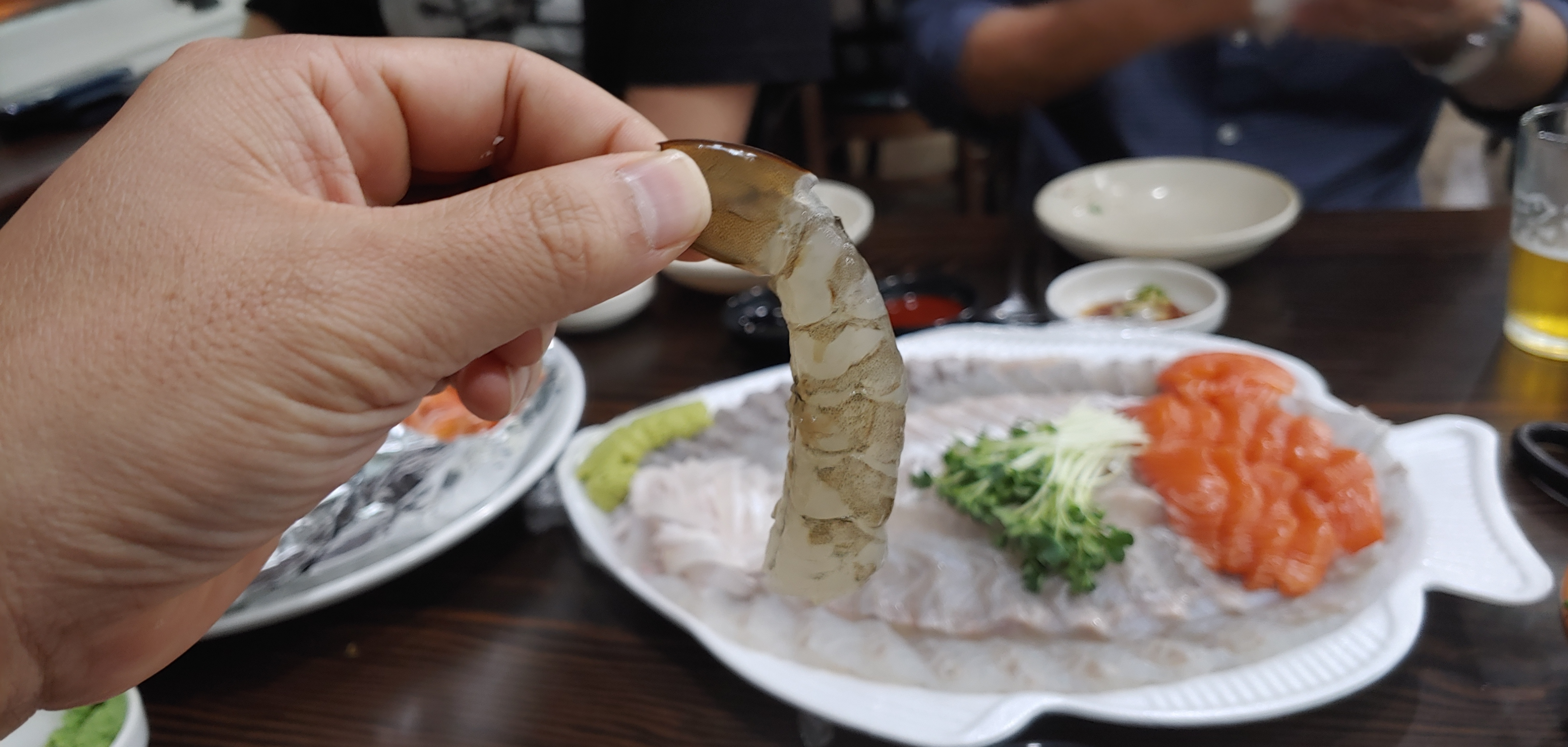 회도 다 나왔고 4개의 생새우 작업이 끝났다. 새우로 짠을 하고 즐거운 시식 시간이 되었다. 통통하고 탄력있는 새우회 너무 맛있었다. 고생한 보람이 있었던 것 같다.