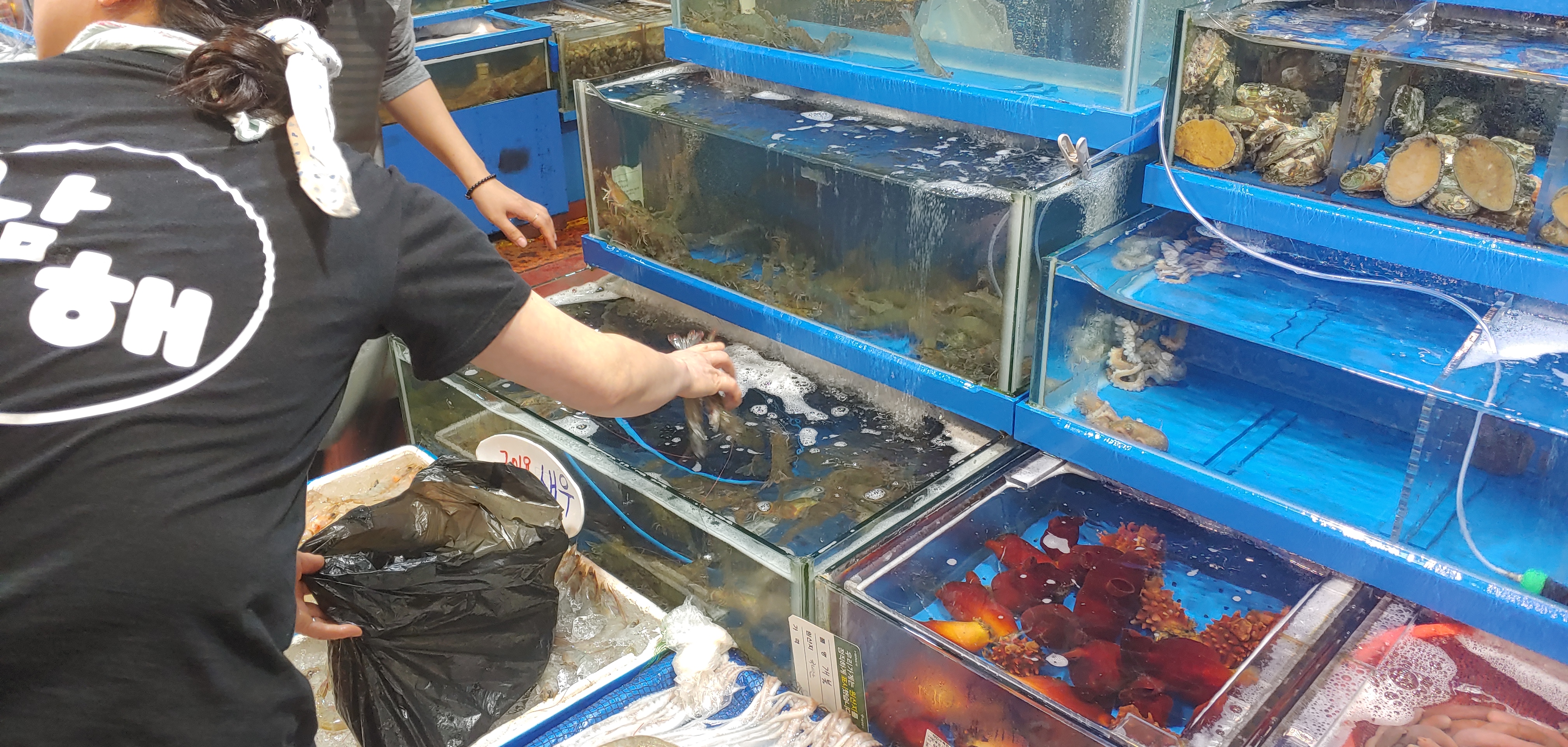 택시를 잡고 갔는데, 가는 길이 생각보다 쫍고 차가 막혔다. 너무 배고파서 상대적으로 느꼈던 것 같다. 아무 생각 없이 수산시장에 들어가니 아니라 다를까 엄청나게 호객행위가 있었다. 그래서 우리들은 저 멀리를 손가락질 하면서 쭉 지나가다가 밖으로 우선 나갔다. 인터넷을 뒤져서 가게 이름하나를 발견하고 그 쪽으로 가기로 했다.