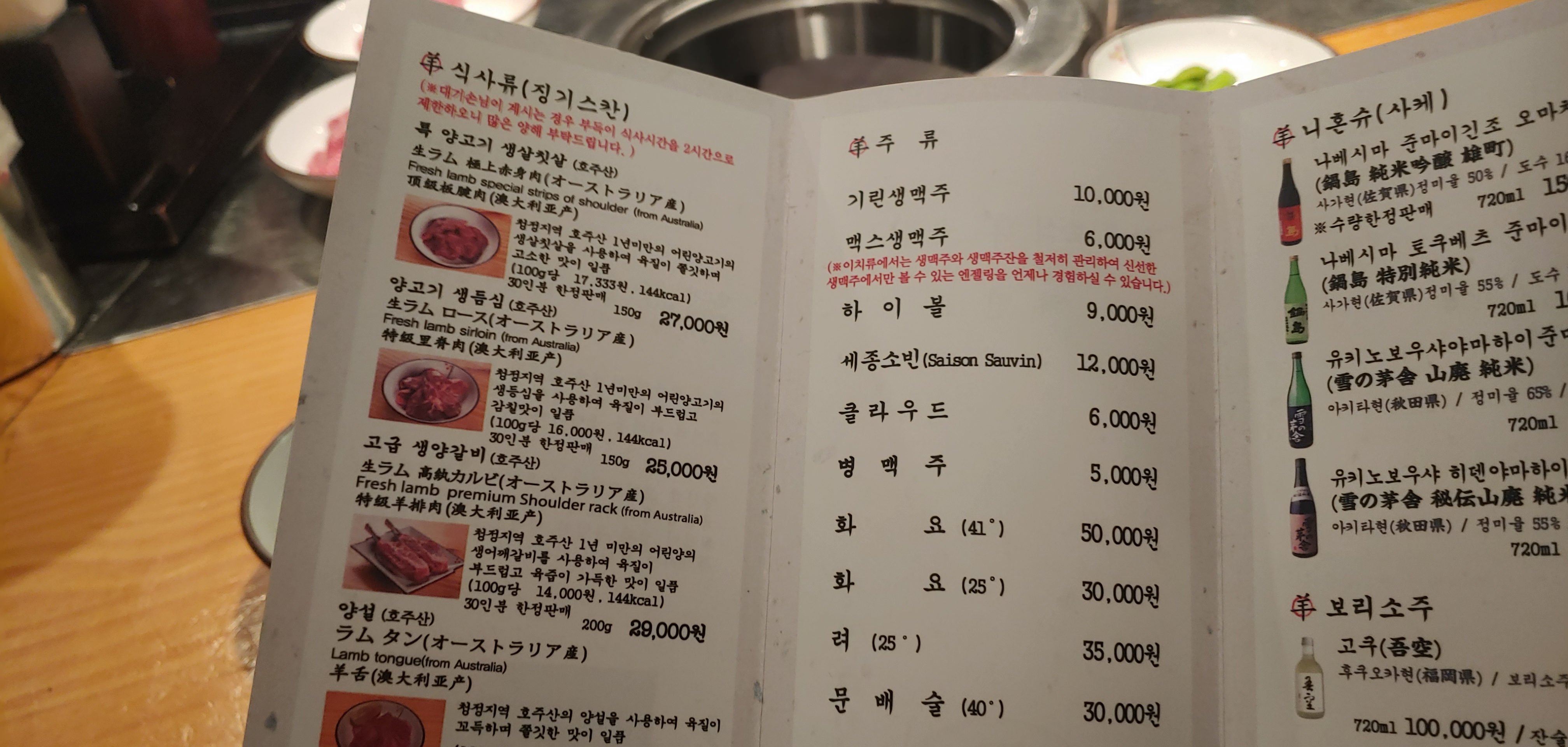 엄청 유명하고 맛 집이라고 소문이 나서 굉장히 기대 했었다. 우선 가격이 비싼 가게이다. 원래 양고기가 비싼지는 모르겠다만 2명이 3인분에 맥주 한잔을 마셨는데 10만원이 넘게 나왔다. 가격이 맘에 들지 않았다. 추가로 소스가 없이 소금을 찍어 먹으면 맛이 약간 나지 않는다. 양고기의 향을 없앤 만큼 먼가 고유의 맛을 없앤 느낌이다. 대신 소스랑 같이 먹으면 맛이 확 올라간다. 몇가지 아쉽기는 하지만, 분위기도 상당히 좋고 서비스도 좋은 편에 속하는 가게이다.