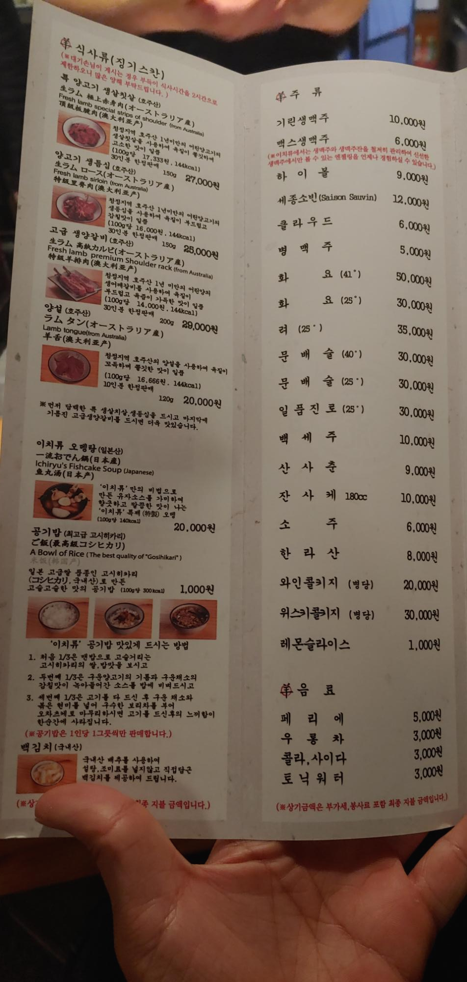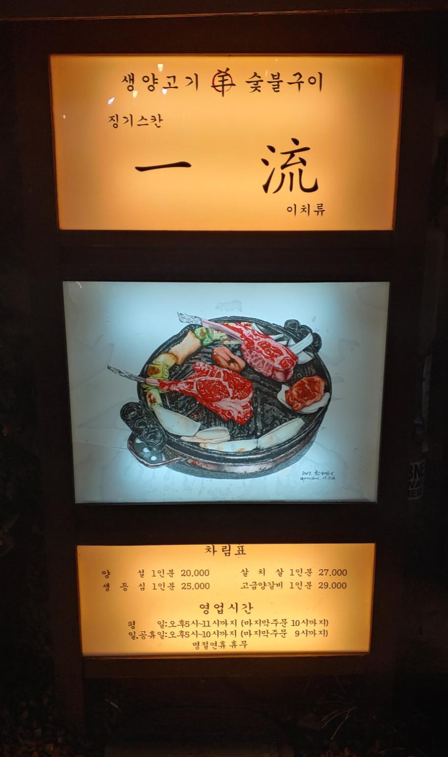고기는 먹고 싶고 다이어트는 하고 싶었다. 그래서 고민을 해보니 상대적으로 칼로리가 낮고 기름기가 적은 것으로 추정되는 양고기를 먹기로 했다. 검색 도중에 분위기도 좋고 맛도 좋다고 소문난 이치류에 가보기로 했다.