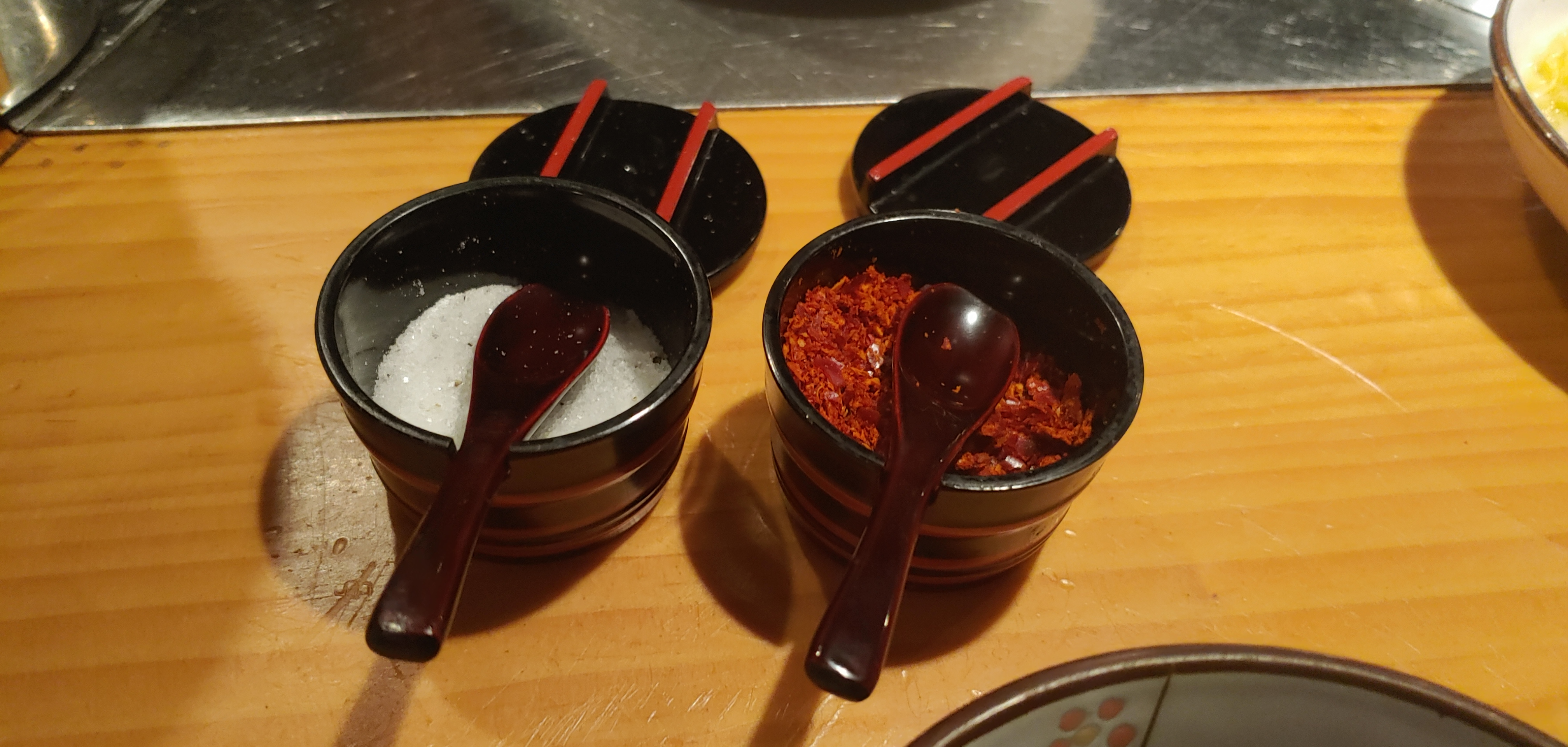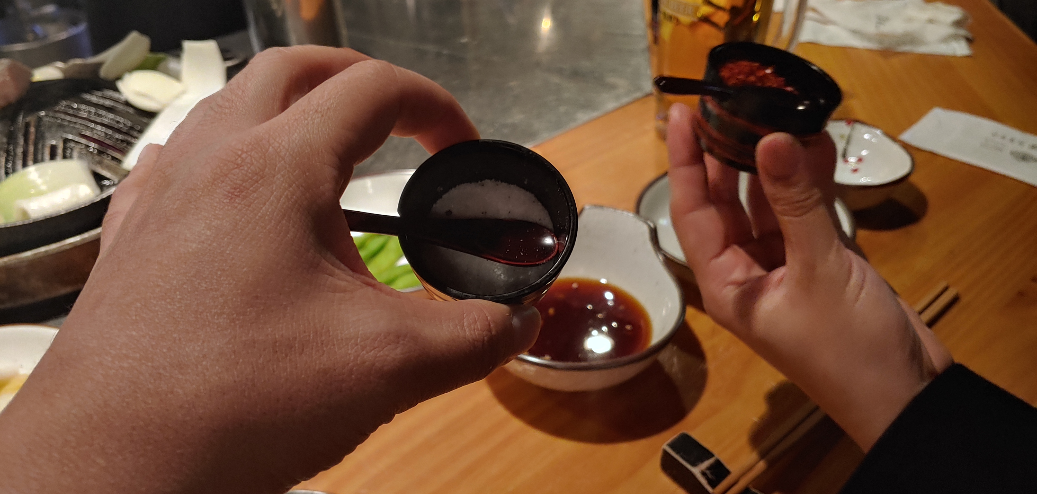 딱 필요한 것만 세팅해준다. 간장 소스를 찍어 먹고 소금과 고추가루도 따로준다. 간장소스로 찍어먹다가 나중에 밥이랑 같이 비벼 먹으라고 한다.