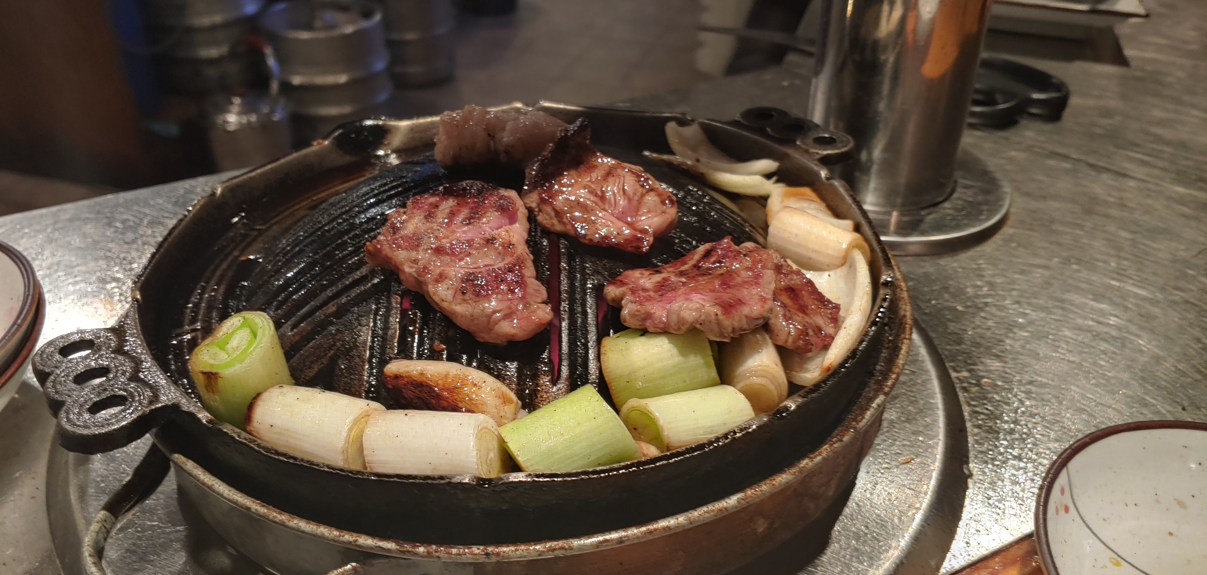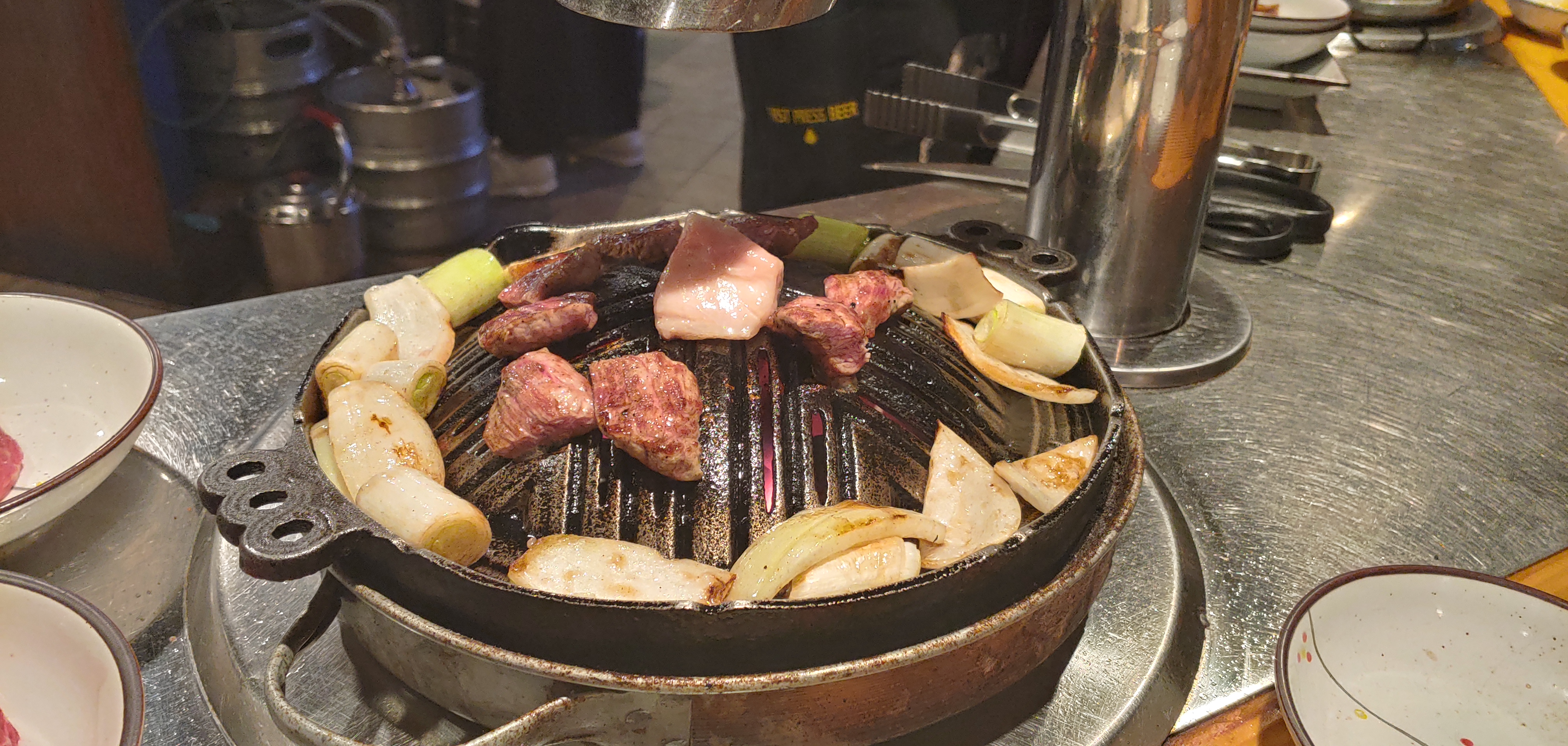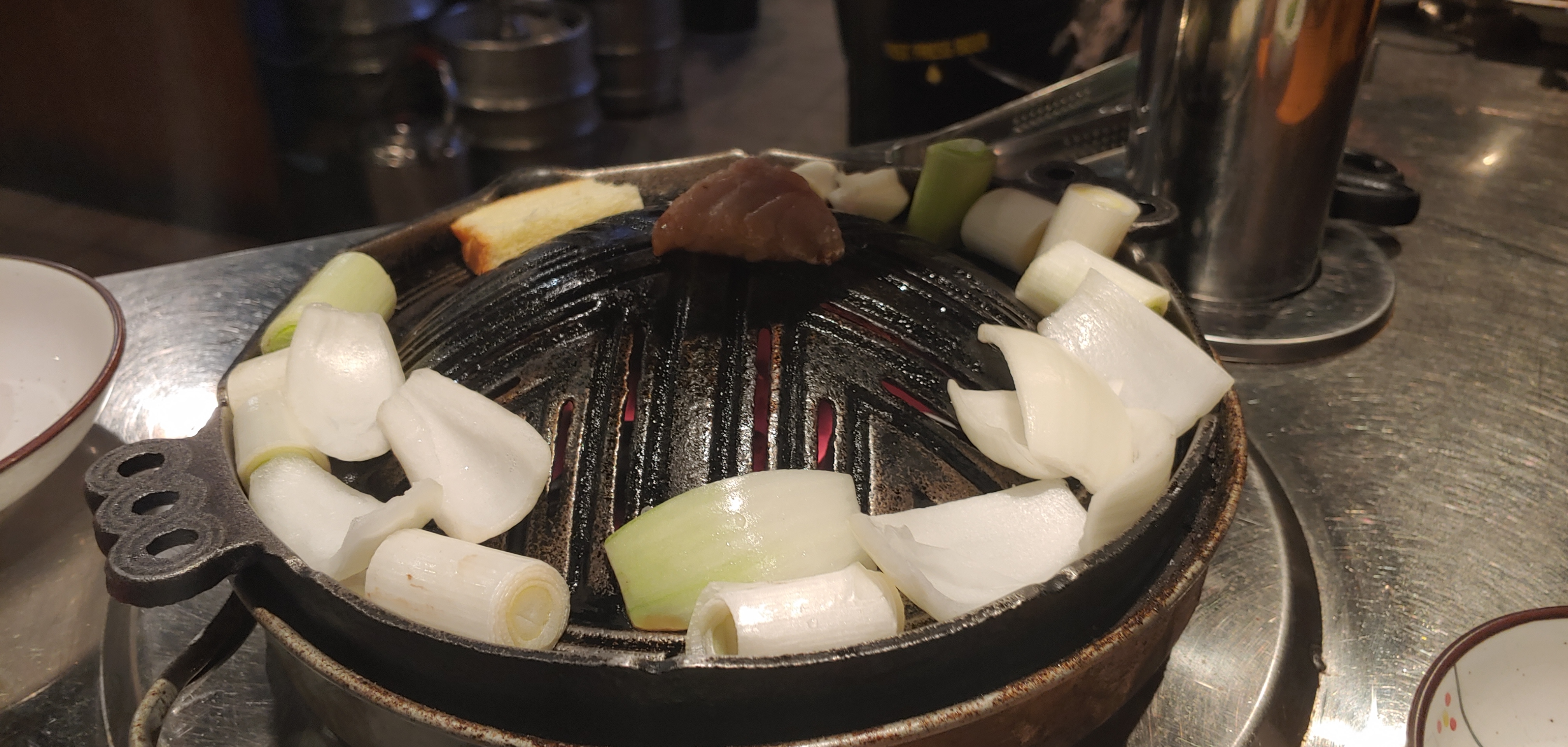 그릴 위에 양파와 파를 올려 같이 구워주는데, 끝까지 계속 준다. 파가 엄청 맛있다.