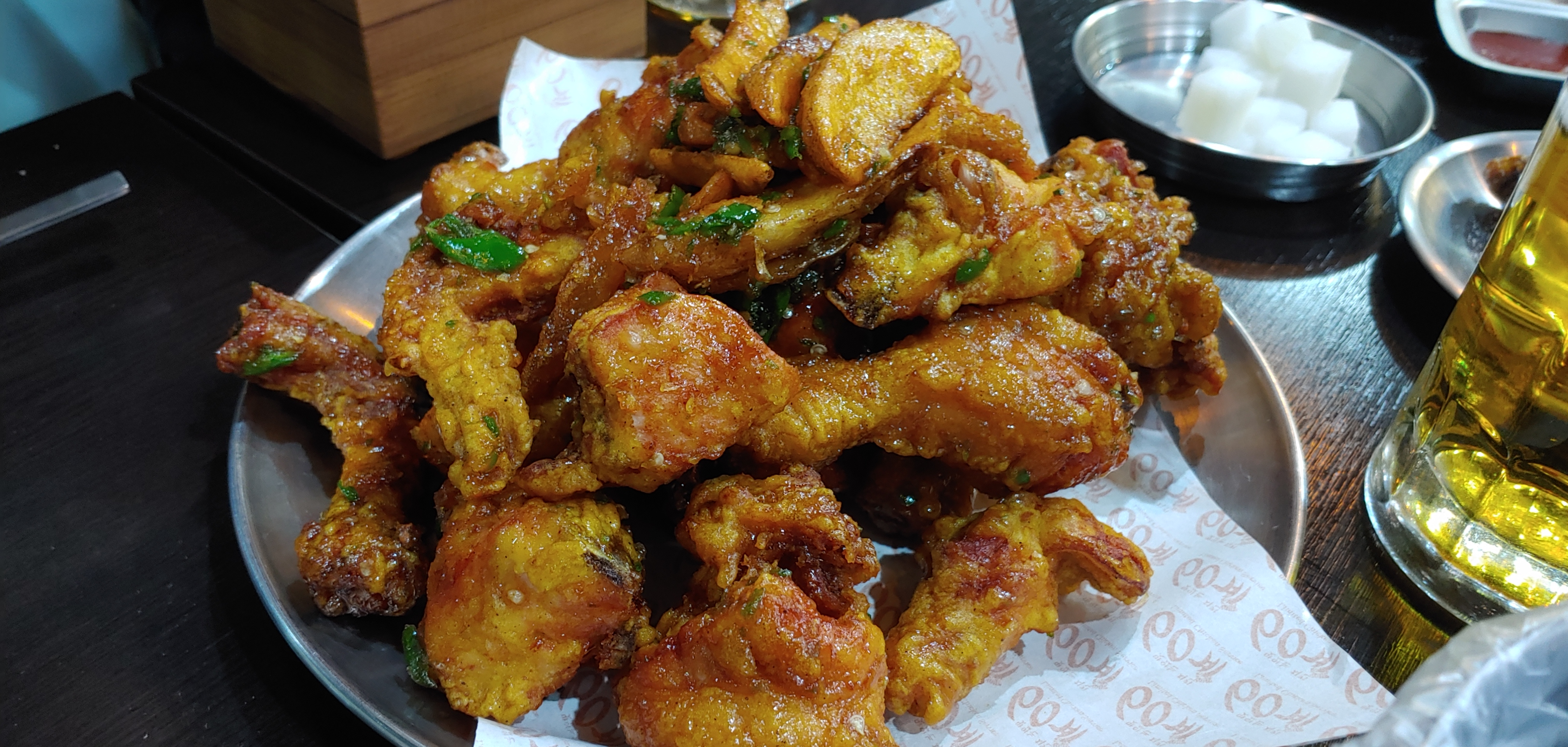 이 집의 시그니처라는 간장 치킨에 누룽지 가루를 뿌린 치킨. 그냥 머 다른 집과 큰 차이가 없다.