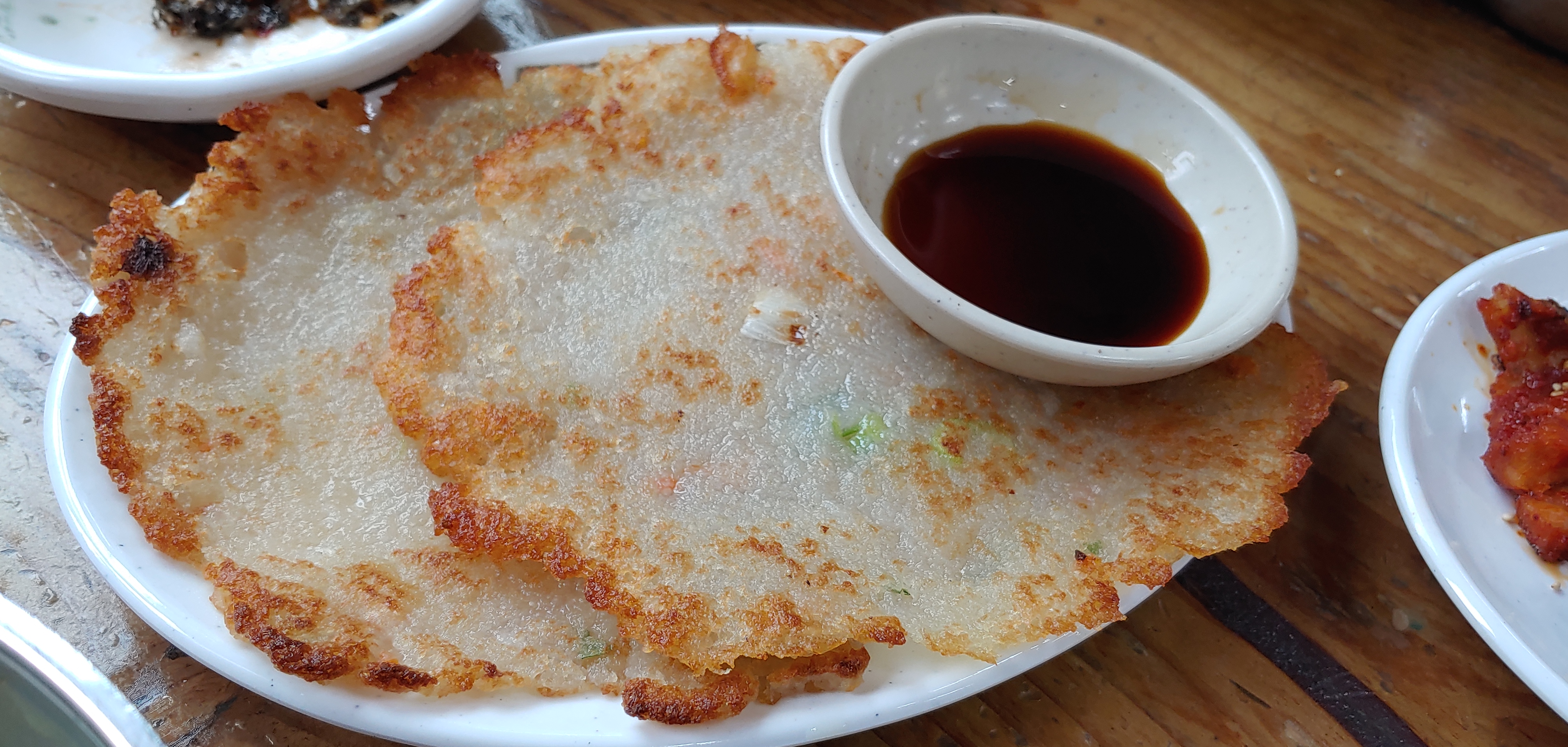 좀 많이 시키긴 했다. 많이 먹는 타입이긴 한데 반찬도 다시 떠 먹고 황태구이랑 국밥까지 먹었더니 배가 불렀다. 남자 2명이면 가능해 보이는데, 남녀 2명이 먹기는 약간 빡세다. 5천원에 전 하나만 팔았다면 많은 사람들이 시켰을 것 같다. 주위를 보면 단체 손님이 아닌 이상 시키지는 않을 것 같다. 그래도 끝부분을 바삭바삭 맛있게 만들어 주심.