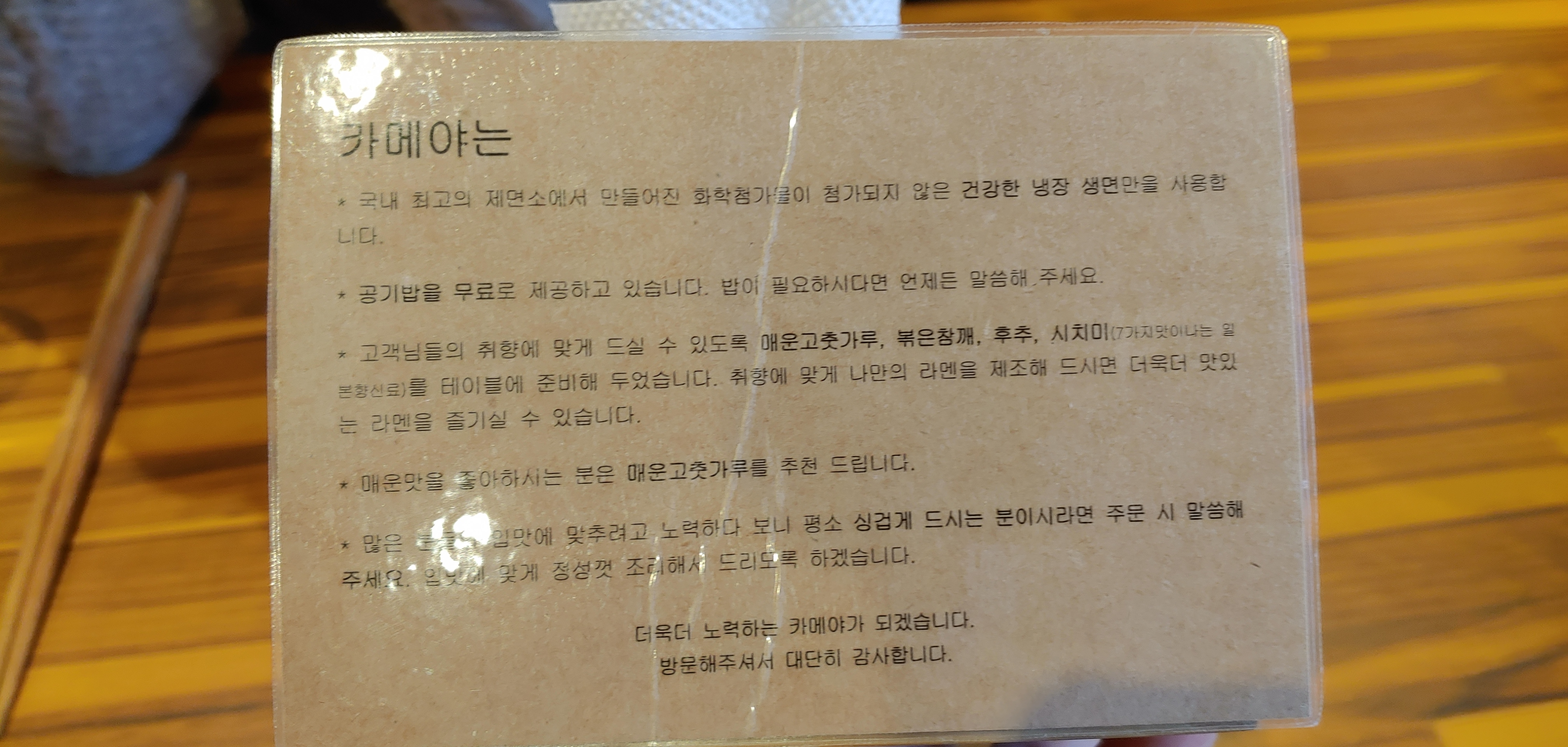 라멘을 기다리는 동안 테이블 위를 보니, 생면을 강조하는 문구가 눈에 보였다. 공기 밥도 무료로 준다고 한다. 다이어트를 한다고 가게에 들어오면서 했던 것이 후회스러웠다. 내일이 2020년인데 내년부터 해도 되지 않나?라는 악마의 속사임이 귀에 맴돌았다.
