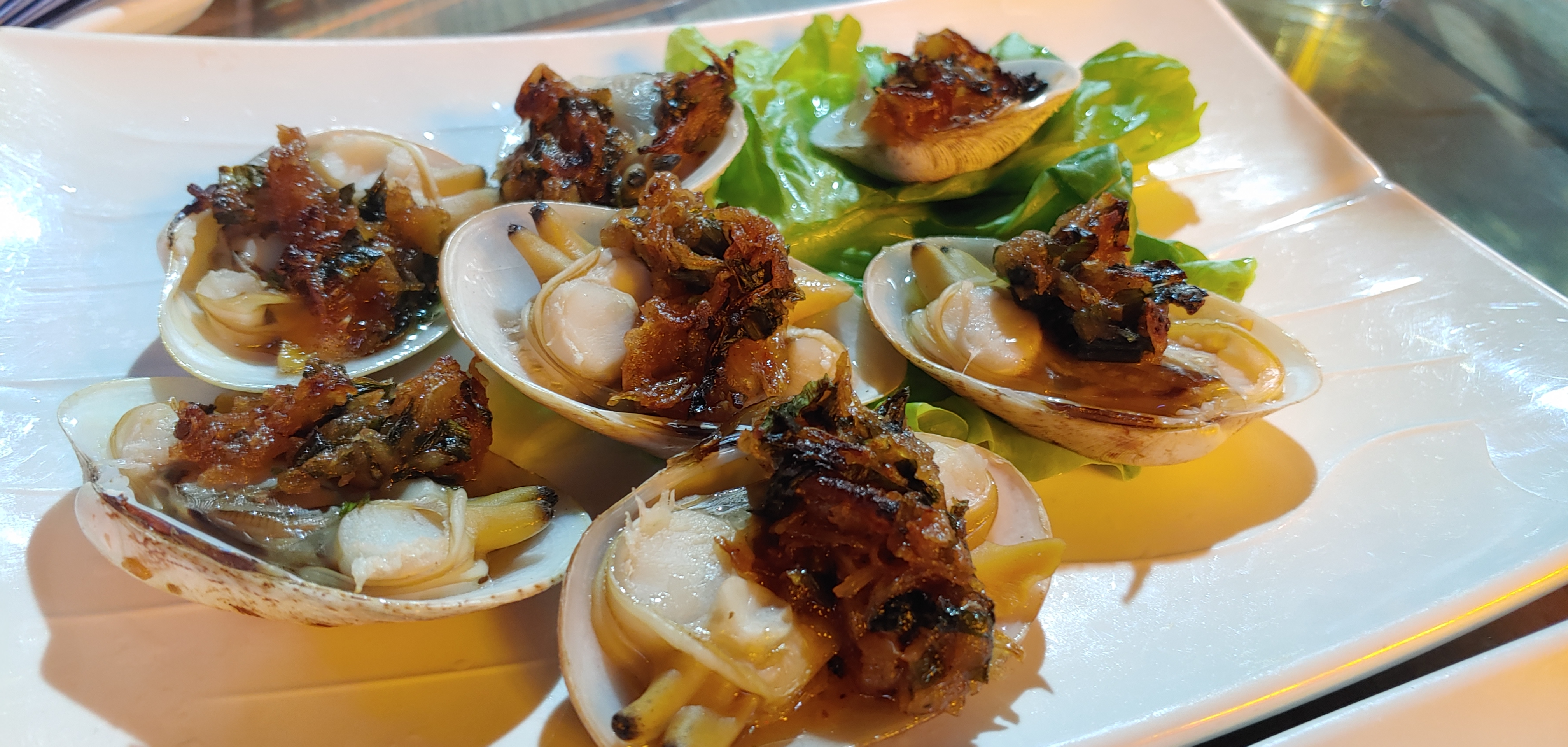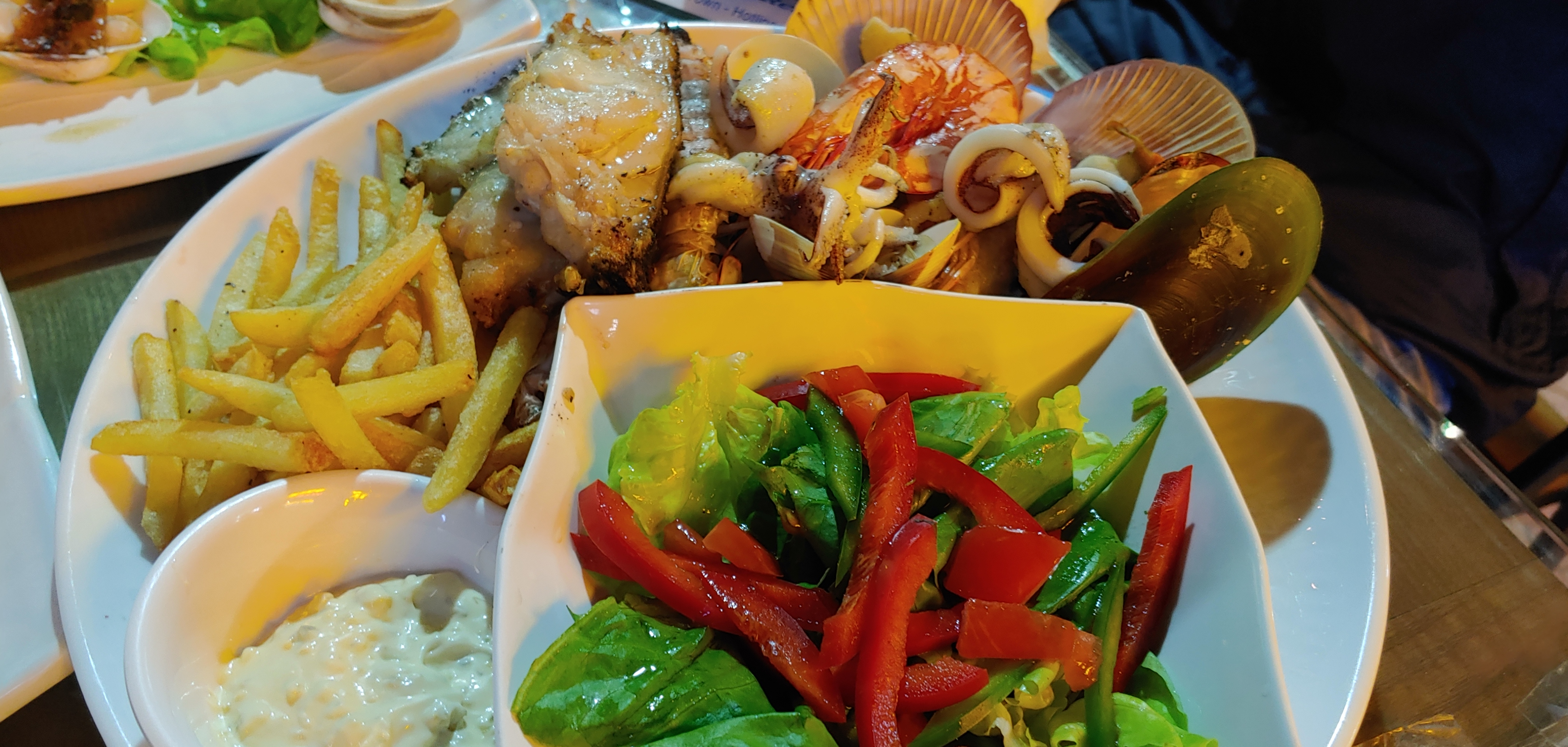 다양한 해산물이 있는 접시. 종류도 많고 바닷가여서 싱싱하겠다만 그다지 막 맛있다고는 못 느껴진다.