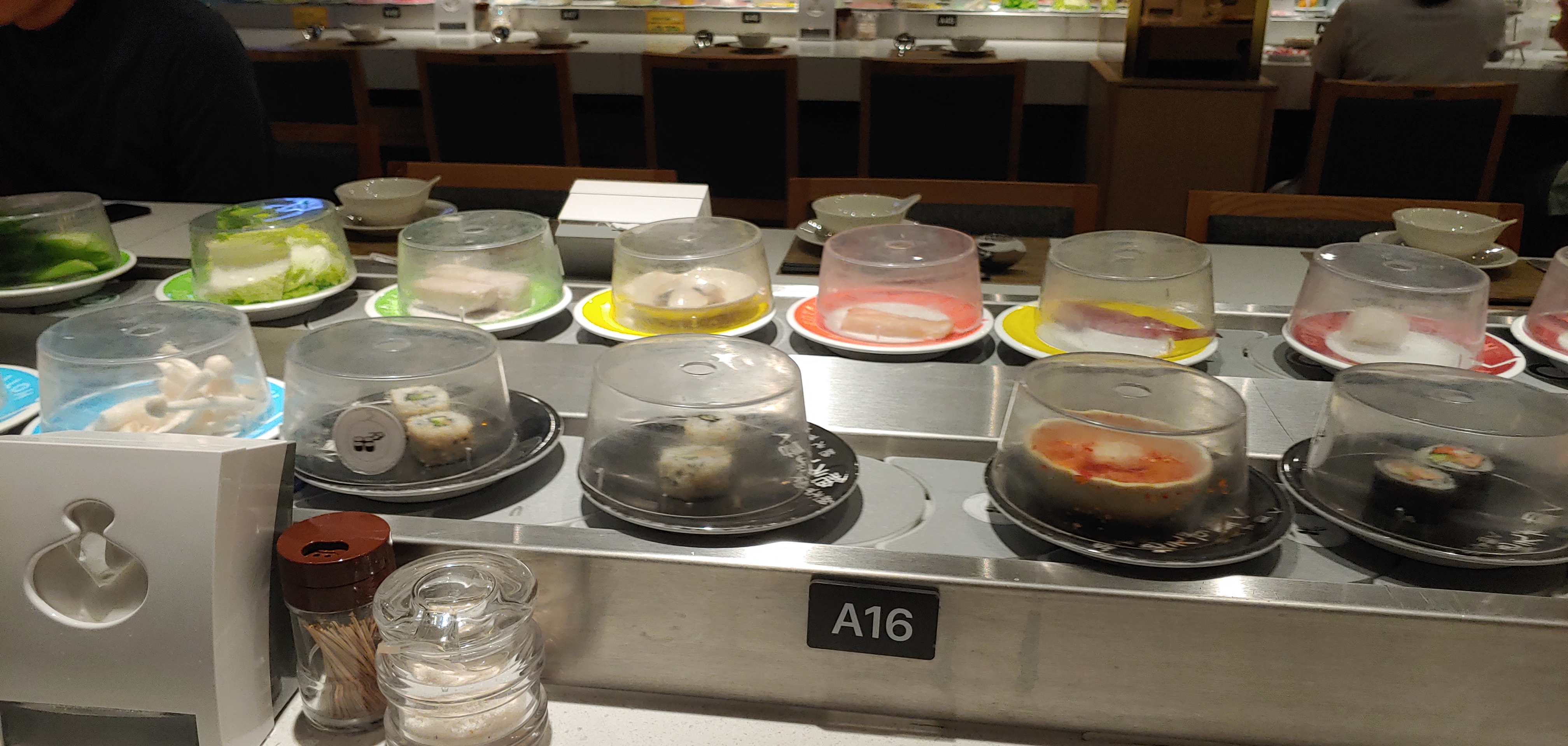 저렇게 돌아가는 음식을 먹고 싶은 것을 고르면 된다. 근데 엄청 빠르다. 진짜 표현할 수 없을 정도로 정신이 없다. 짜증이 난다. 그냥 조용히 먹고 싶은데 힘들다.