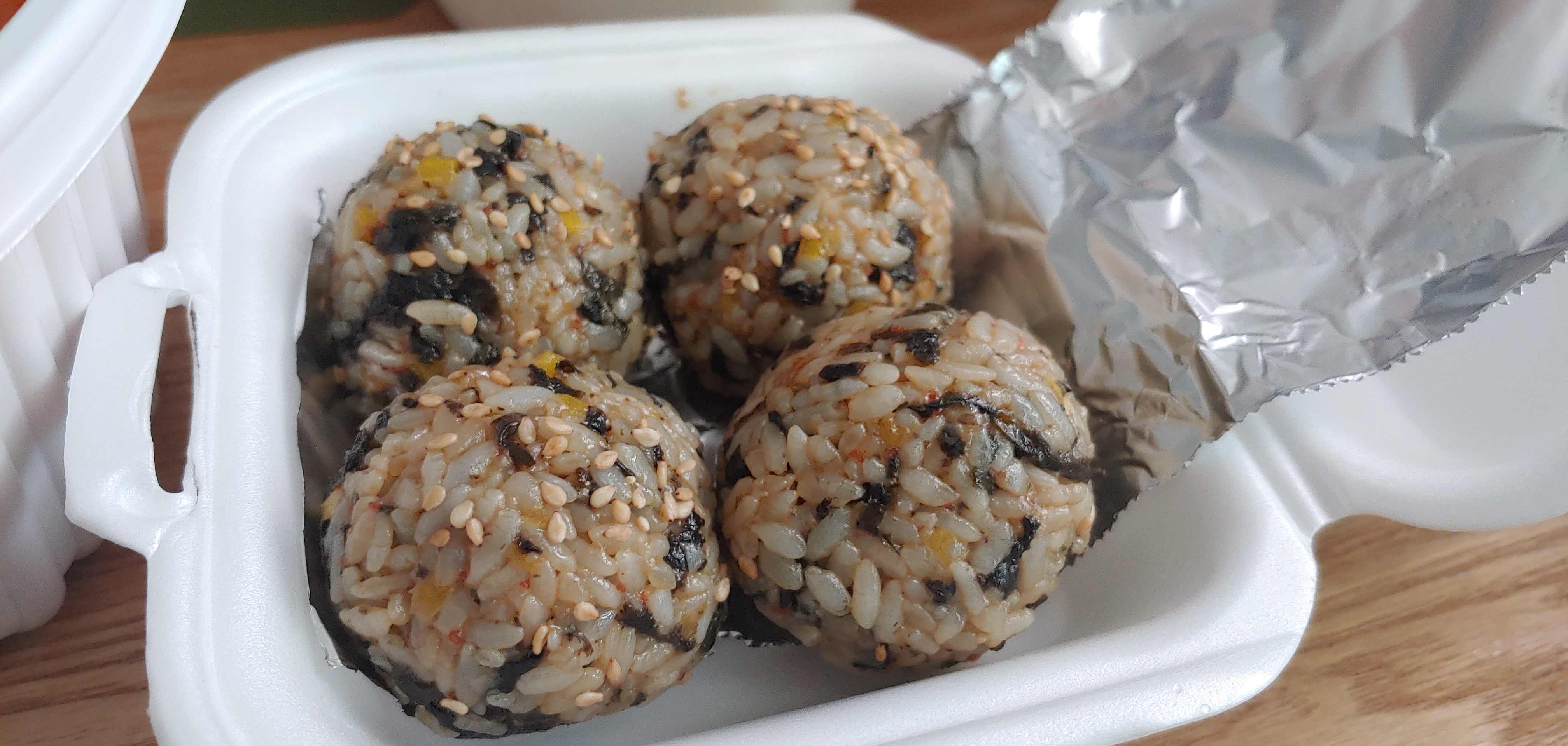 생각보다 맛이 있었던 주먹밥. 그냥 흰밥에 먹는 느낌이 아니라 건강한? 밥에 다른 조미료가 맛있게 가미된 맛이었다.