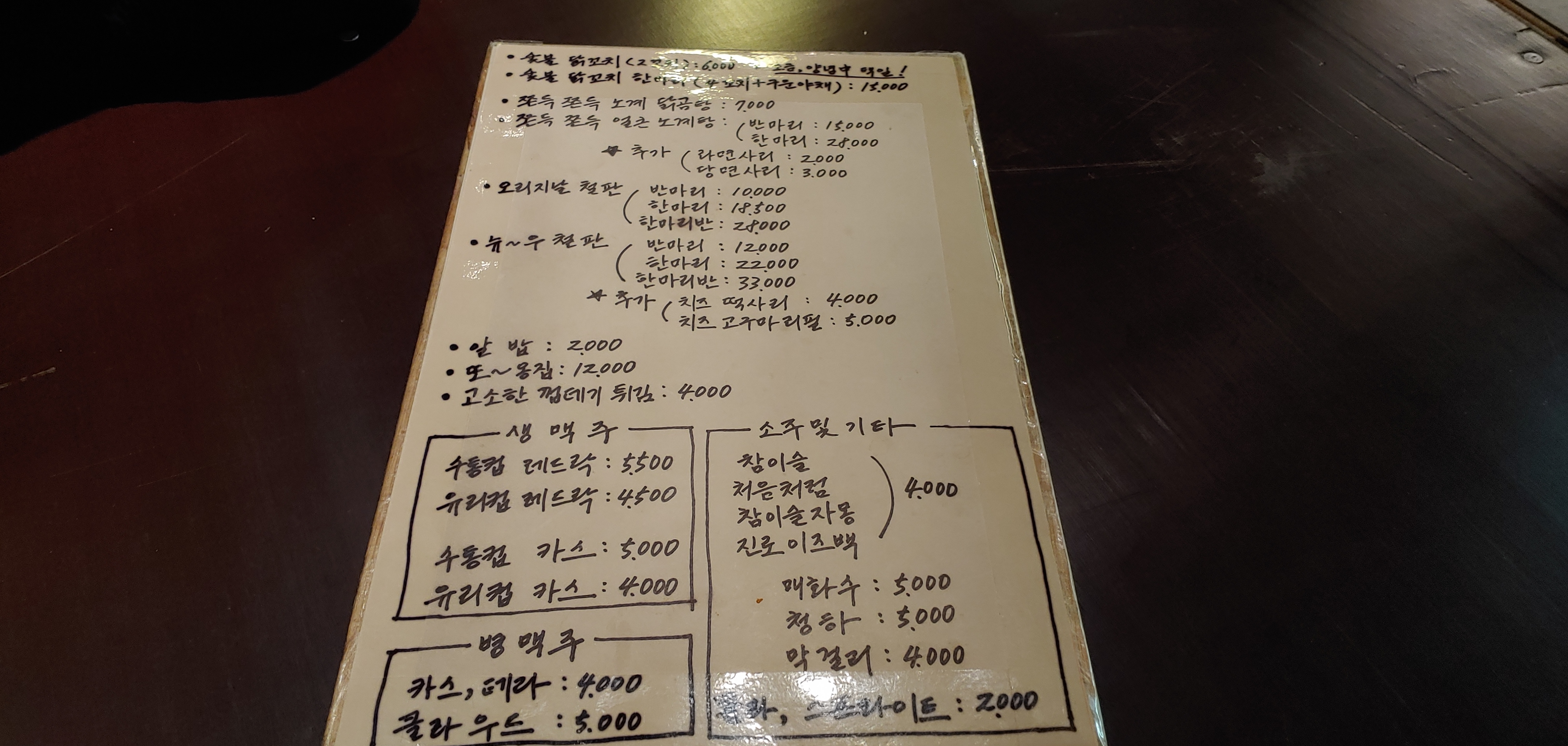 가격은 솔직히 기억이 안나지만 메뉴는 그대로 인 것 같다. 당연히 치즈가 들어간 뉴~우 철판으로 시켰다. 술도 수통컵으로 친구는 시켰지만, 나는 금주 기간인 만큼 사이다로.....