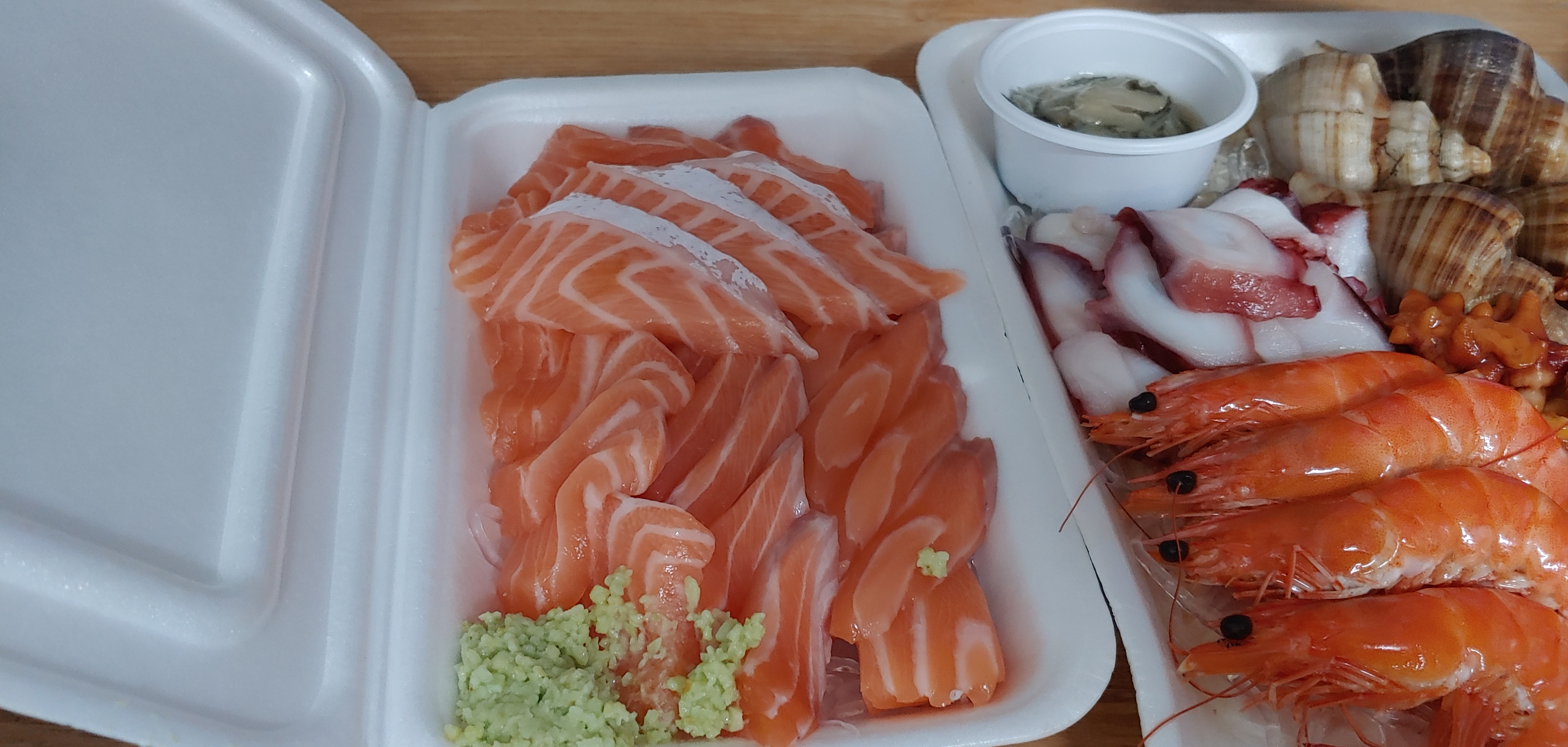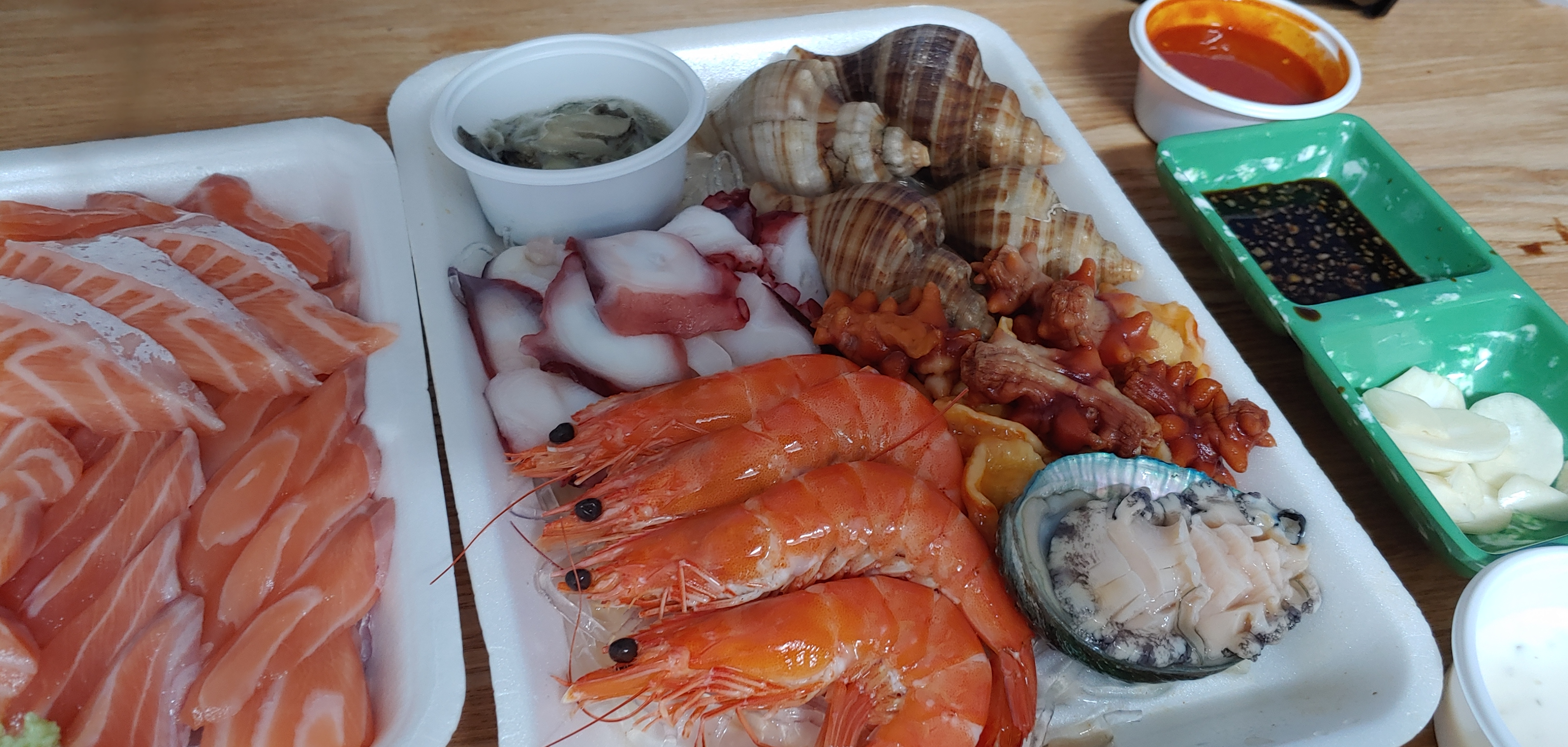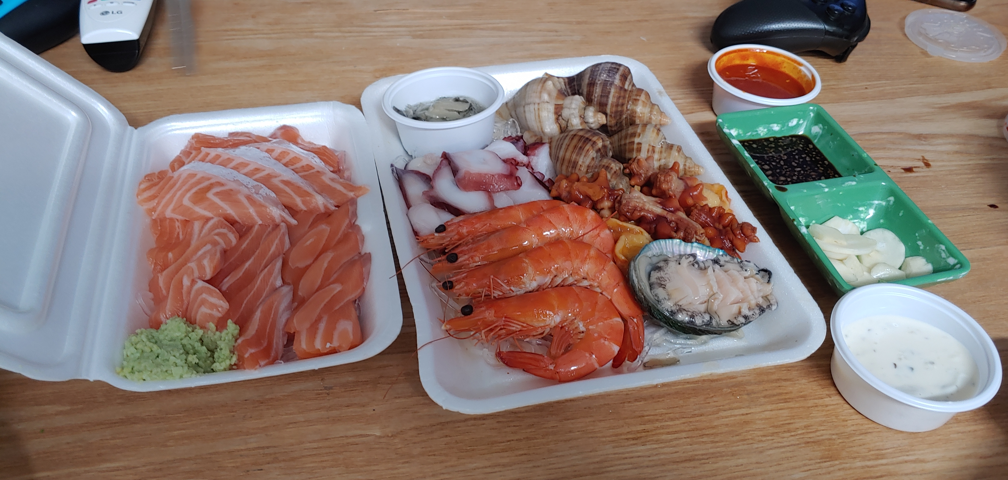 연어 모듬에 머가 있었나 찾아보니 각종 해산물이 같이 오는 세트였다. 얼마전에 다이소에서 산 양념장 그릇을 오늘 쓸 수 있었다. 나름 가게의 분위기가 난다 ㅋㅋㅋ