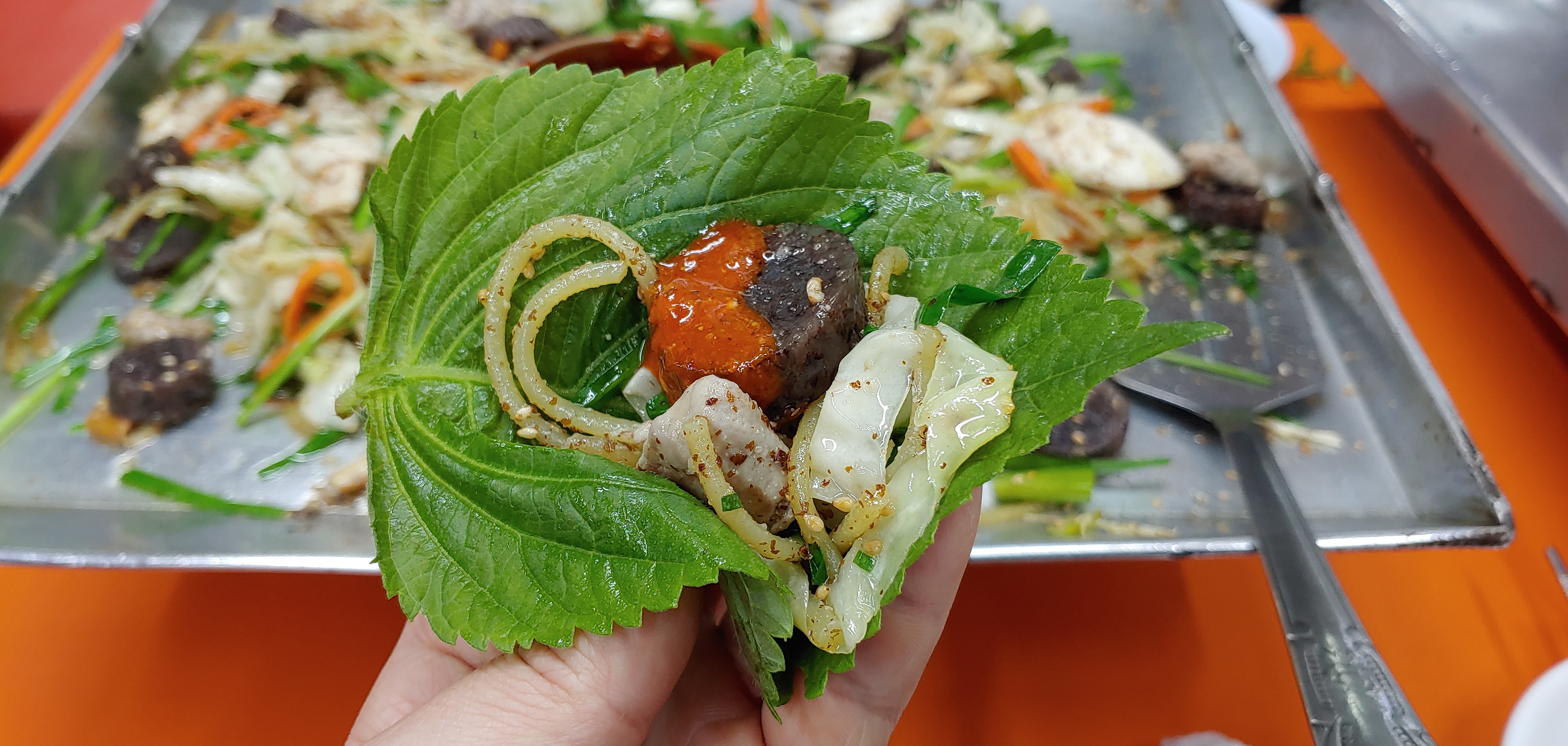 마늘이 없어서 아쉬웠지만, 깻잎에 볶은 당면 양배추와 곱창 순대를 넣고, 만들어주신 쌈장에 싸먹으면 된다~!