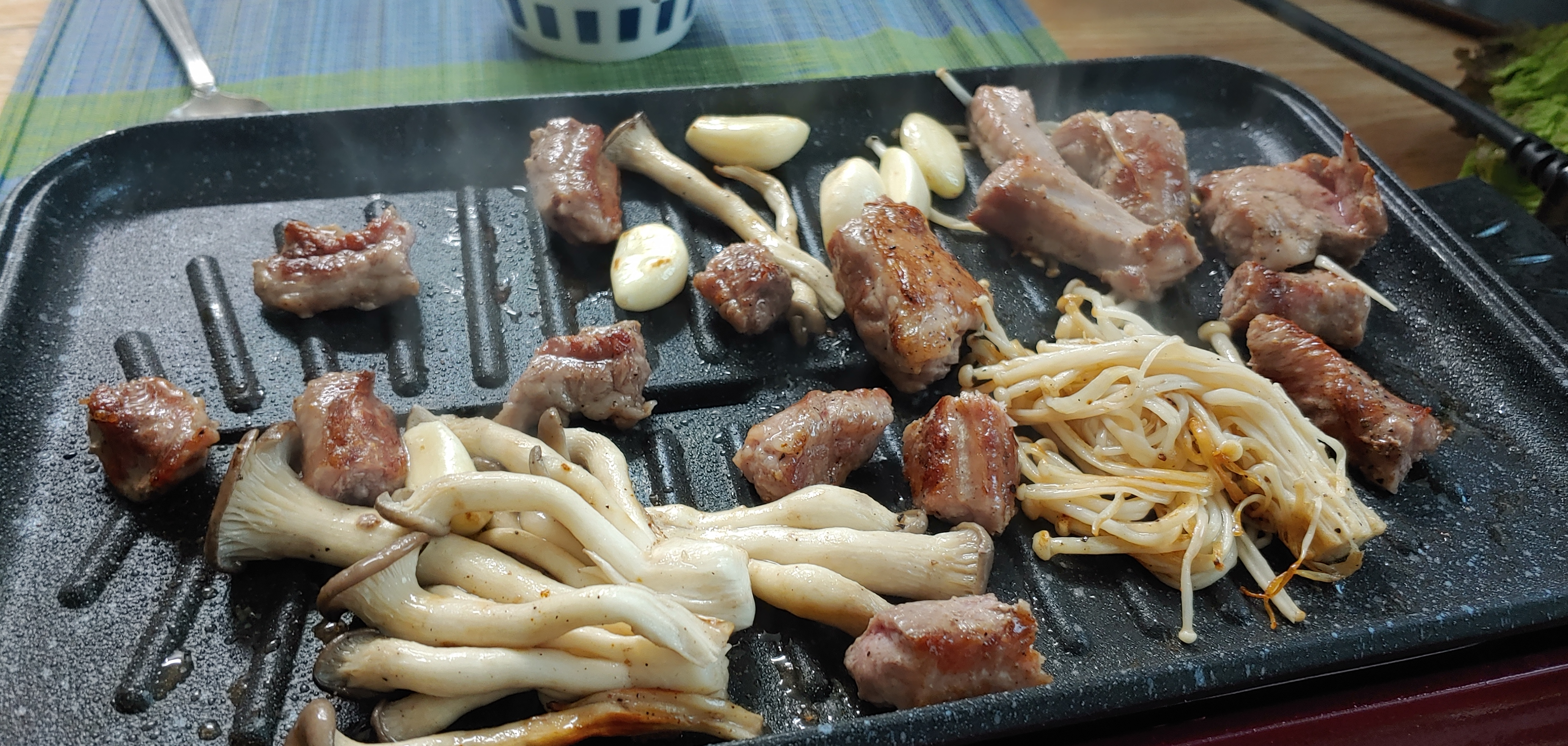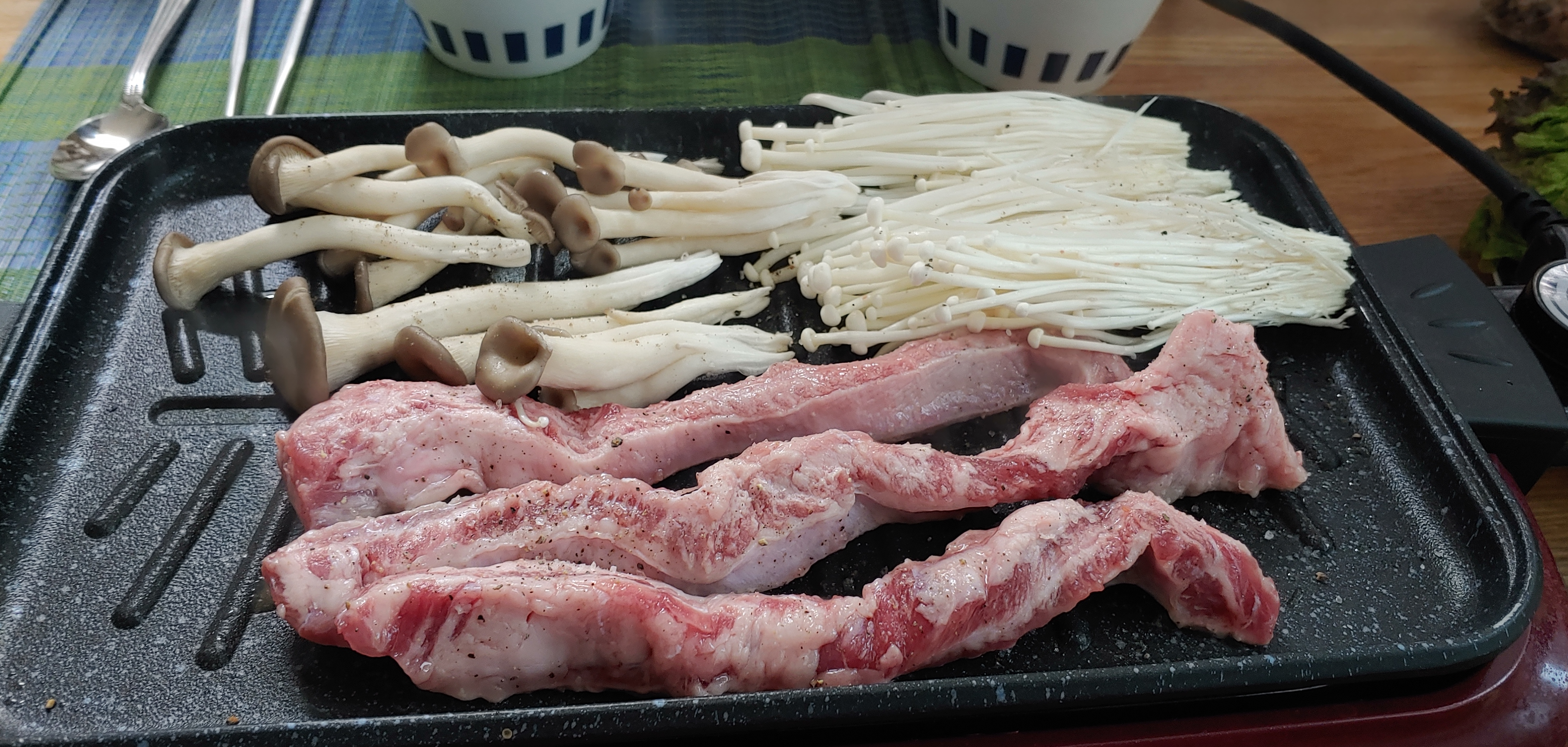 2. 고기에서 나온 기름으로 버섯과 마늘도 굽는다.