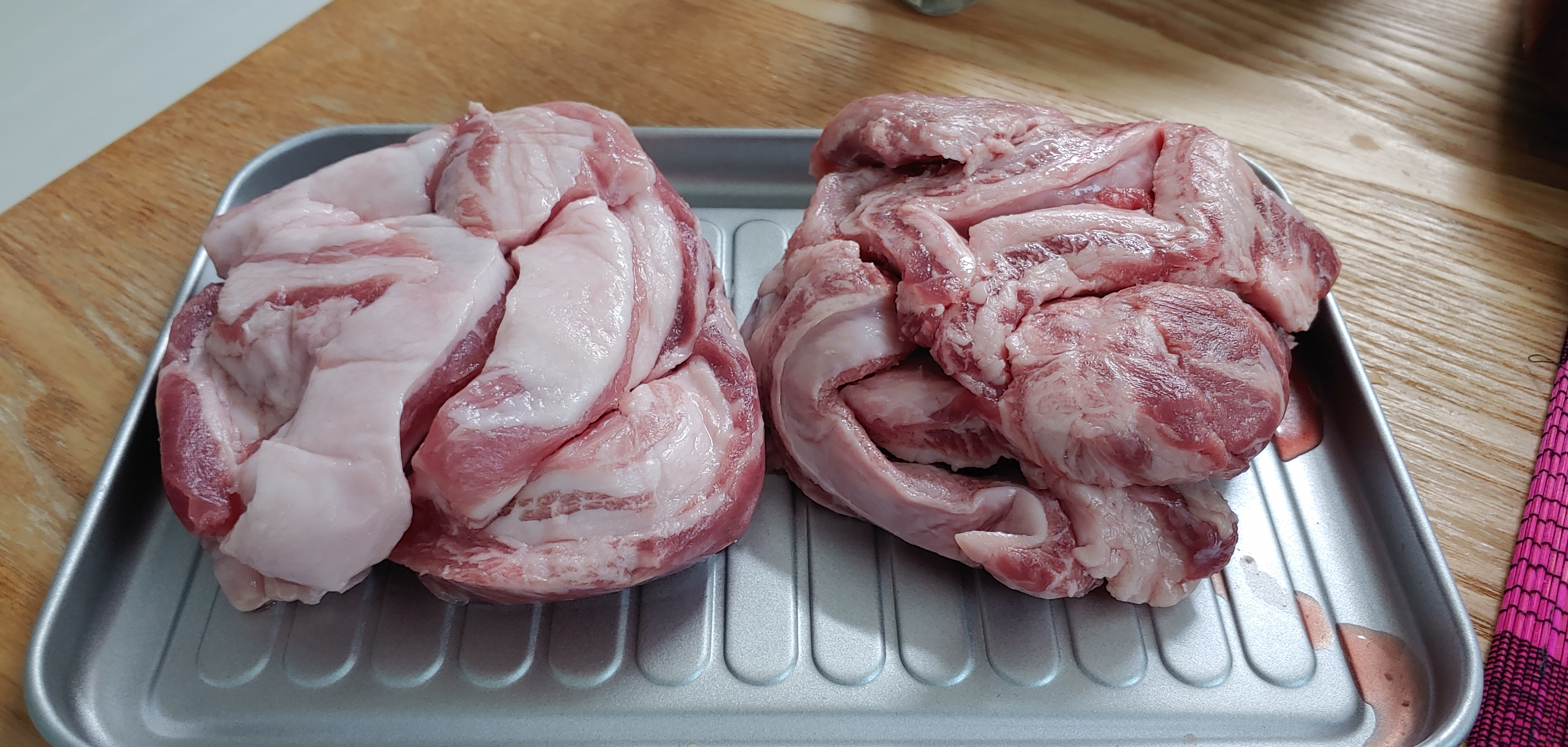 한국 돼지고기와 다른게 좀 기름과 색이 선명해 보였다. 결도 다른 것 같았다.