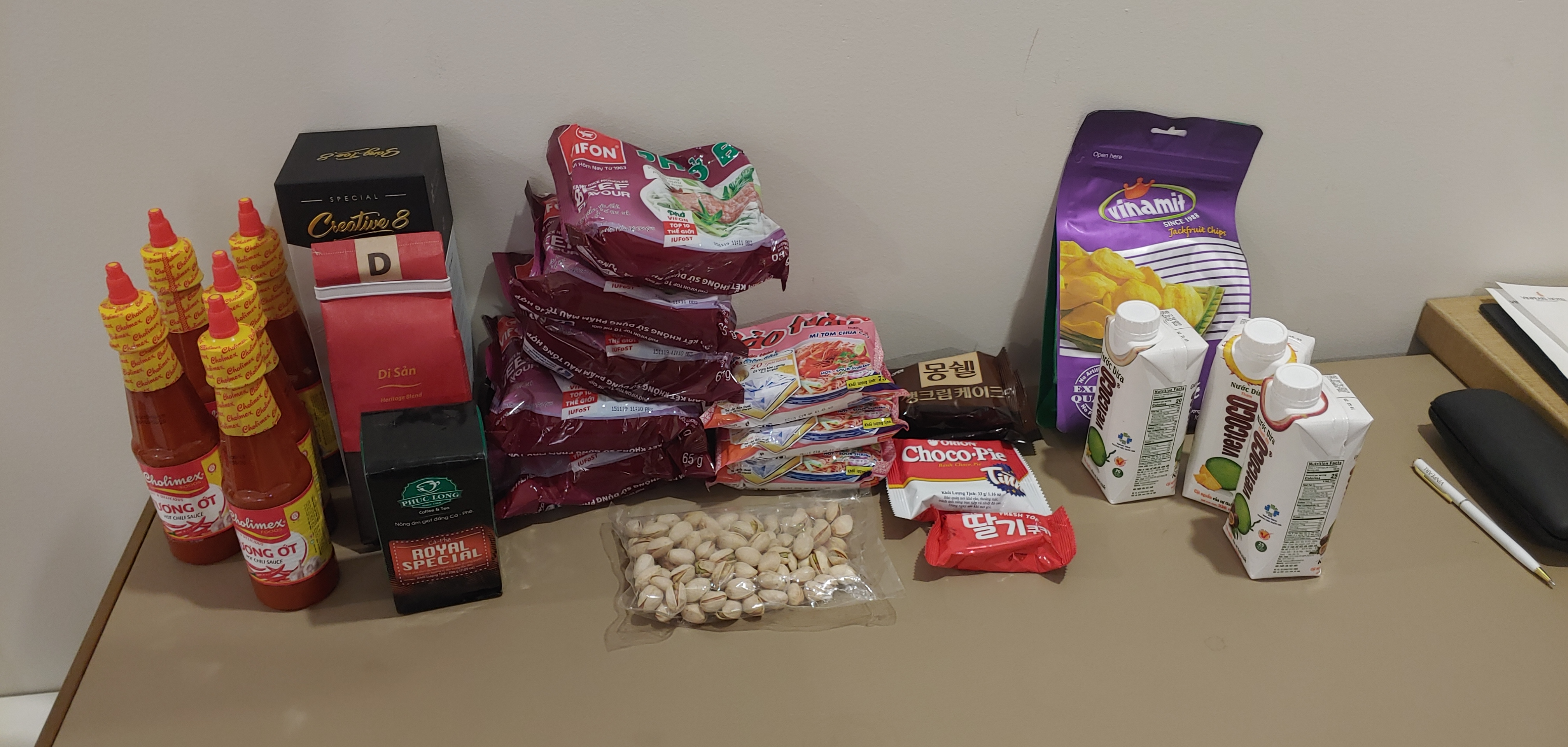 해장에 좋은 코코넛 워터도 사고, 안주 거리에 좋은 피스타치오도 샀다. 그리고 출장이 끝나고 한국으로 돌아가는 사람들이 남기고 가는 간식거리들이 계속 추가가 된다.