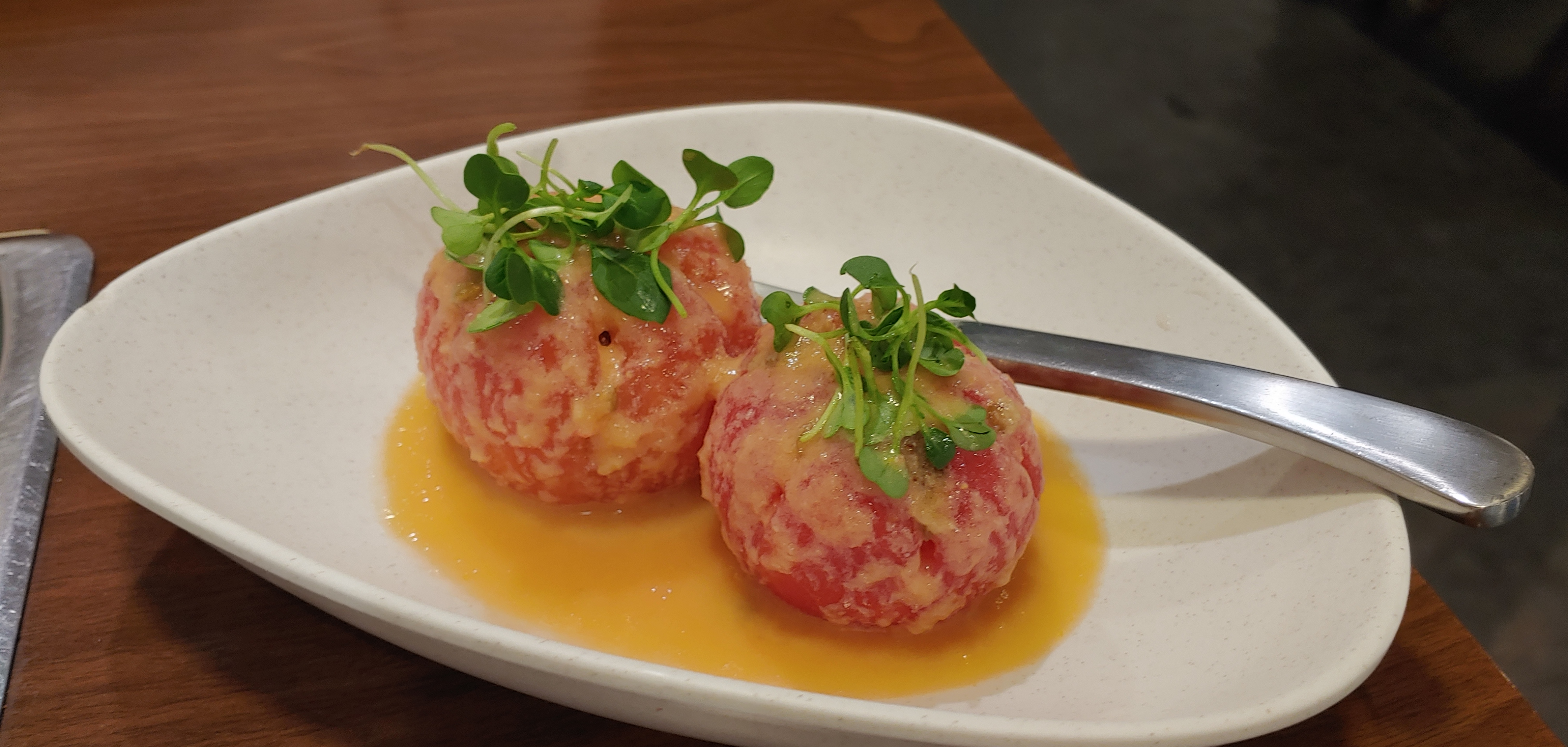 3명인데 2개가 나왔다. 쿨하게 하나 추가 했다. 머 별거는 아니고 시원한 토마토 안에 렌틸콩과 같이 먹는 샐러드이다. 깔끔하고 맛있다. 순삭. 이번 모임 10분 안에 끝나는 것이 아닐까 걱정이 되었다.