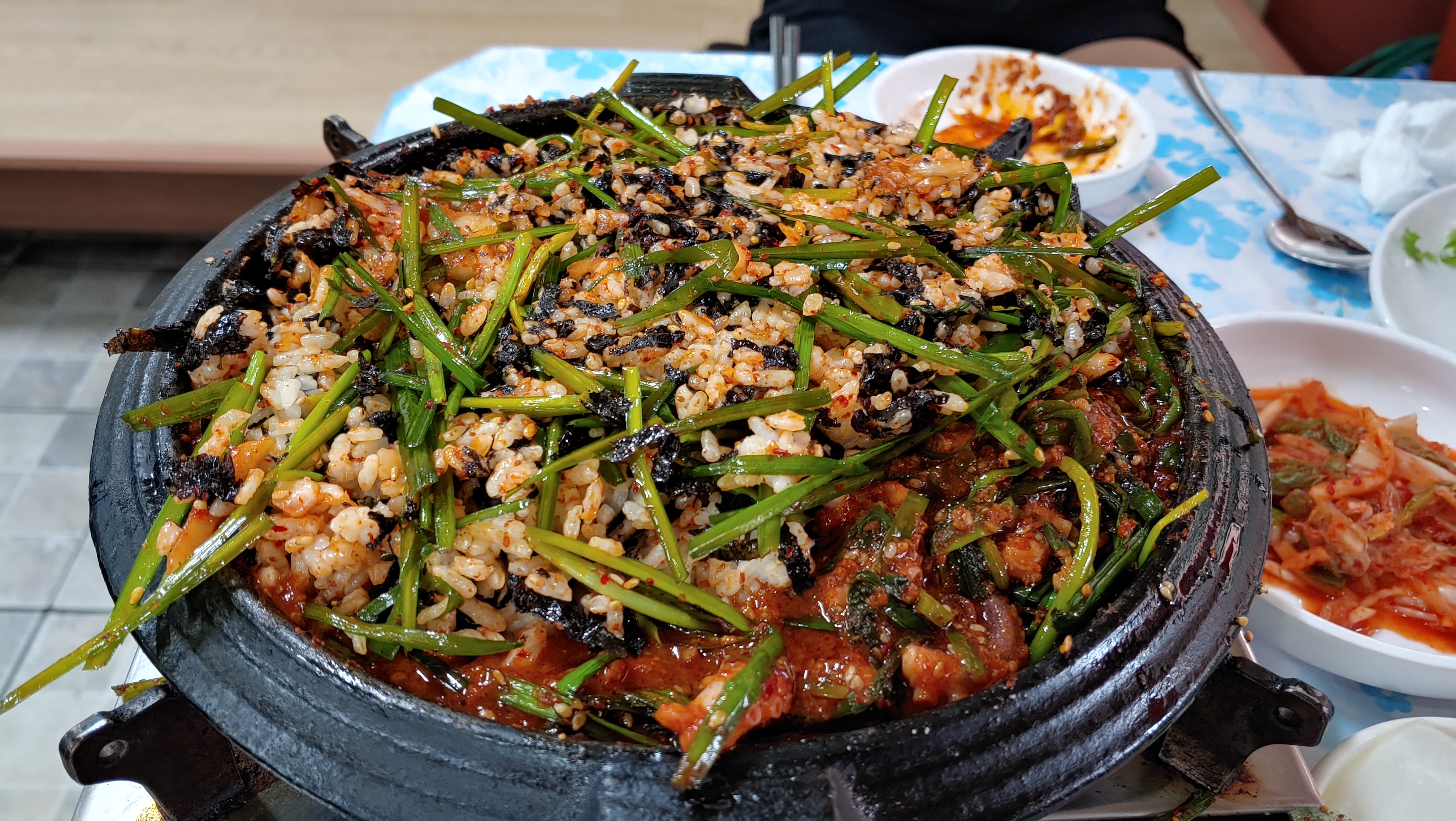 진짜 수북히 쌓여 있는 부추가 상큼하게 충격으로 다가왔다. 아 진짜 먼가 건강할 것 같기도 하고 맛도 있을 것 같다. 내가 좋아하는 조합을 다 갖췄다. 맵지만 않기를 바랬는데, 맵지도 않고 딱 먹을만했다. 참고로 저는 맵찔이 입니다.