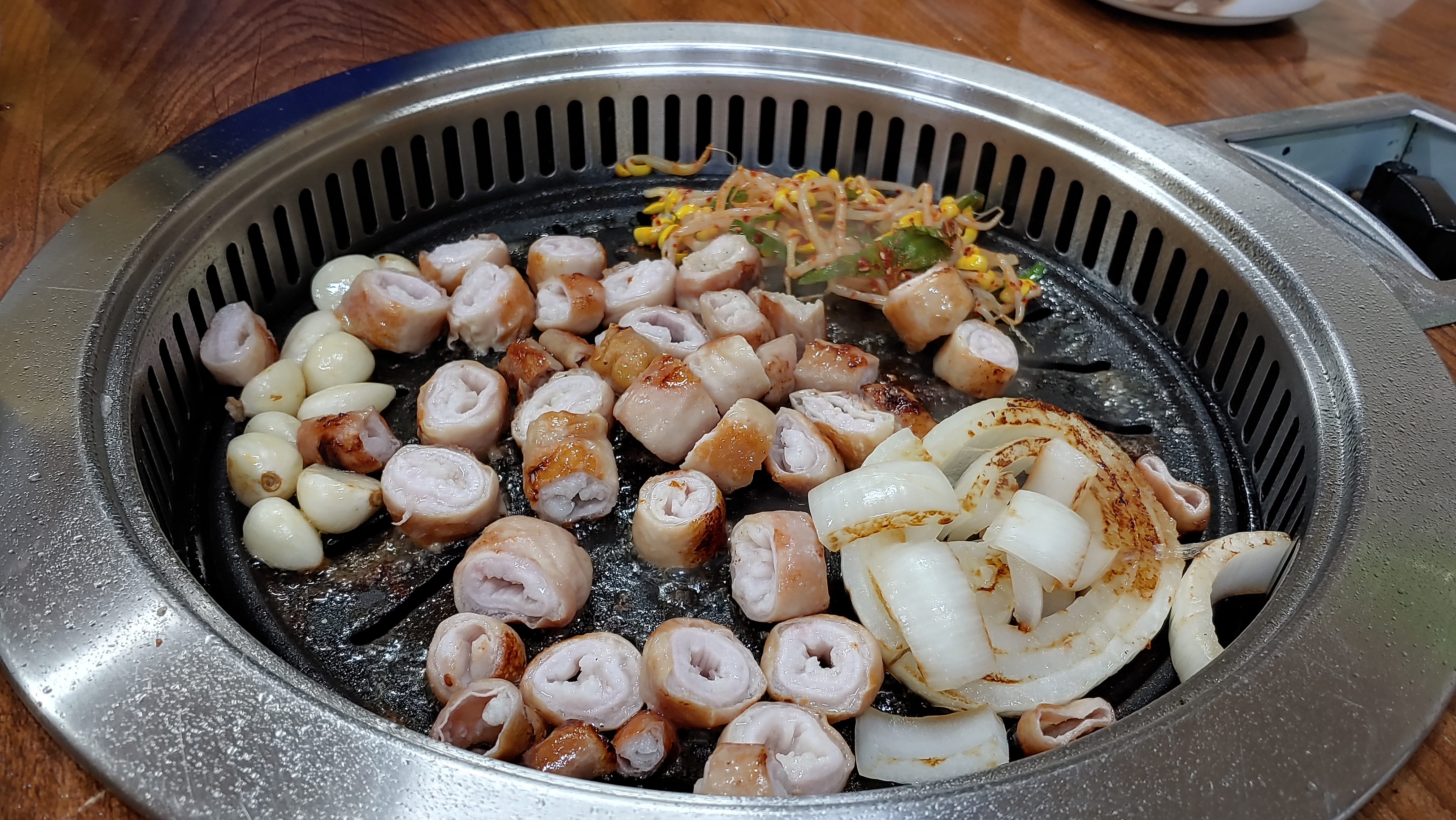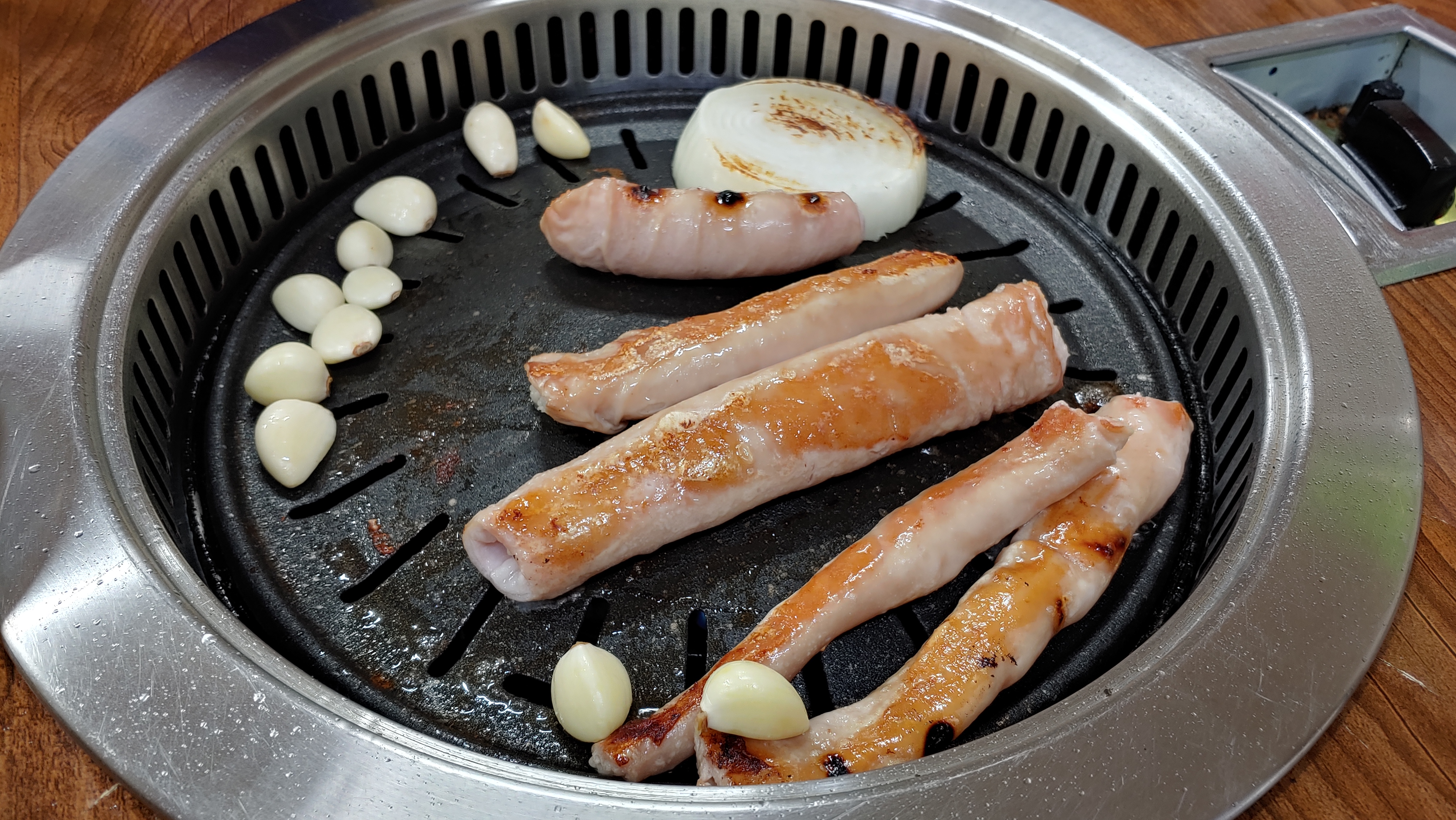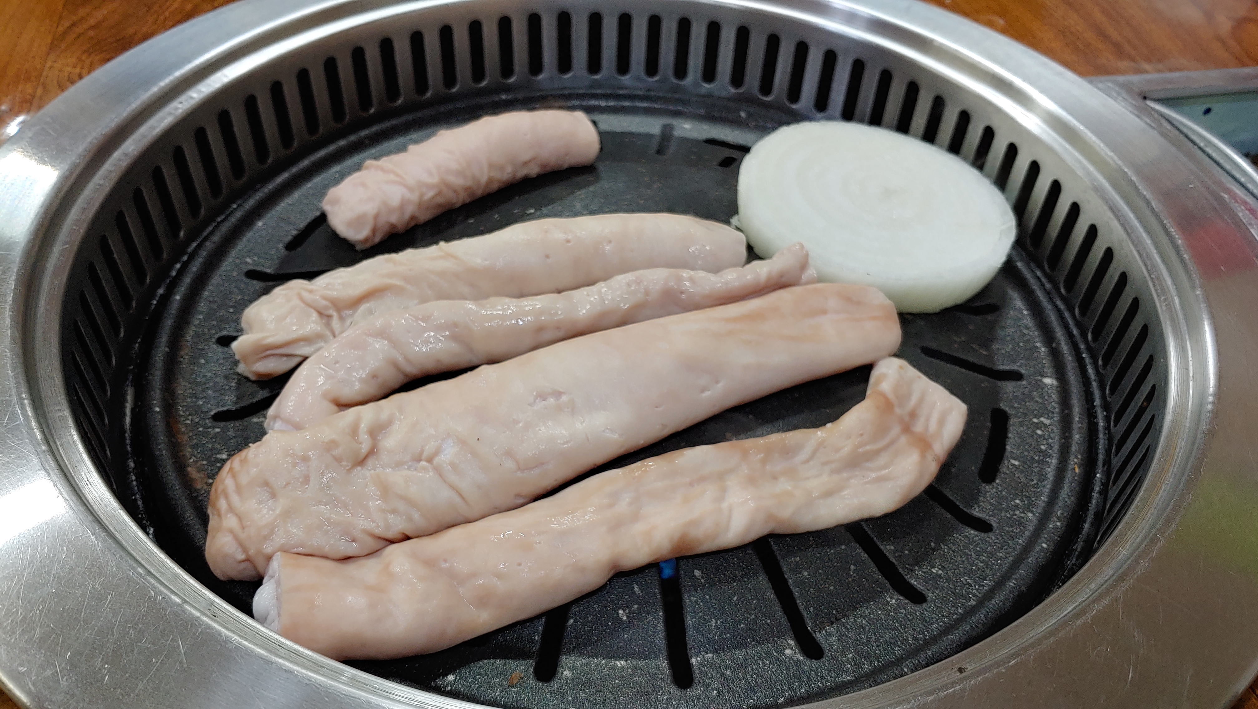 솔직히 막창 이렇게 먹어보질 않아서 어떻게 굽는지 모르겠다. 대충 색이 변하고 자르기로 했다. 안에 생각보다 기름 같은 것이 많아서 놀랬다. 역시 맛이 있는 이유가 있다.