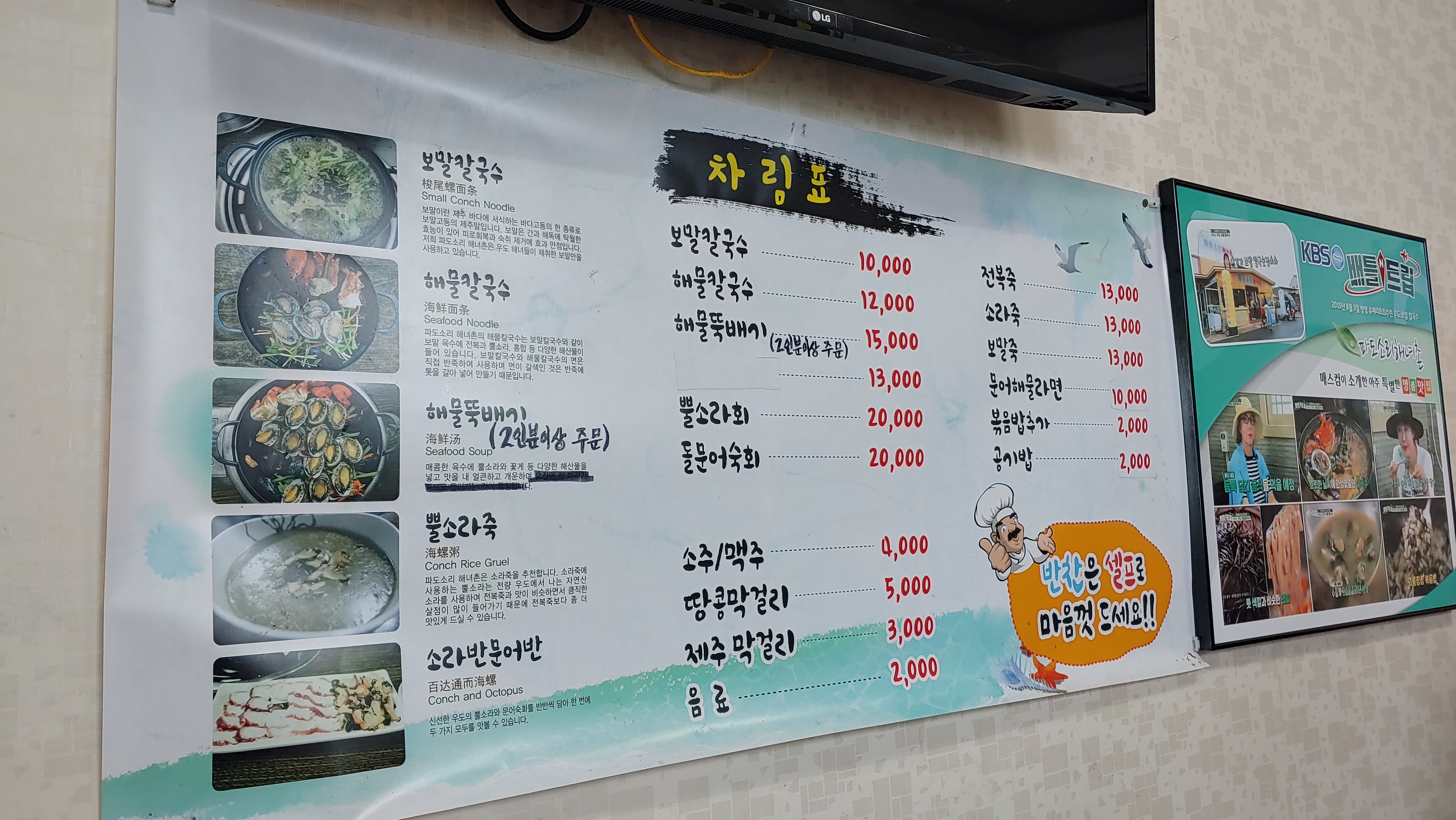 보말 칼국수를 먹을까 해물 칼국수를 먹을까 엄청 고민이 된다. 옆에 테이블을 보니 반반 섞어서 먹는 것을 보니 반반 메뉴가 되는 것 같다. 그렇지만 그냥 깨끗한 보말 칼국수를 먹기로 했다.