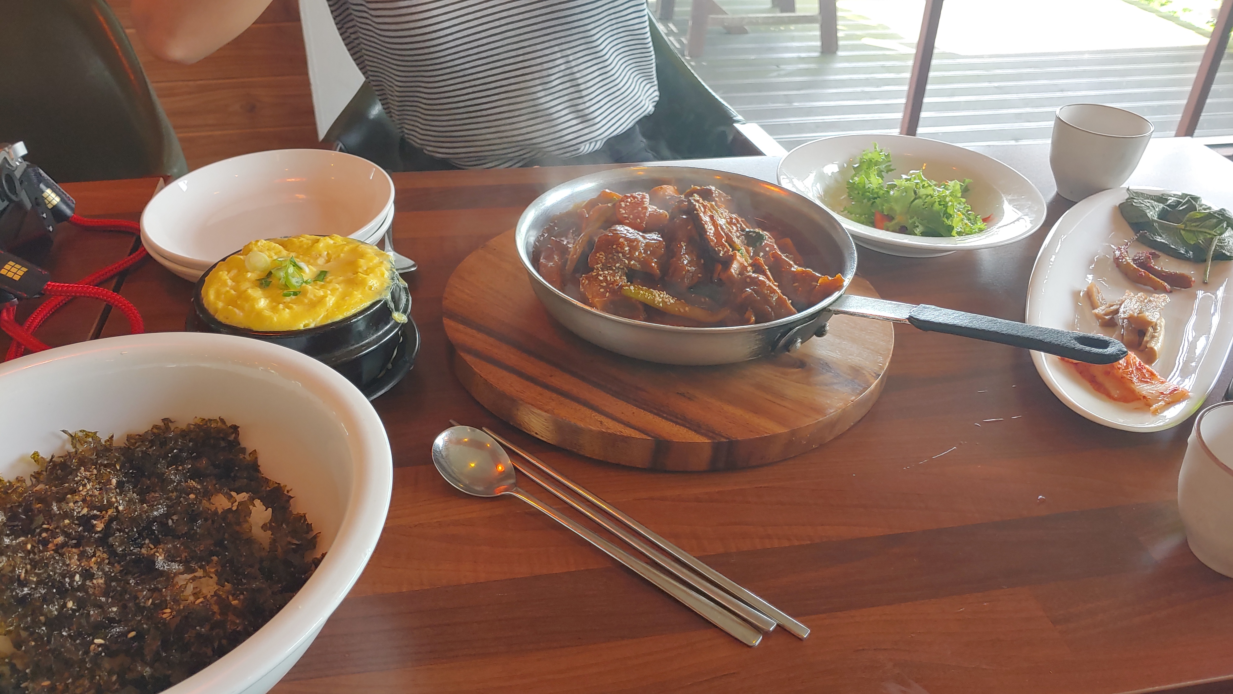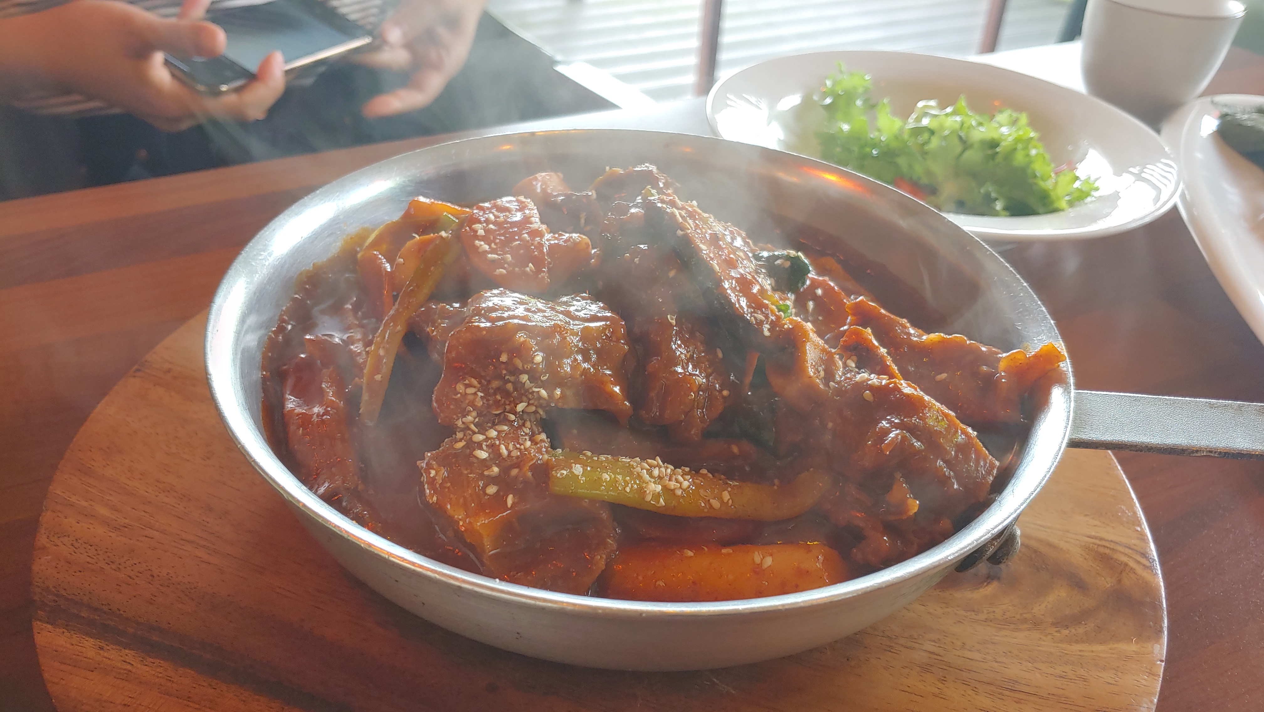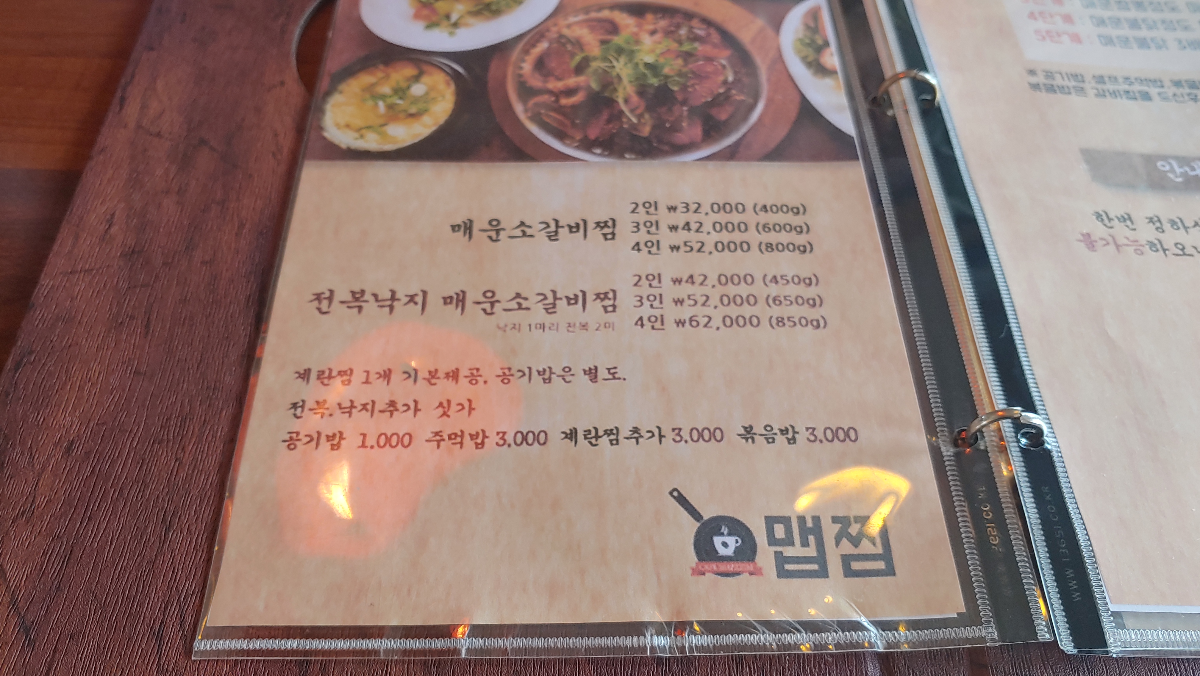 우리는 원래 전복낙지 매운 소갈비찜을 먹으러 왔는데 우리가 왔을 때는 재료 소진으로 매운소갈비찜만 되었다. 제주도는 서울과 다르게 무리하게 주문? 손님을 받는 것 같지 않았다. 그냥 없으면 안받고 다 팔면 문을 닫는 것 같다. 우리가 나갈 때도 반찬이 다 떨어졌다고 손님을 받지 않았다.