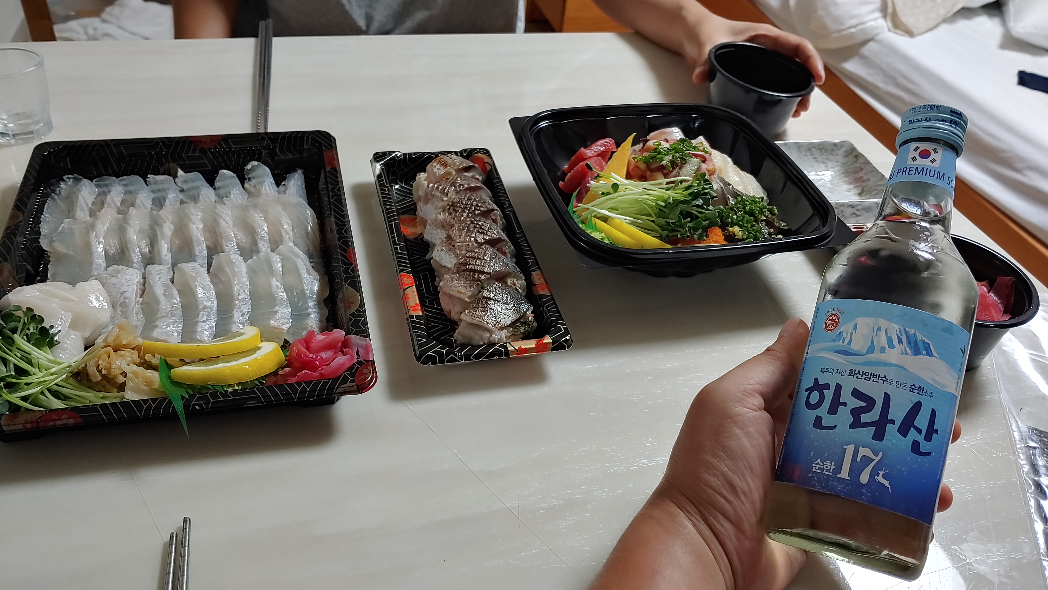 김에 밥이랑 각종 해산물을 올려서 간장에 찍어 먹으면 된다~! 제주도여서 그런지 싱싱한 해산물을 맛있게 싸먹으니 너무 맛있었다. 소주가 금방 끝나버렸다.