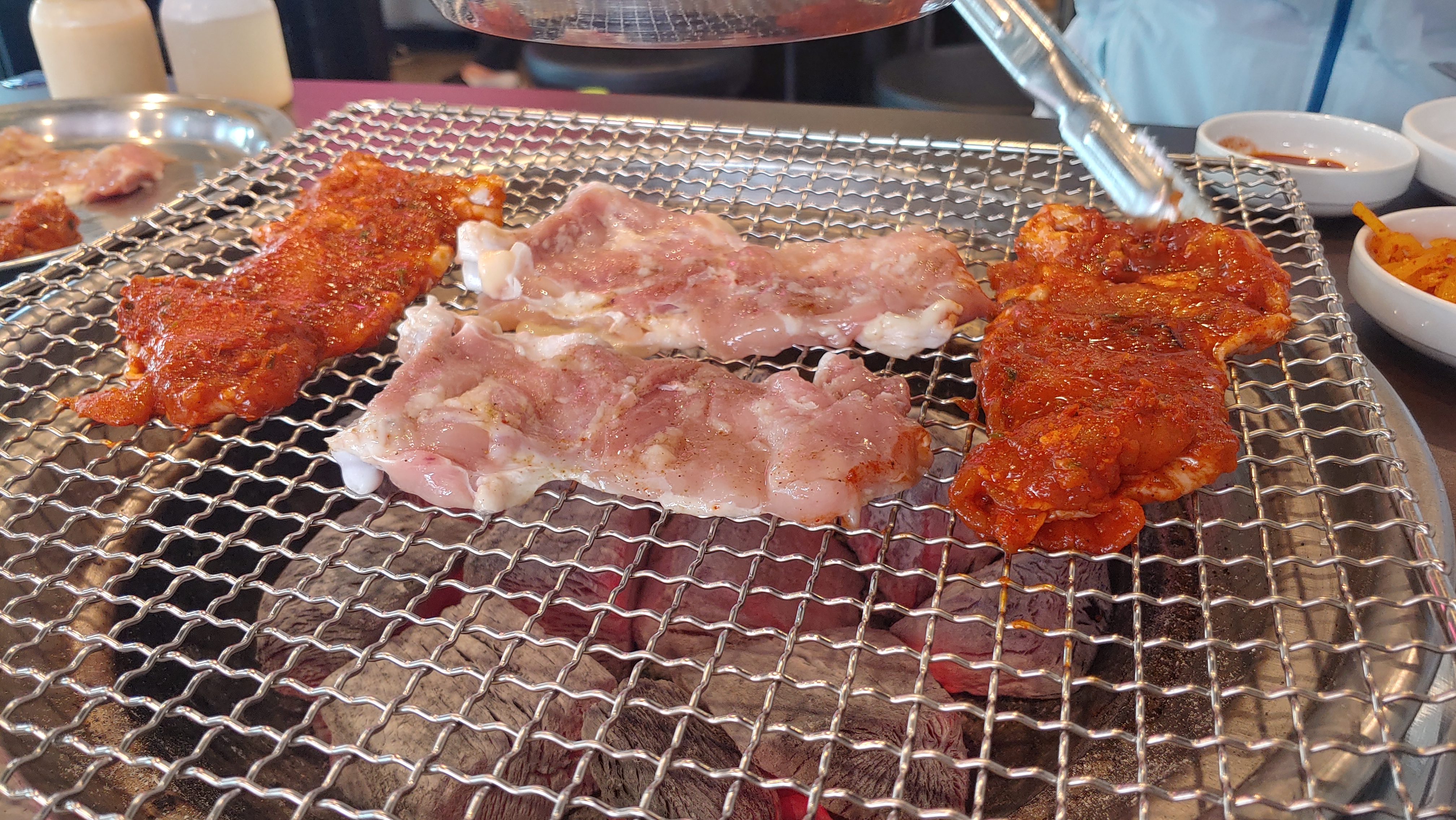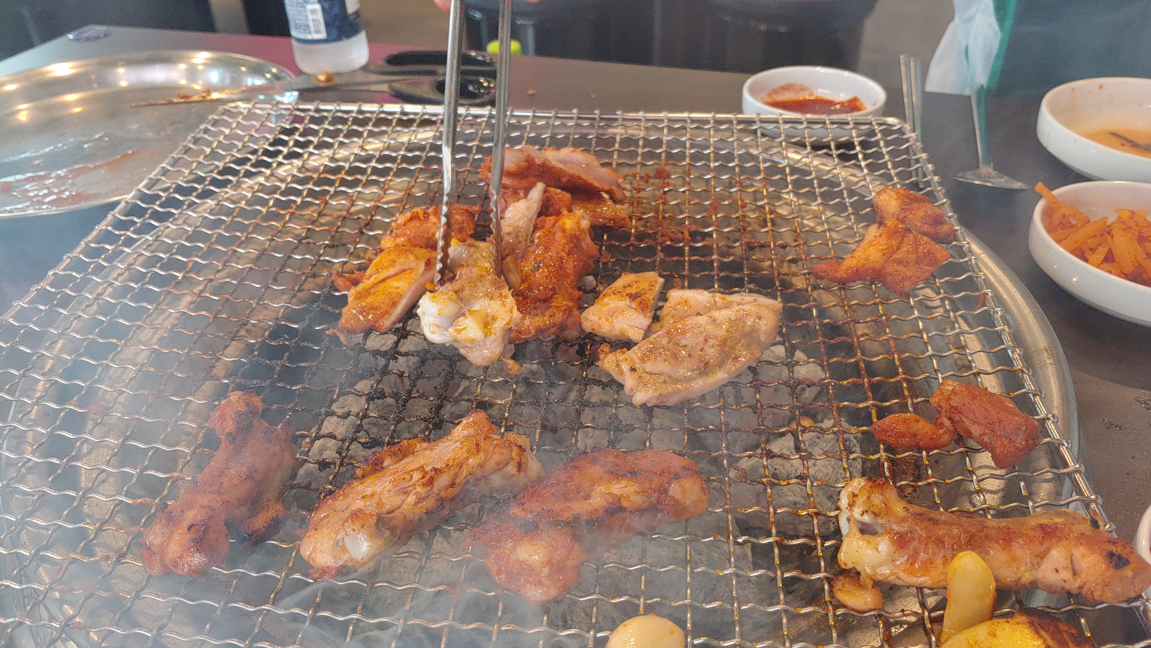 양념은 탈 수 도 있으니 외곽으로 돌릭고 닭갈비를 직빵으로 구워보았다.