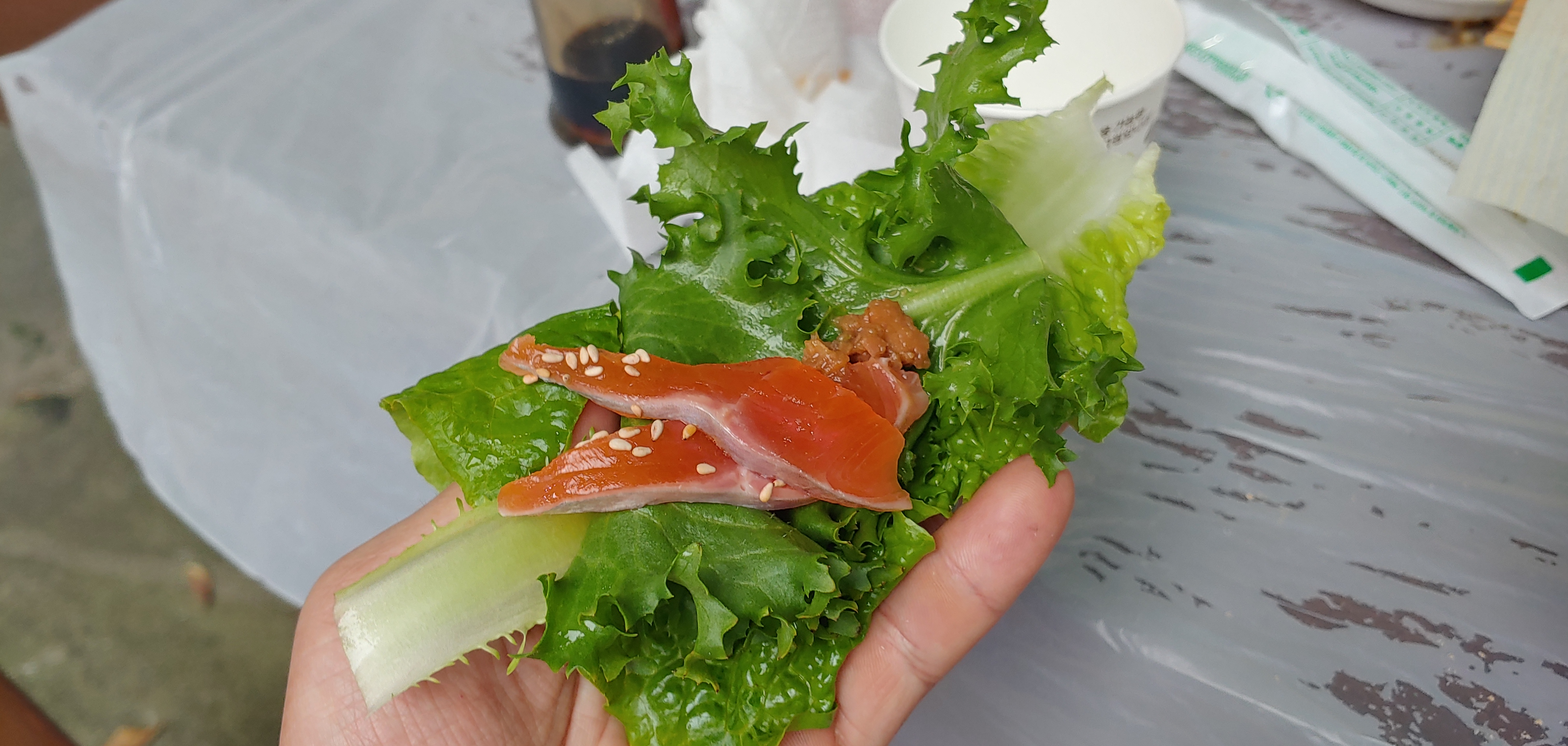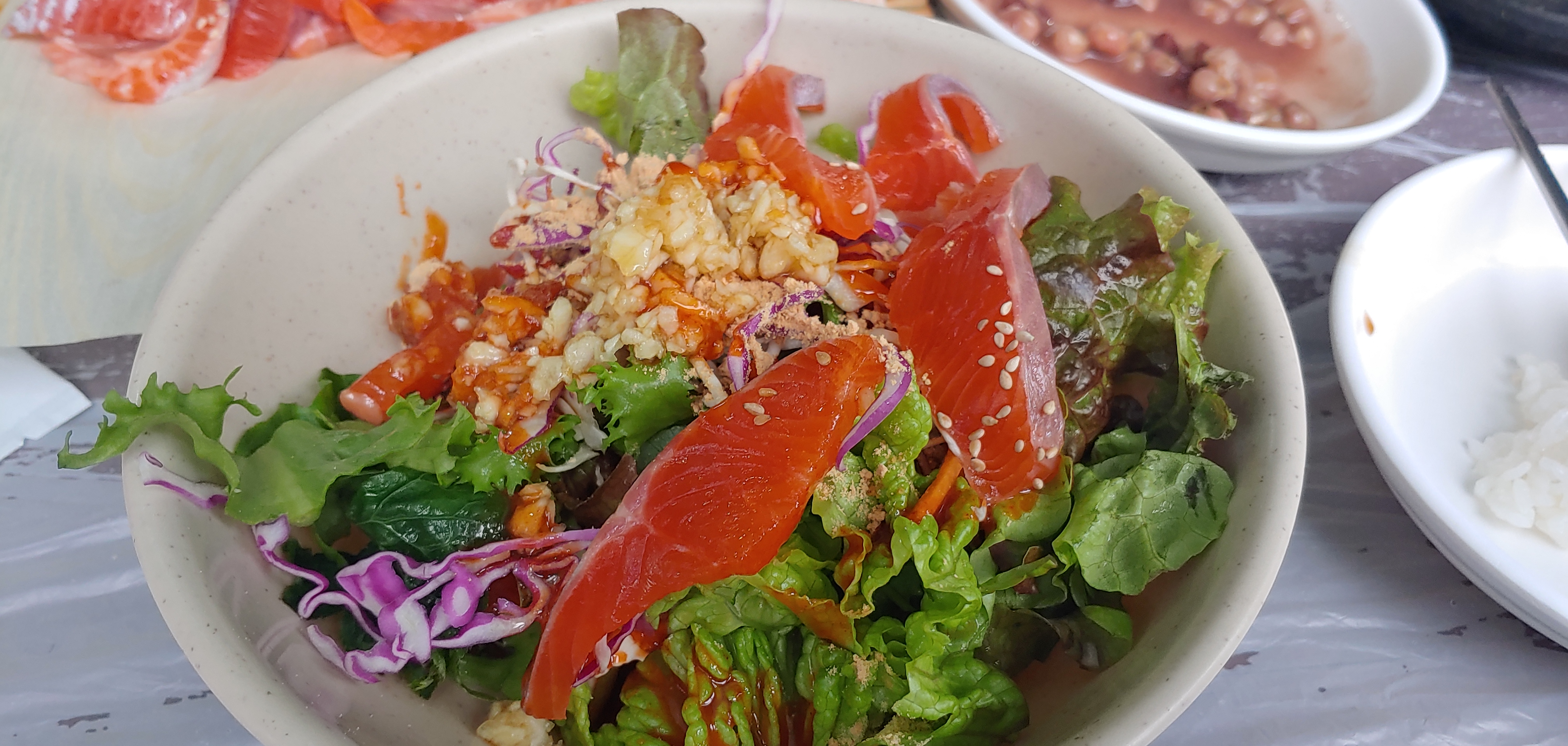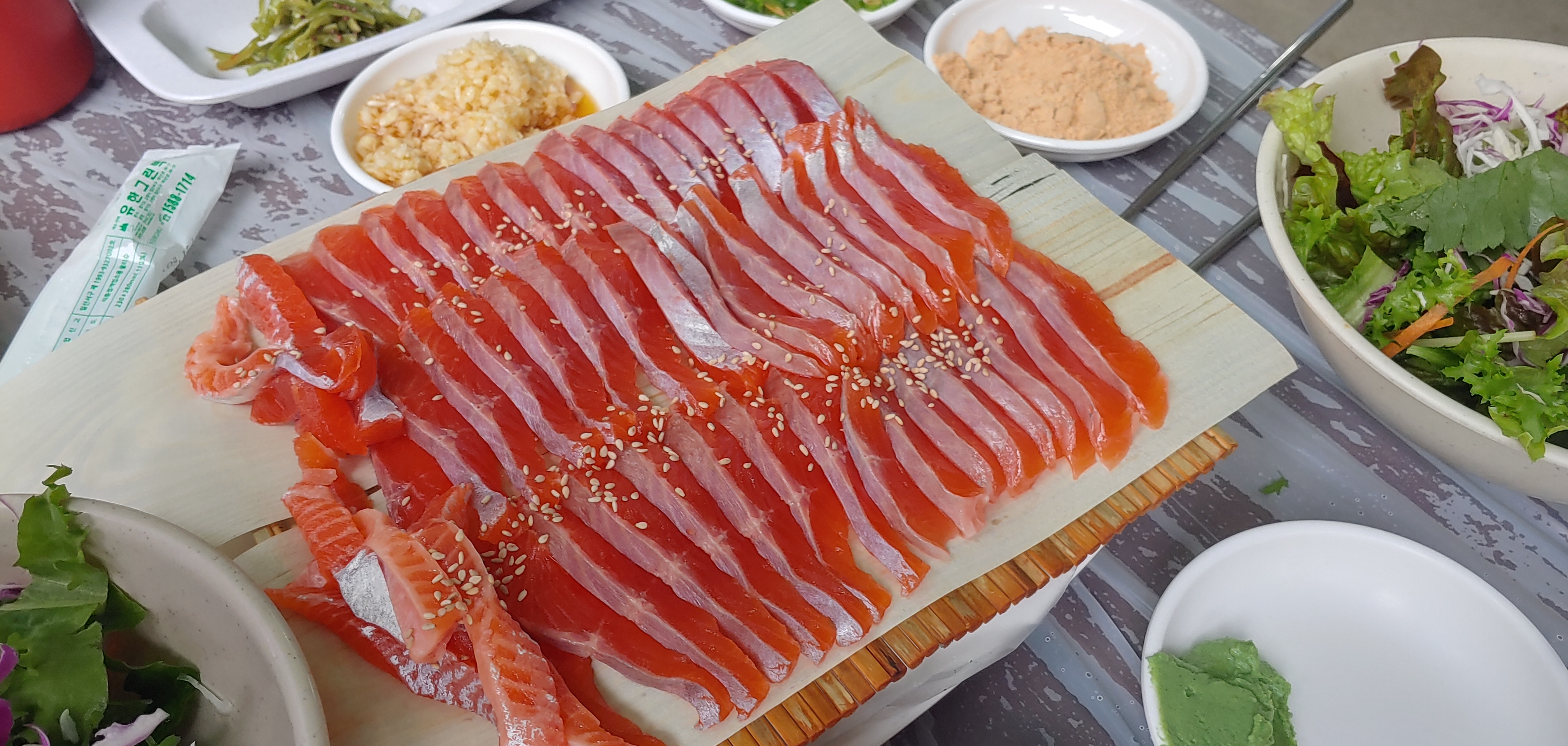 비빔으로도 먹고, 싸먹기도 하고 여러가지로 먹을 수 있어서 좋다. 송어회를 처음 먹어보았지만 약간 연어의 느낌이다. 하지만 연어보다는 향이 약하고 색깔과 식감이 강한 느낌이었다. 싱싱한 송어회와 함께 맛있는 밑반찬을 즐길 수 있는 이 곳 5점 주고 갑니다. 진짜 짱이었다.