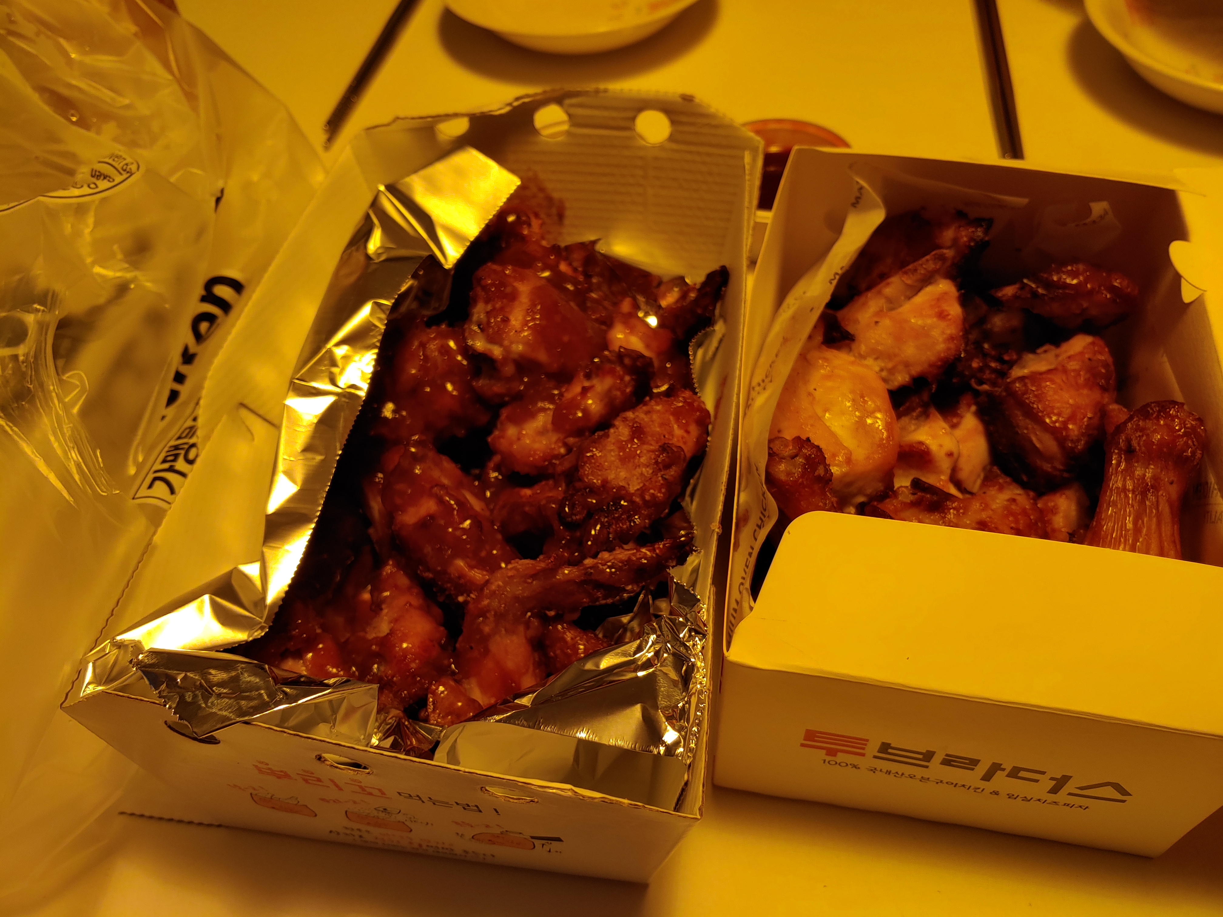 첫날 맛닭꼬 치킨. 그들은 베이크드라고 해서 먼가 구워낸 것 같다. 맛도 튀김만큼은 아니지만 생각보다 먹을만 했다. 가능성을 보았다. 현미 베이크드도 양념이 없었더라면 튀김 만큼은 아니더라고 생각보다 좋은 맛을 낼 수 있었을 것이라고 생각했다.