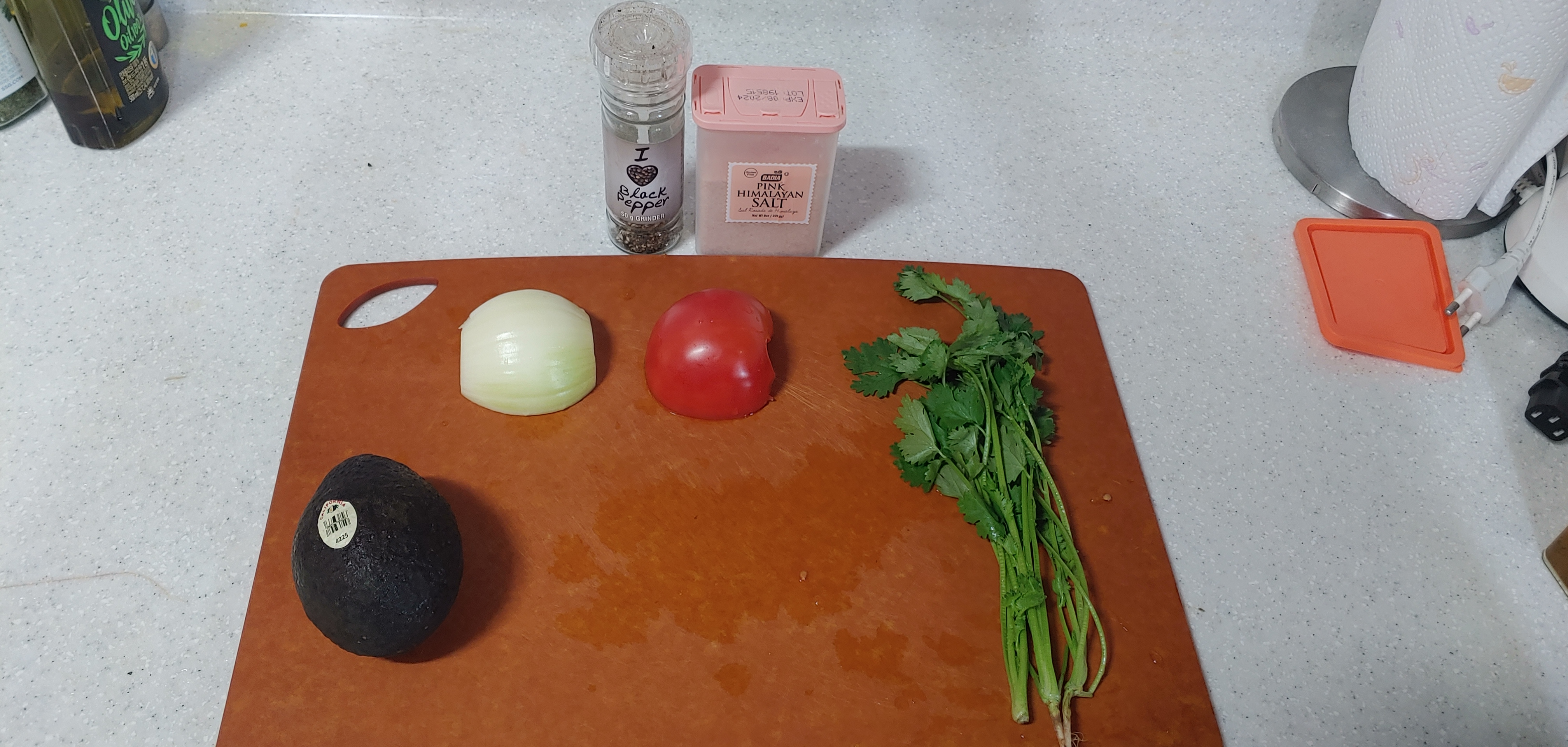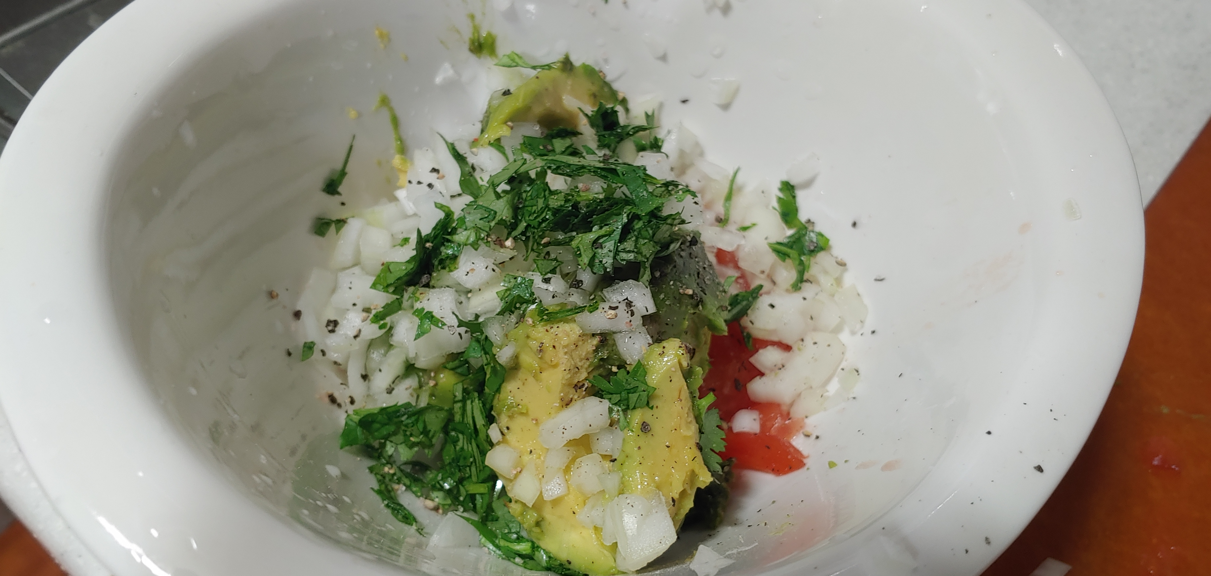 - 양파, 토마토, 아보카도, 고수, 소금, 후추, 레몬즙, 올리브유, 나쵸
