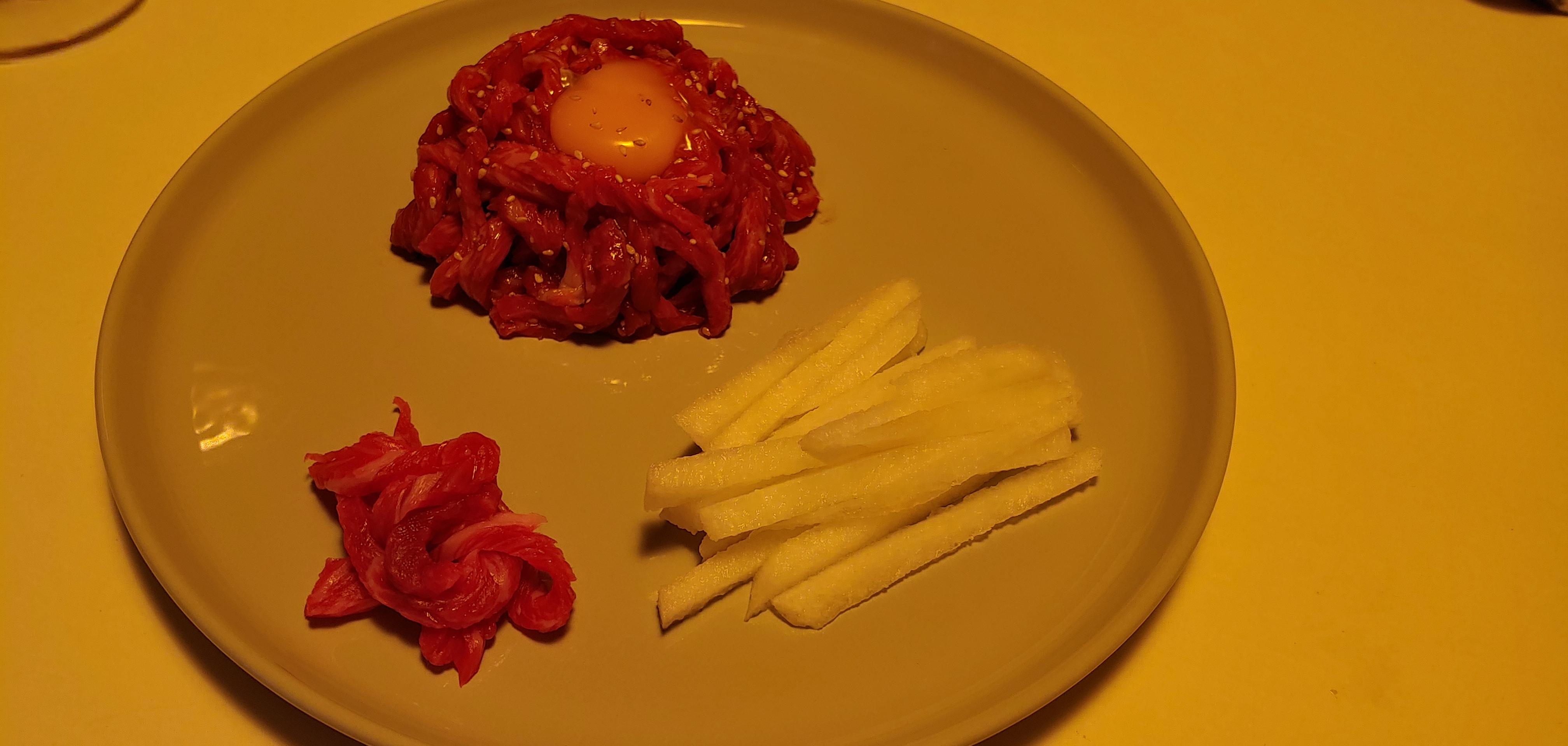 - 소고기 사시미, 배, 계란, 후추, 소금, 간장, 설탕, 맛소금, 깨소금