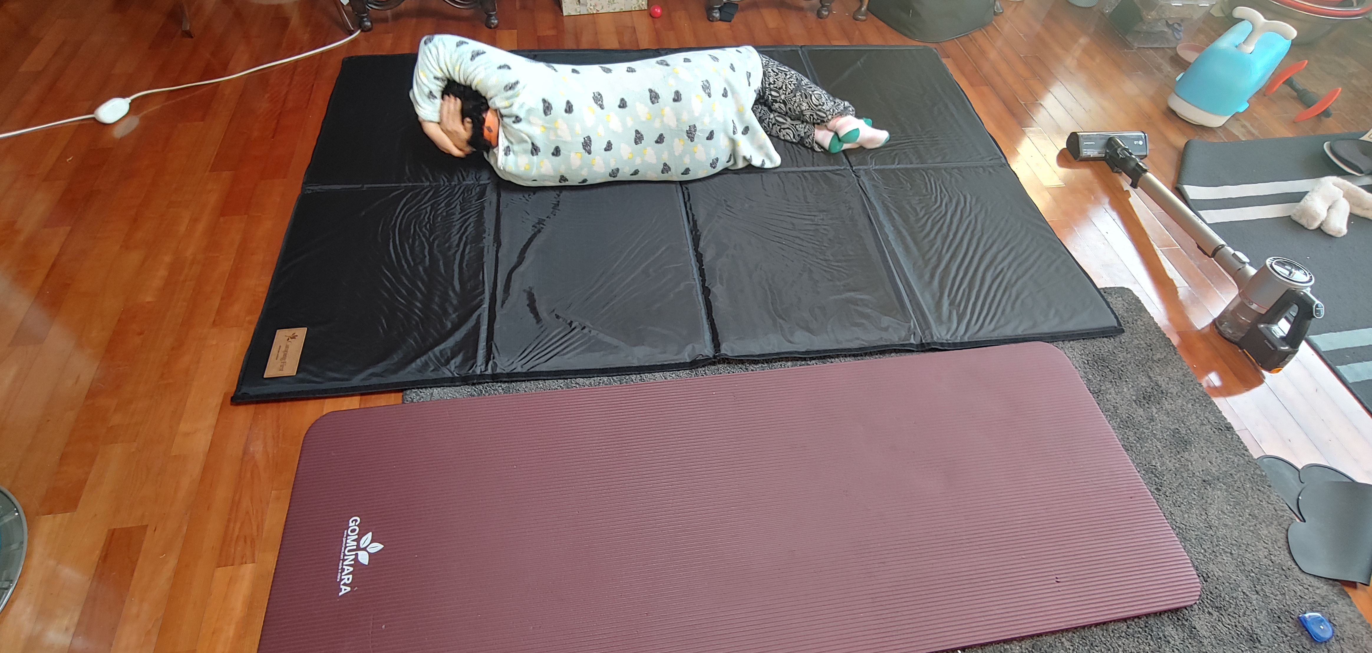 사이즈를 느낄 수 있게 요가 매트와 사람이 누워보았다. 크다 커....