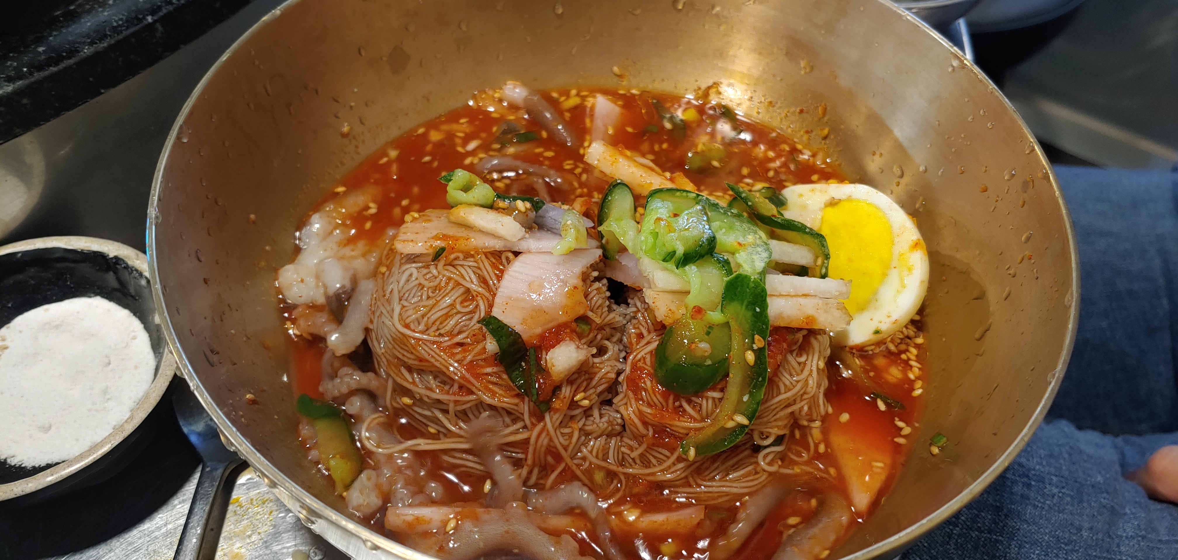 고기 집인데 이상하게 살아있는 낙지가 물탱크?에 있었다. 일하시는 분에게 물어봤더니 냉면에 쓰인다고 한다. 물냉면을 시키면 만두, 비빔을 시키면 산 낙지를 준다고....