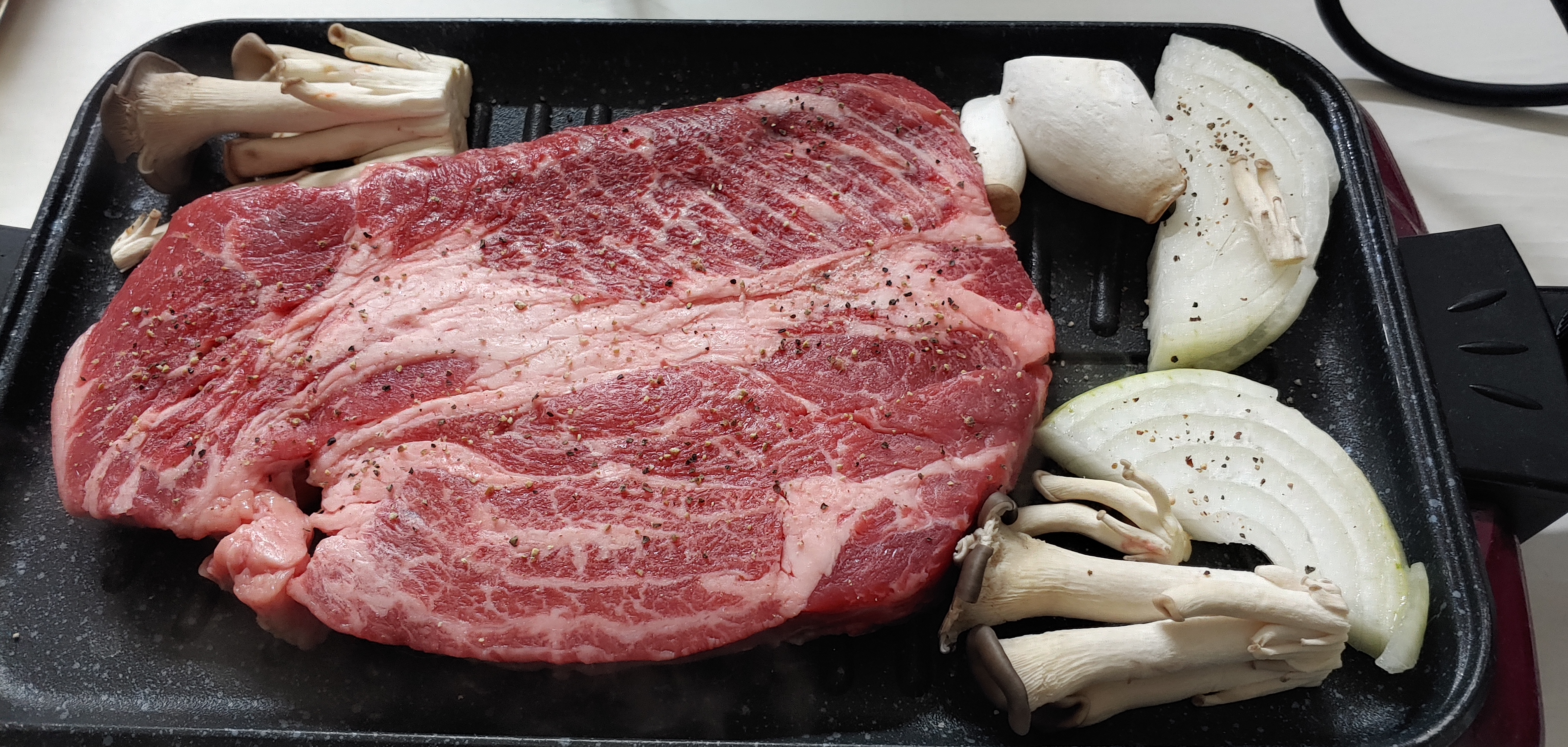 가격은 800g에 18000원정도 밖에 하지 않았다. 가운데 기름이 좀 많아 좀 걸렸지만 너무 급해서 그냥 구웠다. 다음에는 기름을 잘라서 석쇠를 조금 달굴 때 써야겠다.