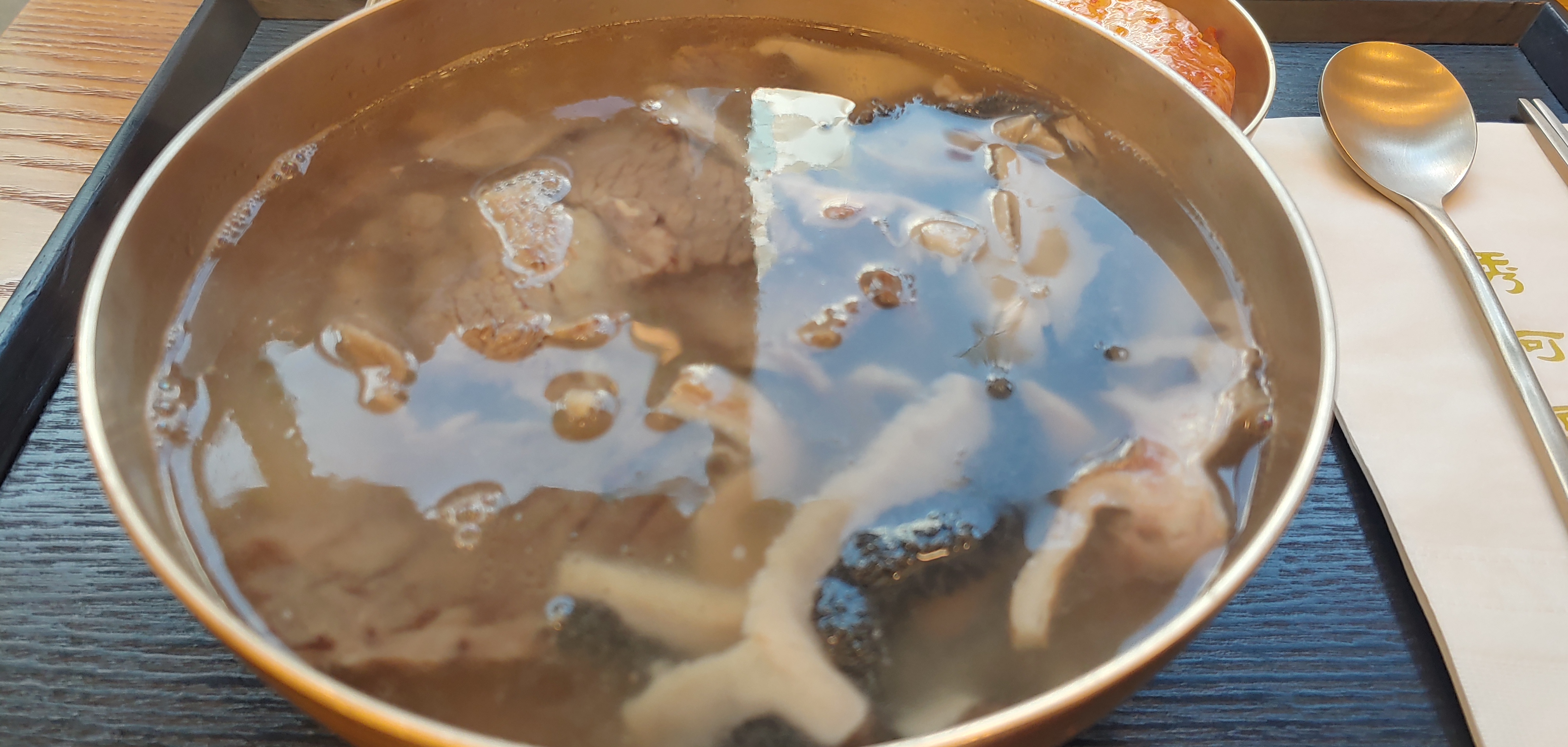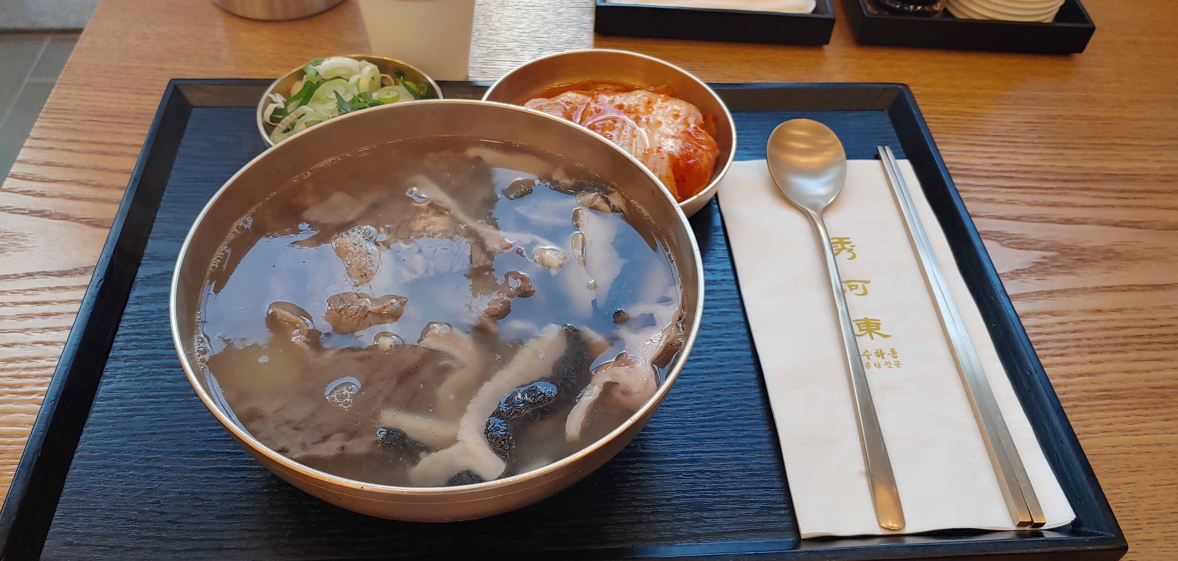 깔끔하다. 국물을 딱 한번 떠 먹어보면 오? 하면서 깊이가 느껴진다. 곰탕을 찾아 먹는 편은 아니지만 나름 깊이가 있고 맛있다고 느껴졌다. 하동관에서 처음 이런 고급 곰탕을 먹었는데, 아직은 하동관의 감동을 잊지 못하고 있다. 그래도 맛있었다. 고급스럽게 느껴졌다.