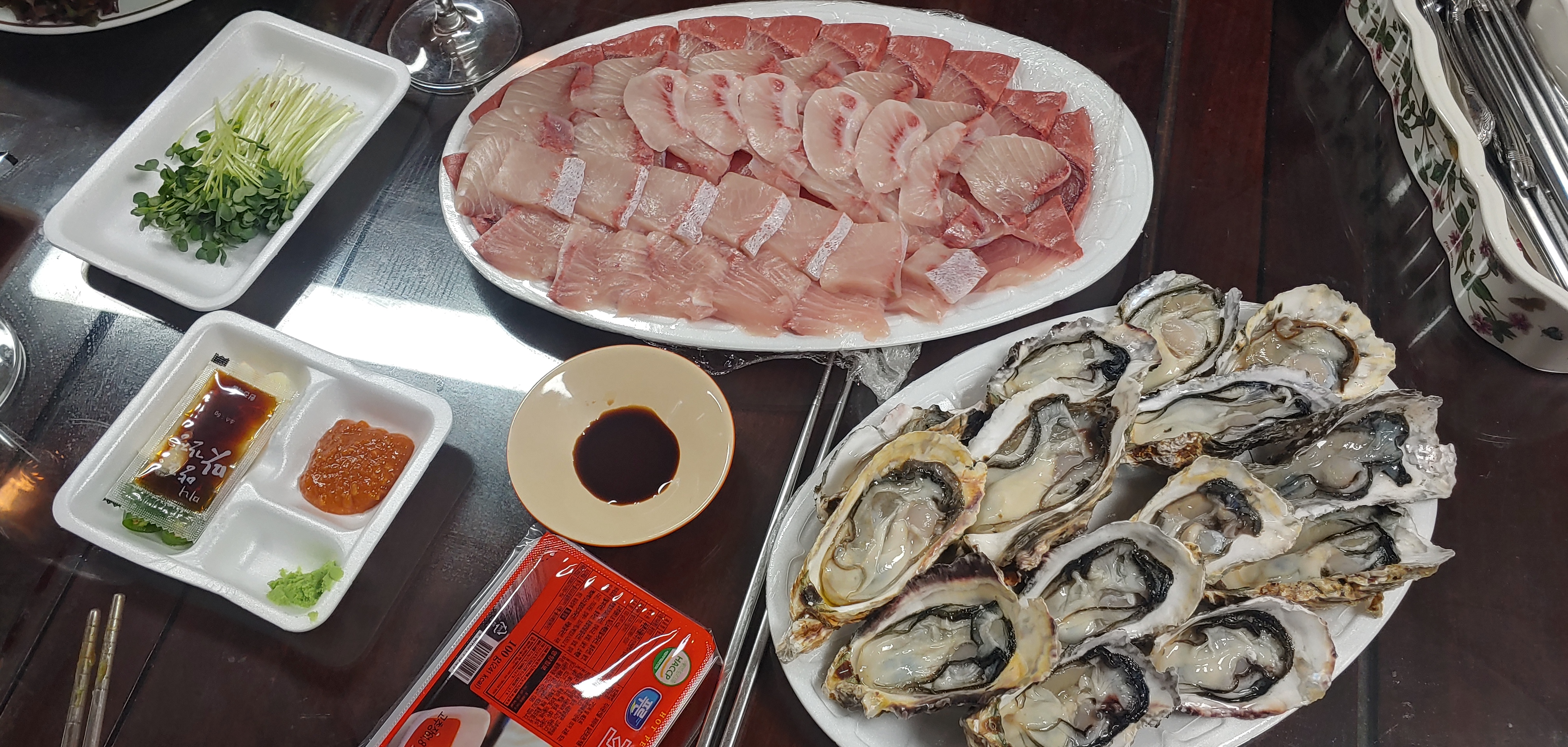 양이 많아 보인다. 그리고 생각보다 다양한 부위를 포장해 준 것 같다. 얼마 전에 수산시장에서 산 것보다도 훨씬 퀄리티가 좋아 보인다. 아 갑자기 그때 생각 나네....