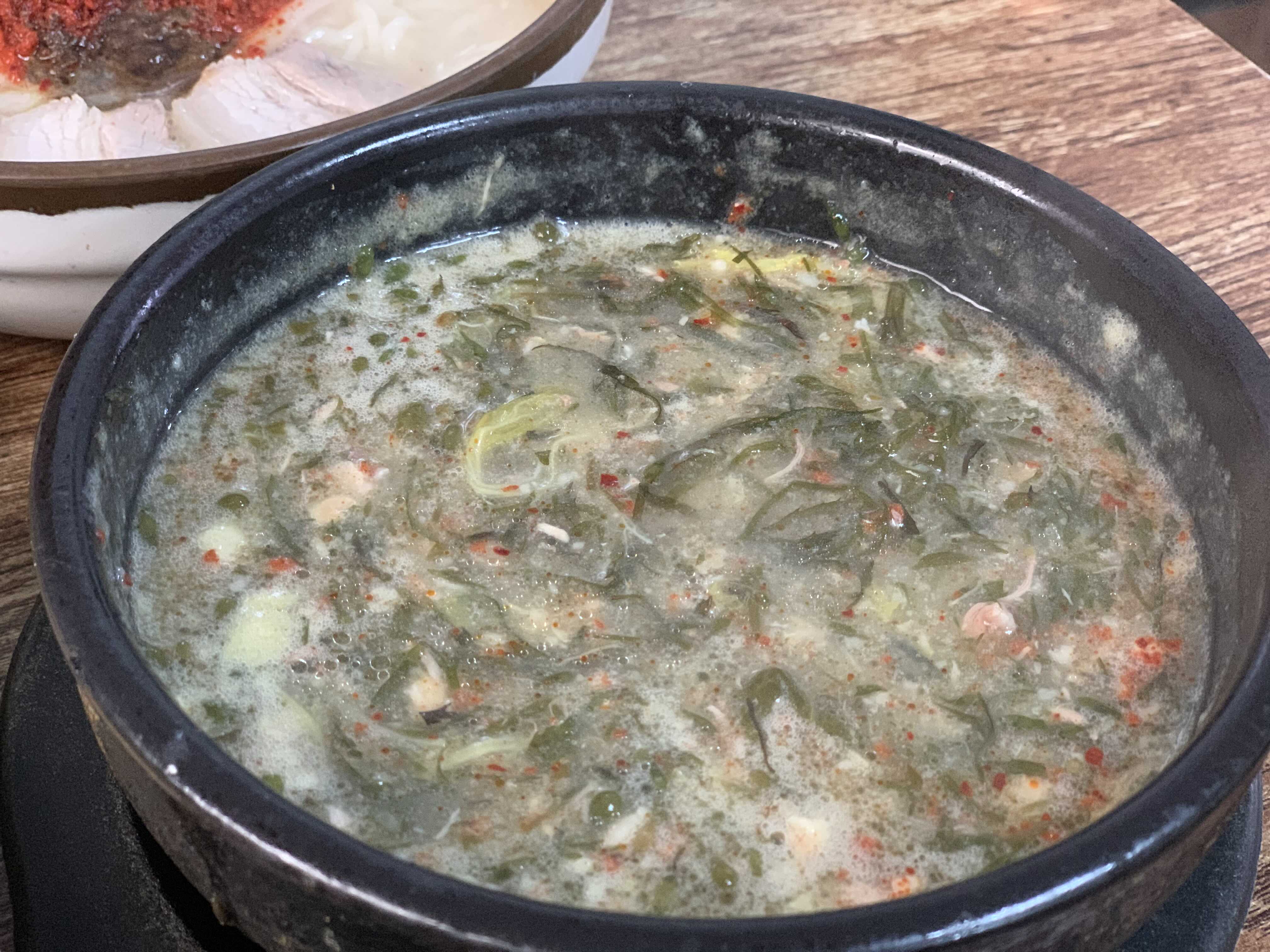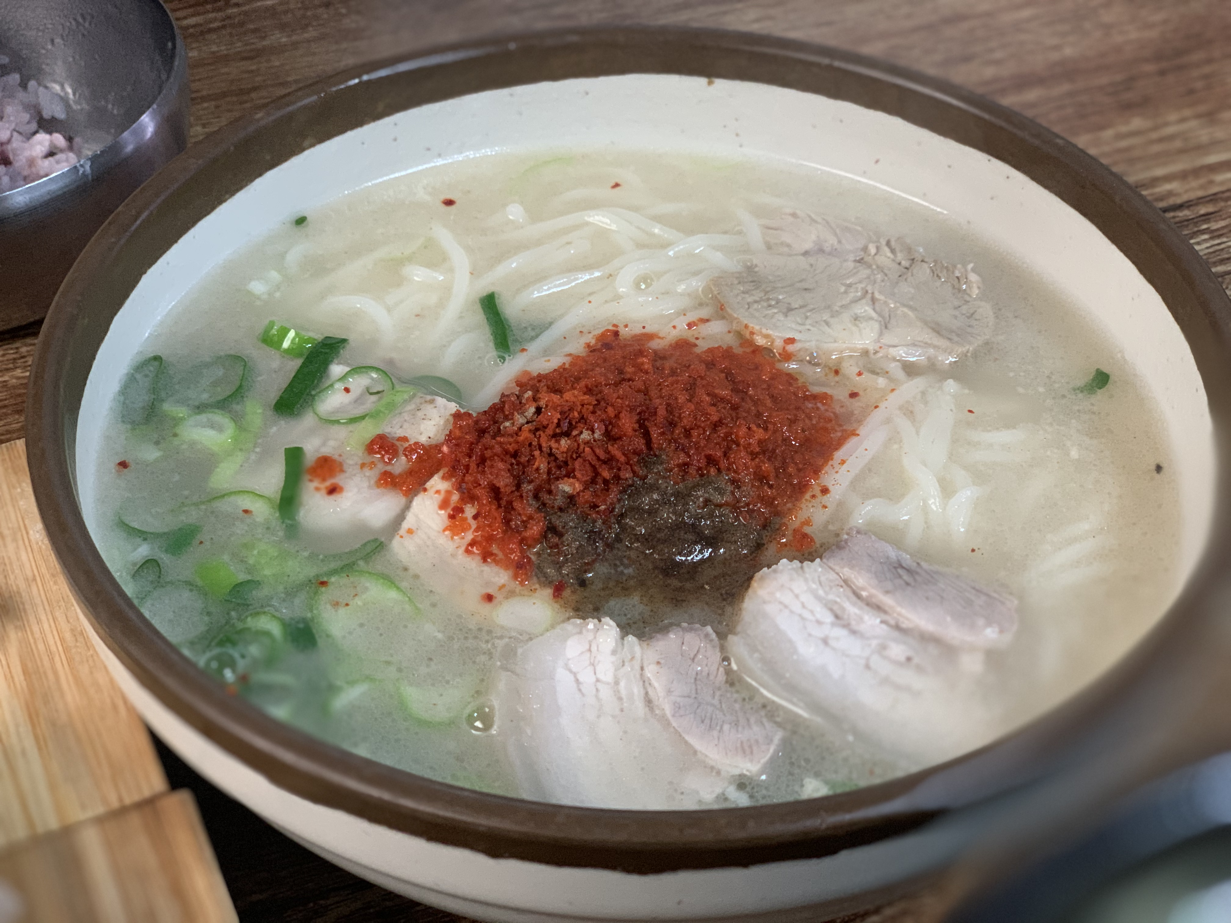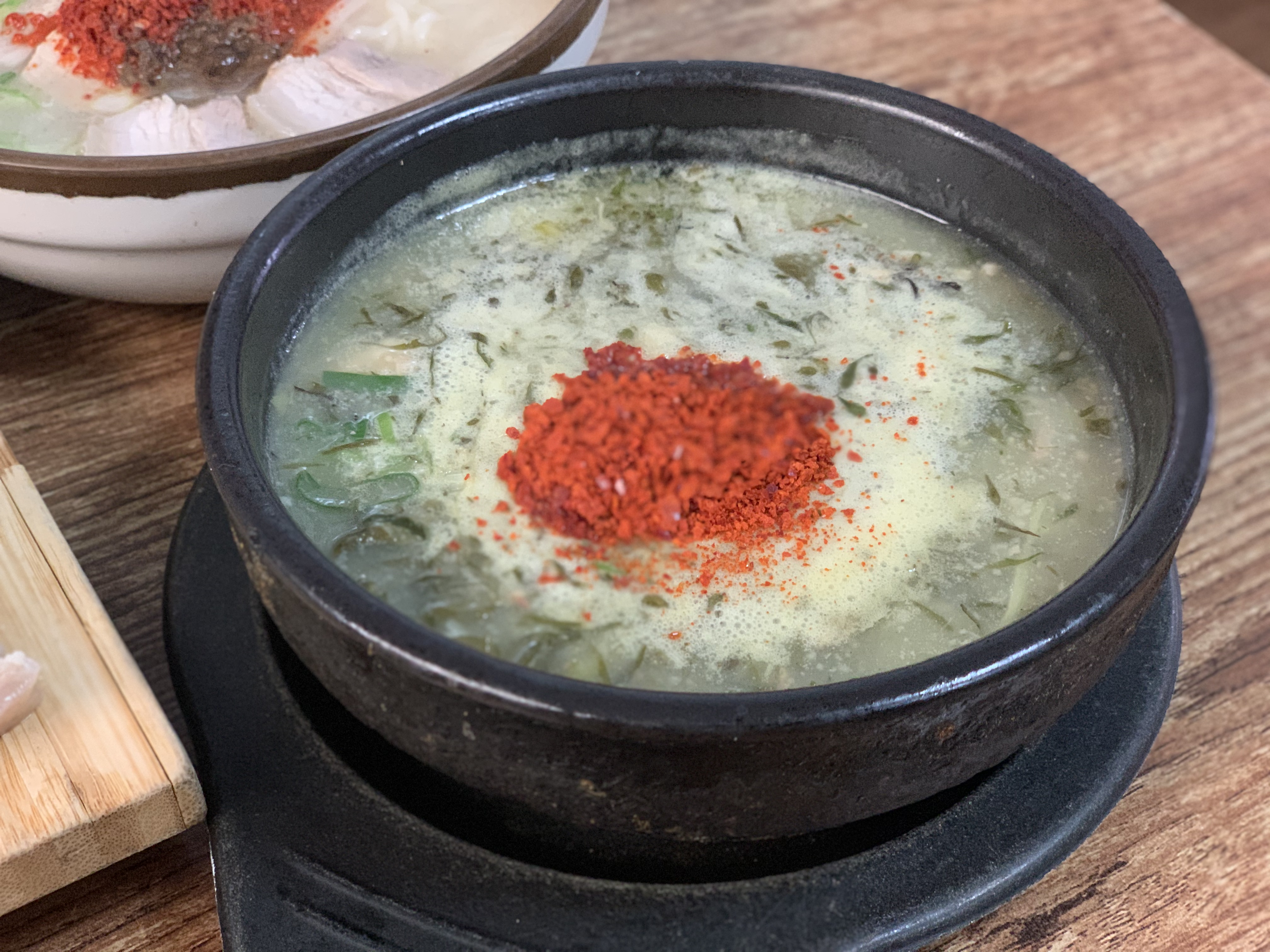 개인적으로 다대기를 싫어한다. 다대기 까지는 아닌데 고추가루를 섞을까말까했는데 섞어 먹어도 나쁘지 않았다. 비주얼은 좀 별로지만 돼지 고기 육수에 해조류를 더해 묘하게 맛을 낸다. 개인적으로 좋아하는 것을 다 넣은 것 같다. 게다가 새우젓?으로 간을 맞춘거 같은데 딱 맞다.