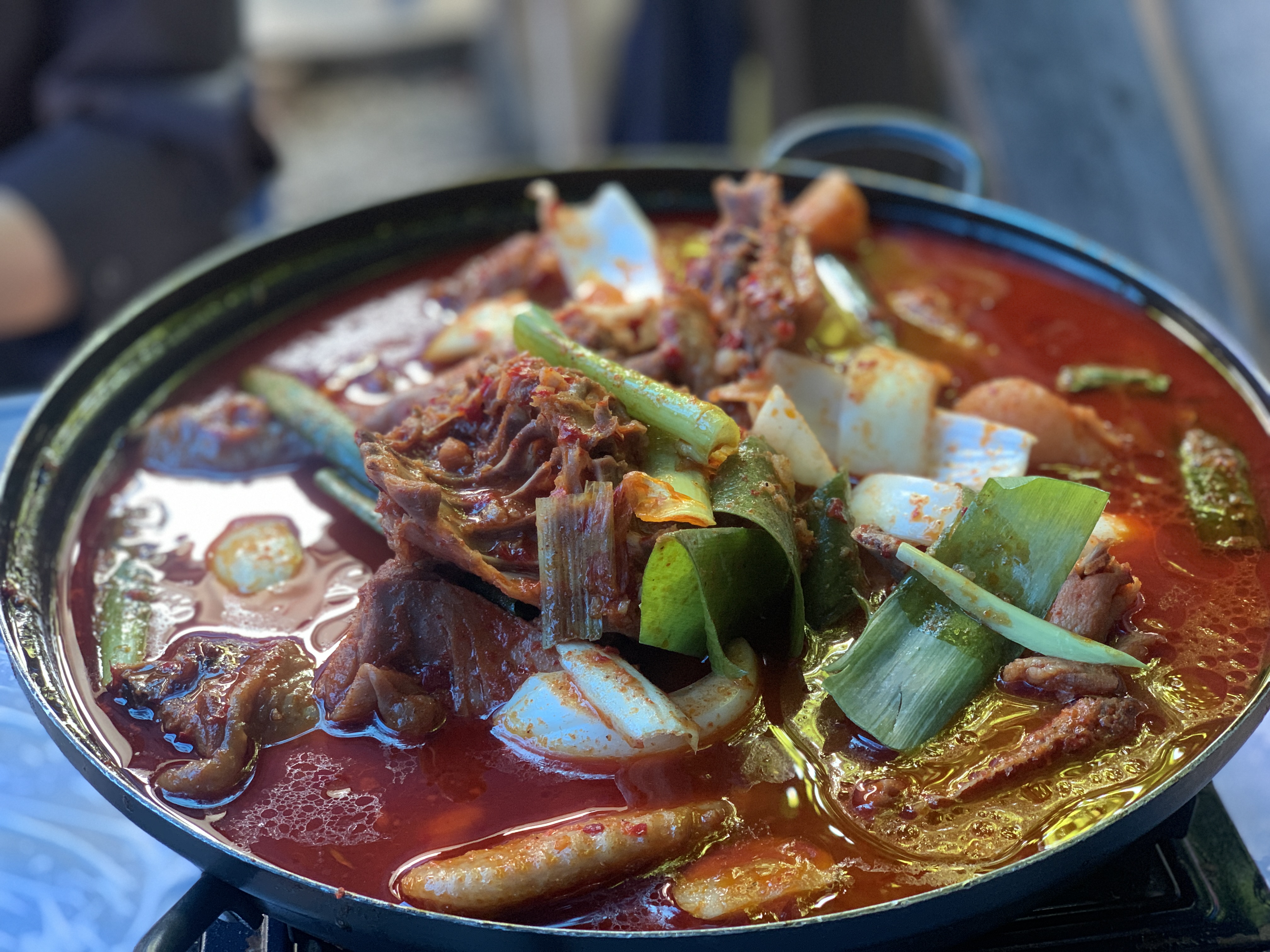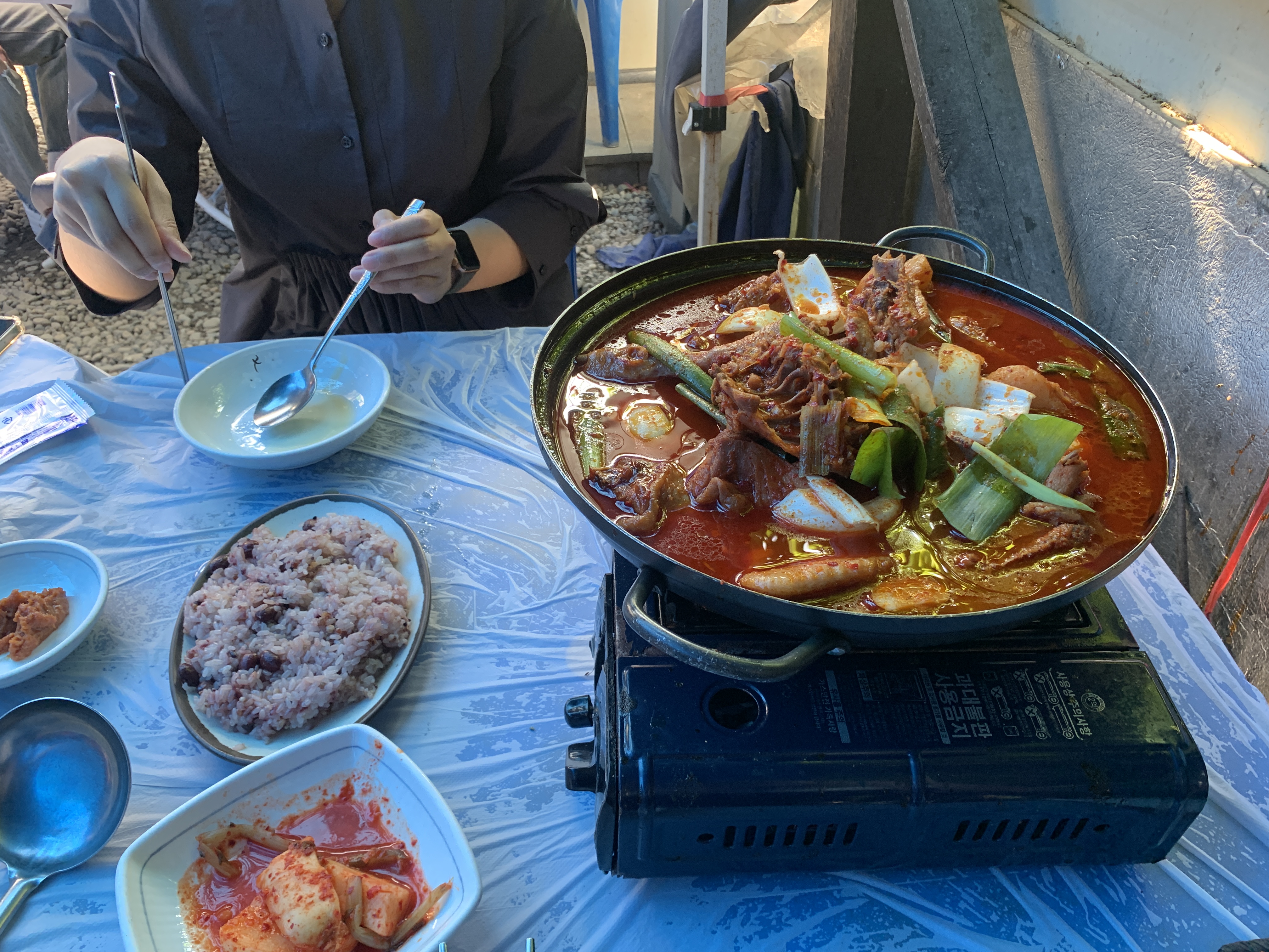 덜 매운 것 맞나요? 진짜 엄청나게 맵게 생겼다. 토종닭이어서 가격이 꽤 나가는 것 같았다. 양도 많아서 2명이 먹기에는 좀 빡세 보였다. 우리는 남겨서 포장했다.