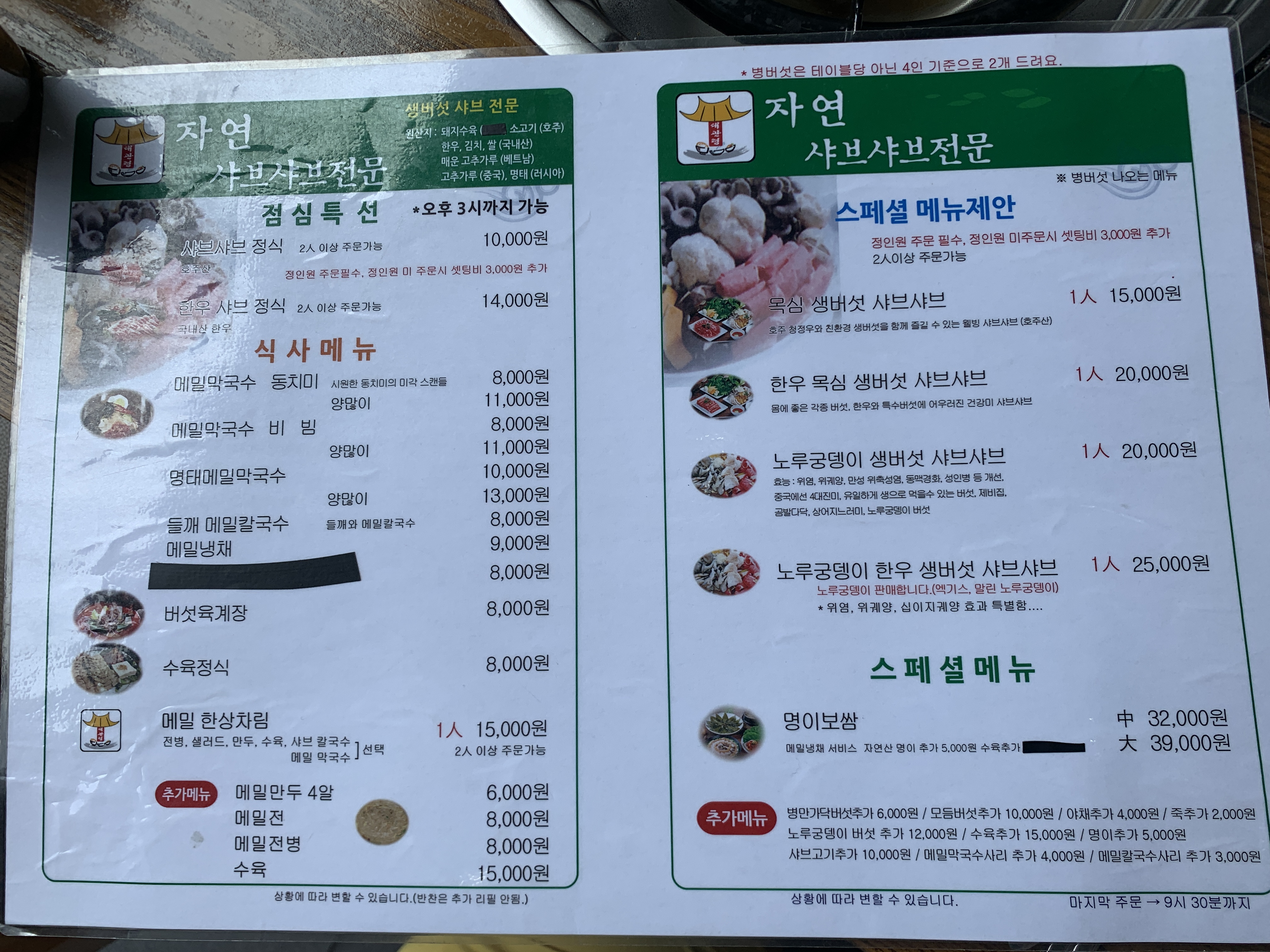 지난번에 왔을 때는 사귄지 얼마 된지 않아서?? 무리를 했던 것으로 기억난다. 노루궁뎅이 생버섯 샤브샤브를 먹고 정말 엄청나게 많은 버섯을 보고 놀랬었다. 이번에는 가성비를 택했다.