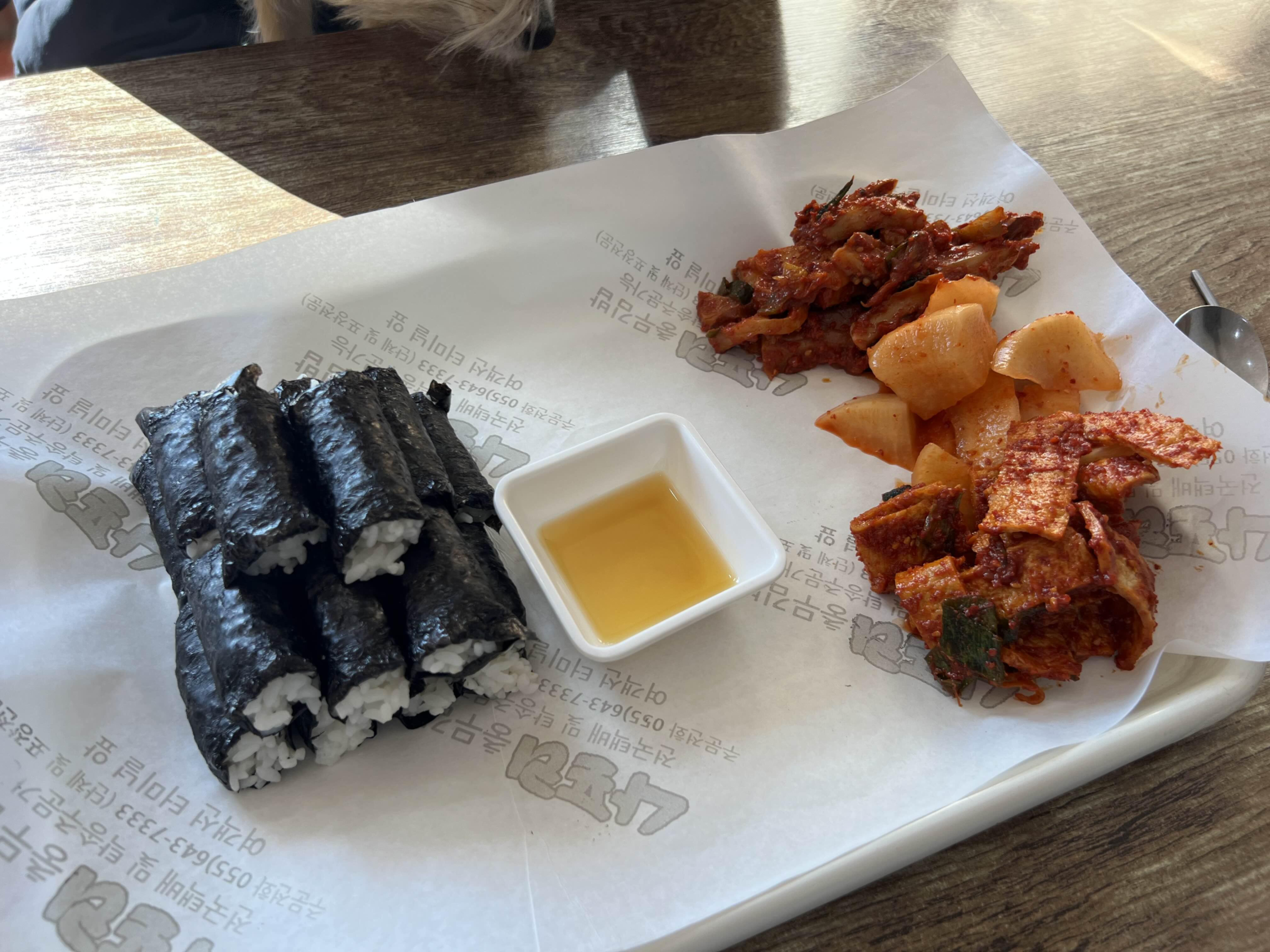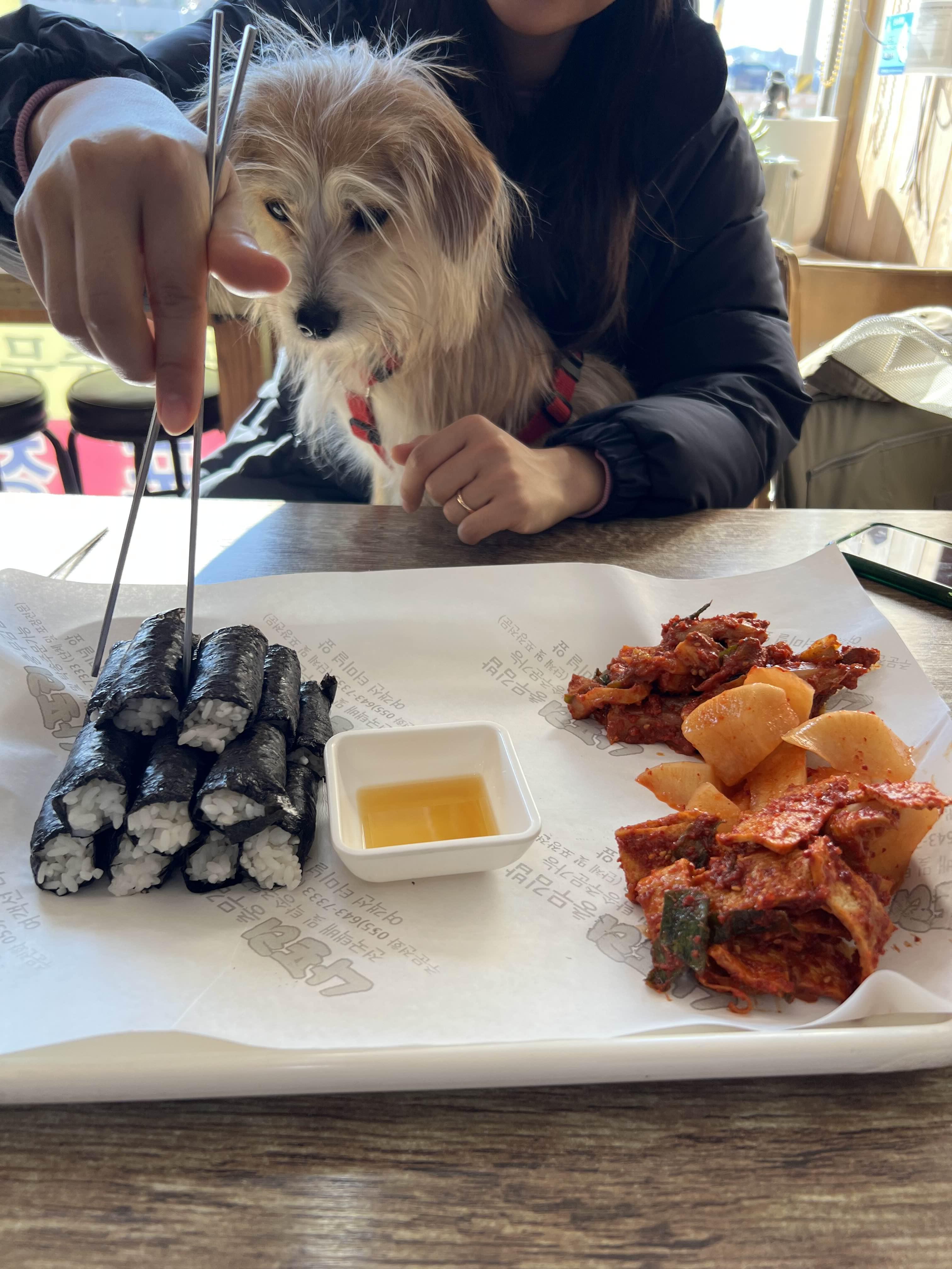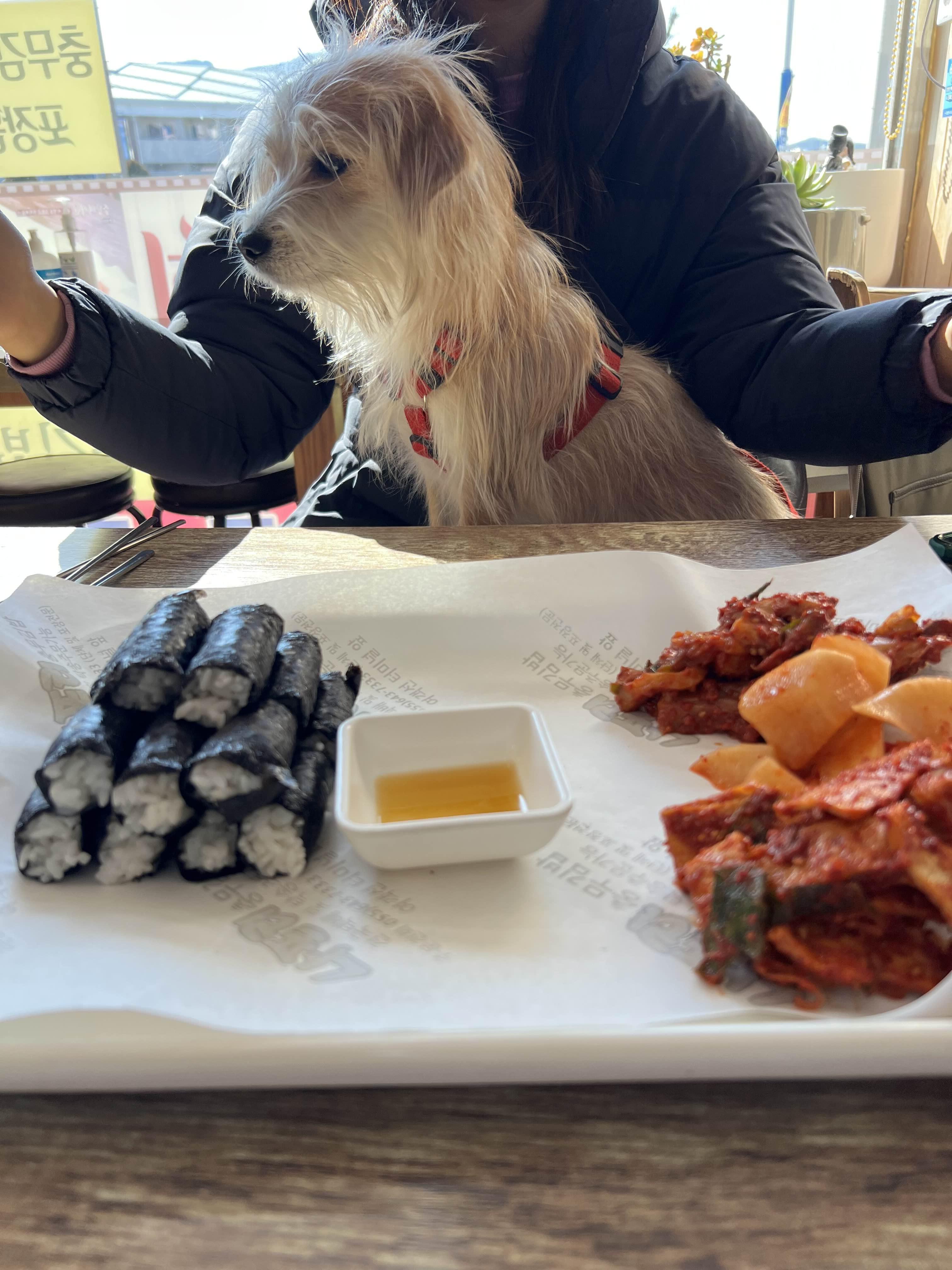 내 인생 처음으로 통영에 왔다. 서울에서부터 버스를 타고 와서 힘들었다. 도착하자마자 밥부터 먹기로 했다. 사실 생각보다 너무 일찍 도착했다. 그래서 체크인도 할 수 없었다. 간단하게 충무 김밥을 먹고 뭘 먹을지 생각해 보기로 했다. 오기 전부터 충무 김밥집에 가기로 했고, 충무김밥 3대 집을 검색해 봤는데, 마침 택시에서 내렸는데, 근처에 있었다. 사람도 없었다. 아마도 금요일 점심시간이라 아직 놀러 온 사람이 없었던 것 같았다. 강아지 동반 가능하냐고 하니, 약간 망설이시더니 가능하다고 했다. 손님이 없어 아마 가능하지 않나? 생각이 들었다.