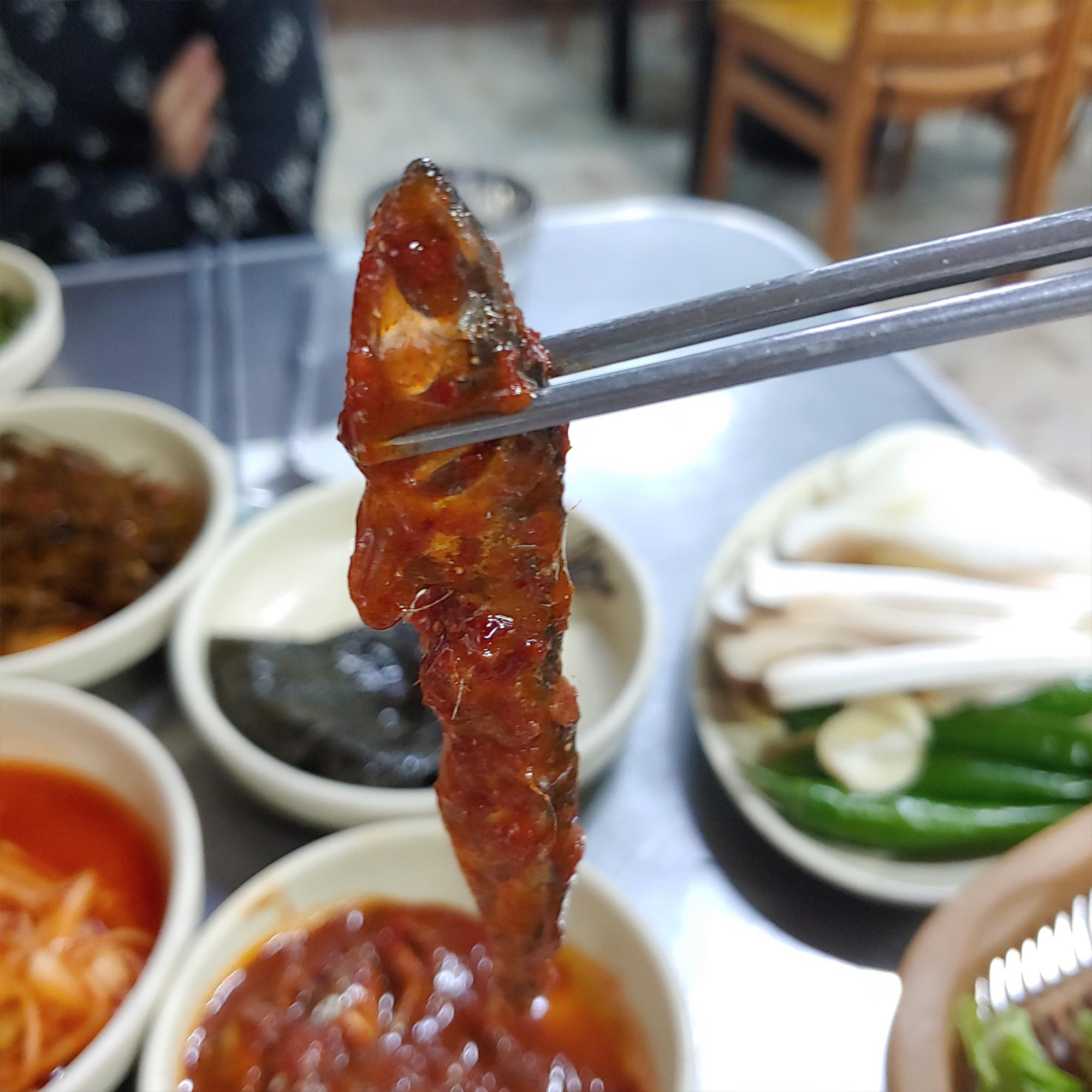 정체를 알 수 없었다. 멸치젓인 것 같은데, 부담되게 컸다. 어떻게 먹는지 모르겠지만, 그냥 잘라 먹었는데 먹을만했다.