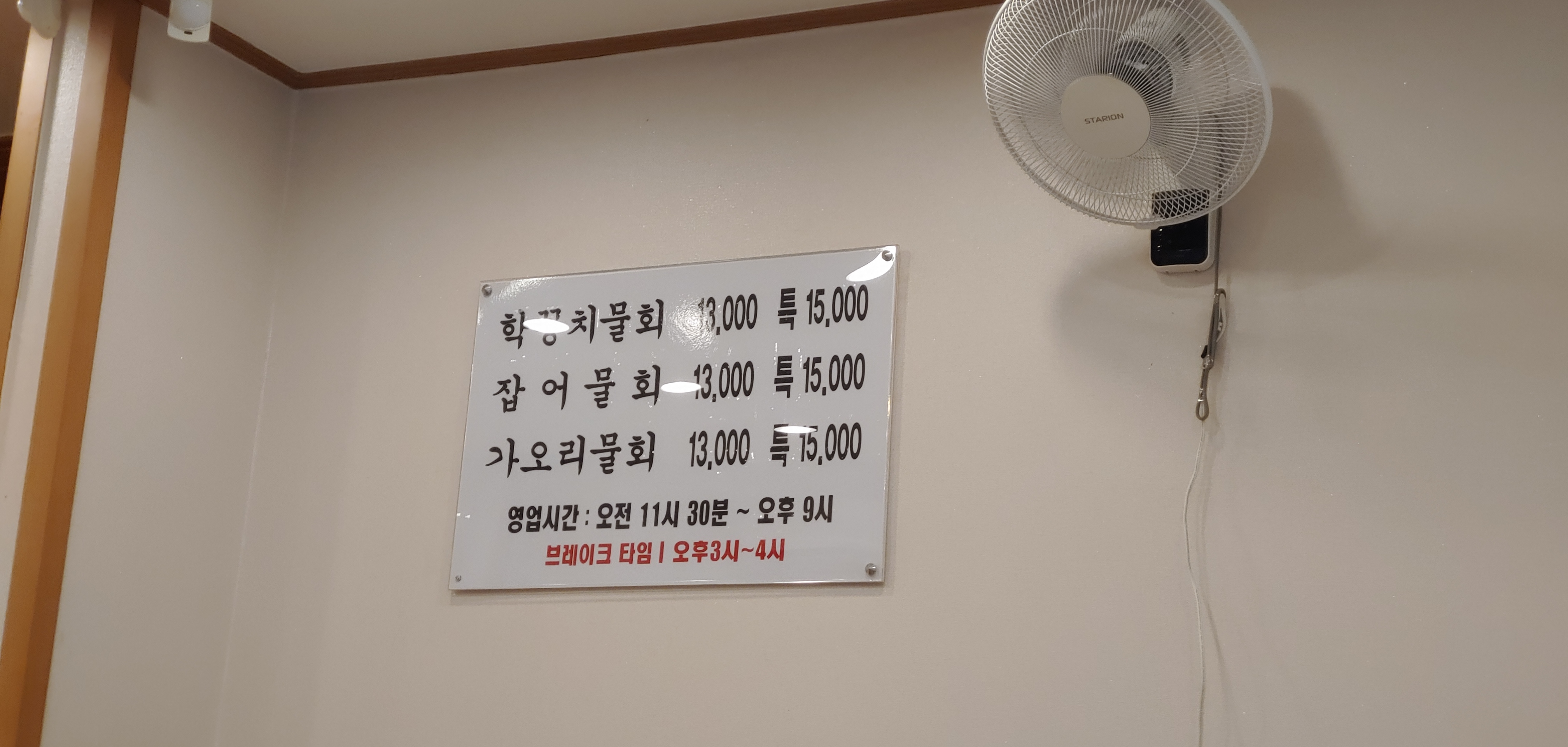 등푸른 생선을 좋아해서 학꽁치 물회를 시키려고 했는데, 겨울에만 된다고 하였다.