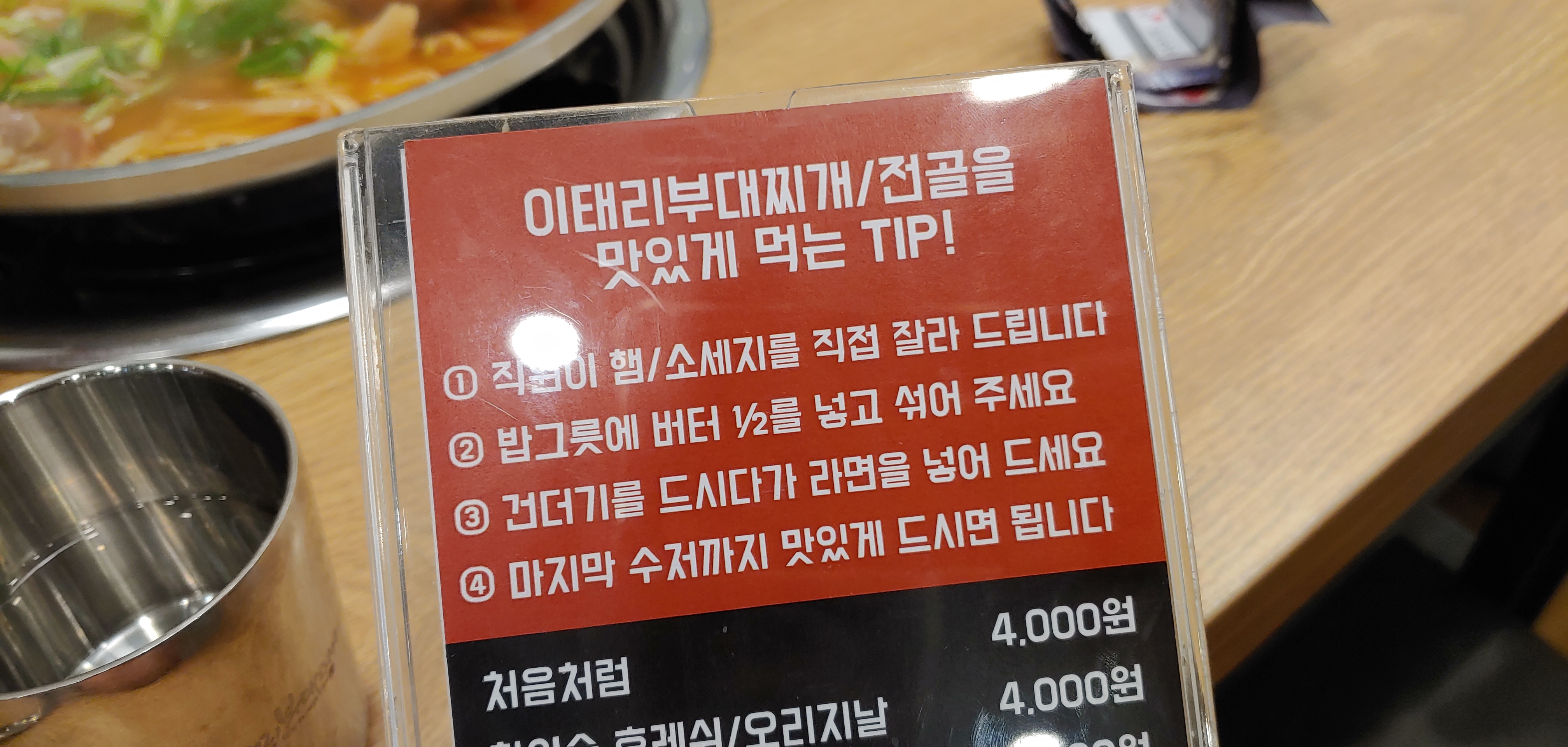 위와 같이 팁이 나와있었다. 버터를 원래 찌개에 넣는 것으로 알고 있었는데, 밥에 넣어 먹는 거였다. 1/2 이라고 나와있지만 테이블에는 2개가 있었고 또 무제한 코너에서 가져올 수 있다. 머 버터에 환장하지 않고서 얼마나 먹겠어 라는 생각이 들었다.