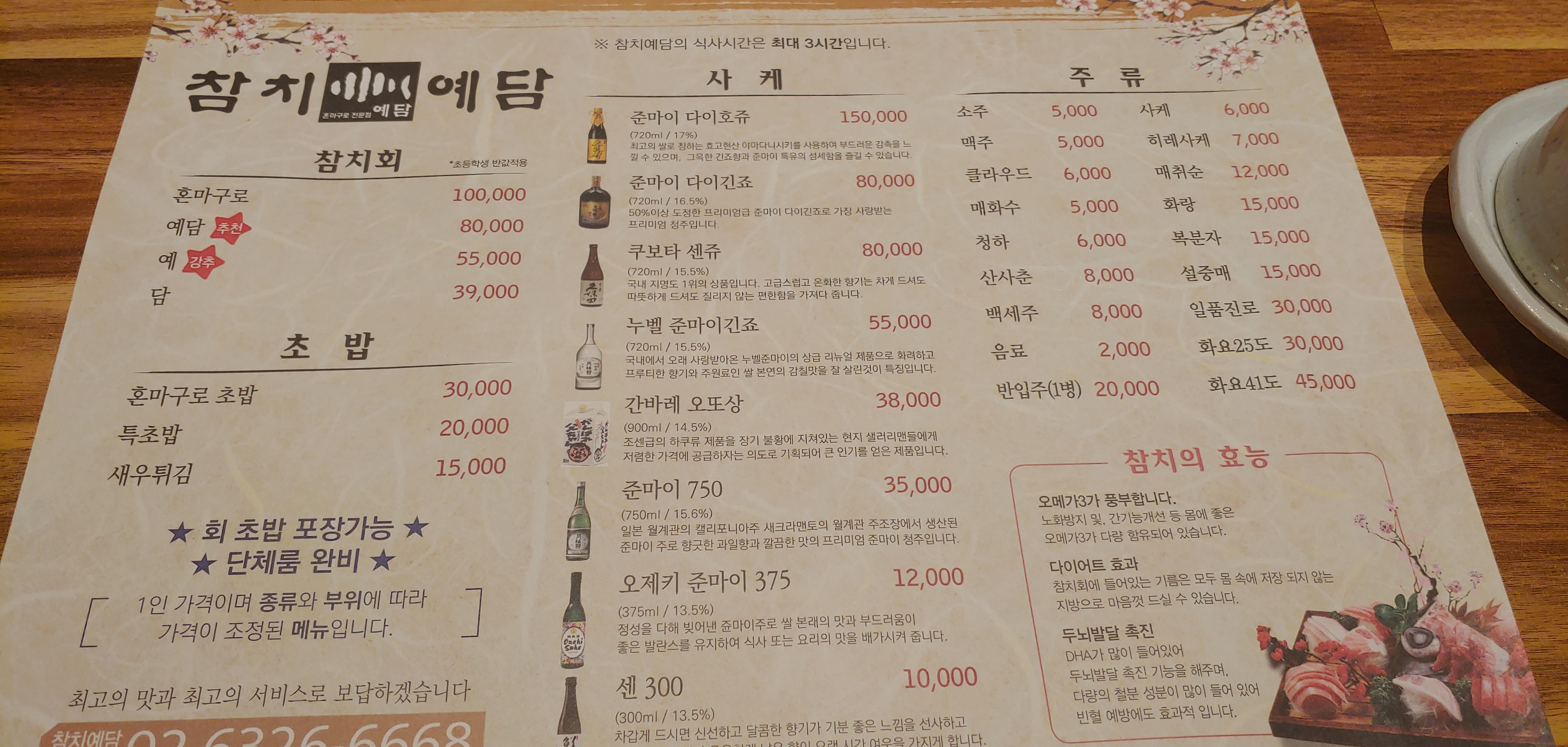 마음 같아서는 혼마구로도 먹고 예담도 먹고 싶은데 예? 5.5만원짜리도 충분하다고 생각했다. 아무리 사준다고 해도 내가 막 눈치 없이 비싼 것을 먹지는 않는다. 전화로 예약했는데 딱 2명만 들어가는 방을 잡아 줬다. 게다가 여기는 콜키지 2만원이라고 한다. 얼마 전 일본 출장에서 사온 것도 있고 그래서 돈 좀 써봤다~!