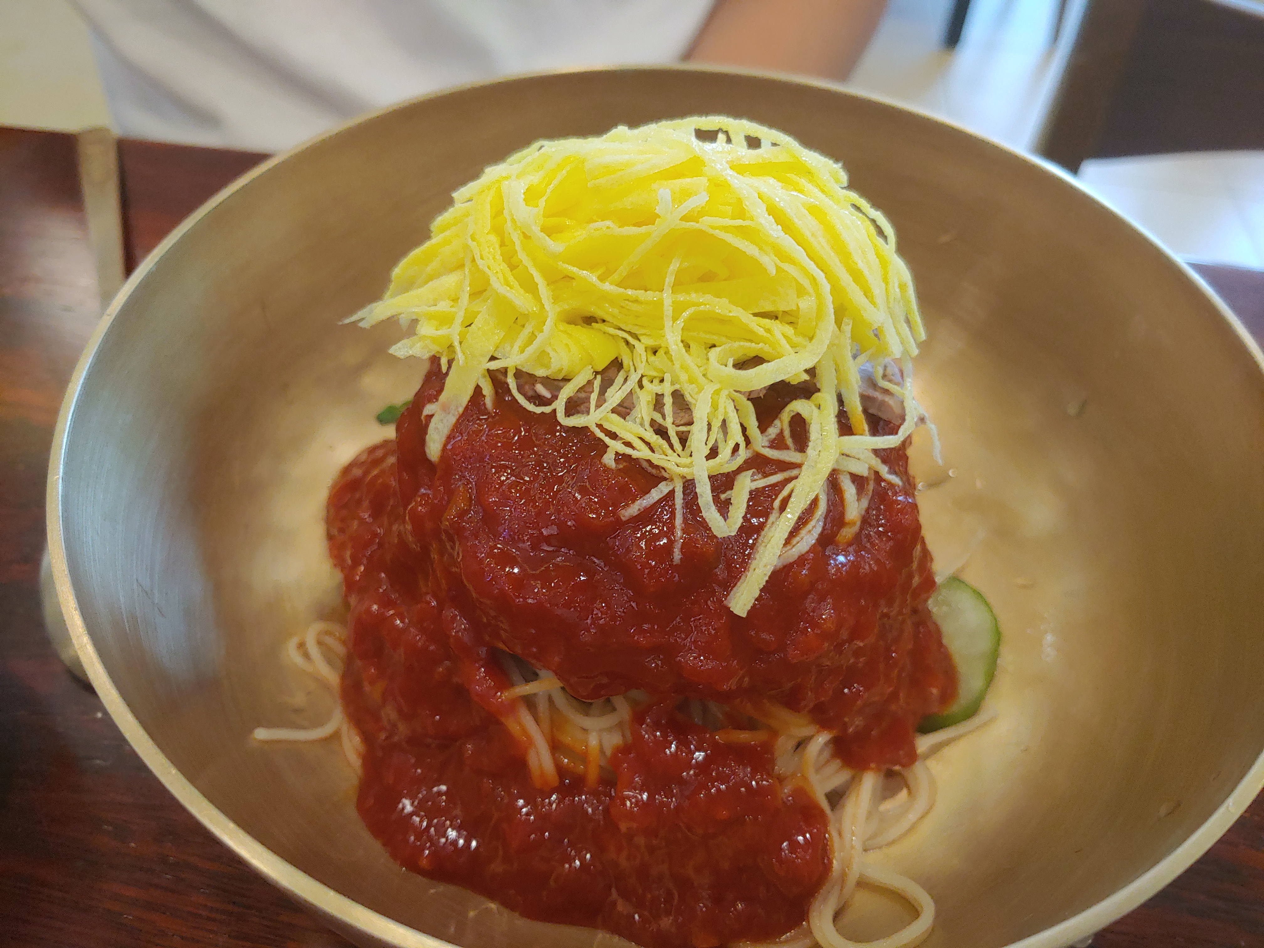 같이 가신 분 중에 한분이 비빔면으로 시키셔서 한 입정도 뺏어먹어봤는데, 평양 냉면은 비빔면의 차이가 먼지 느끼기 어려웠다. 그냥 어디서나 먹을 수 있는 비빔면이었다. 다만 면이 조금 다를 뿐이다.